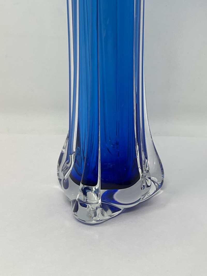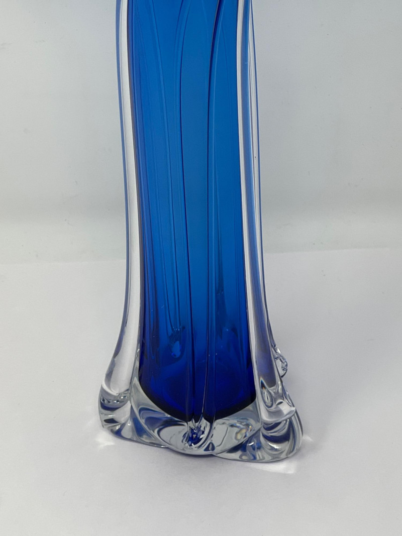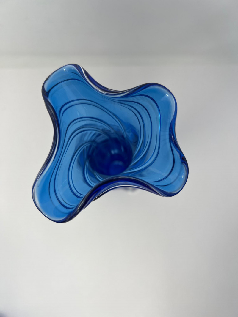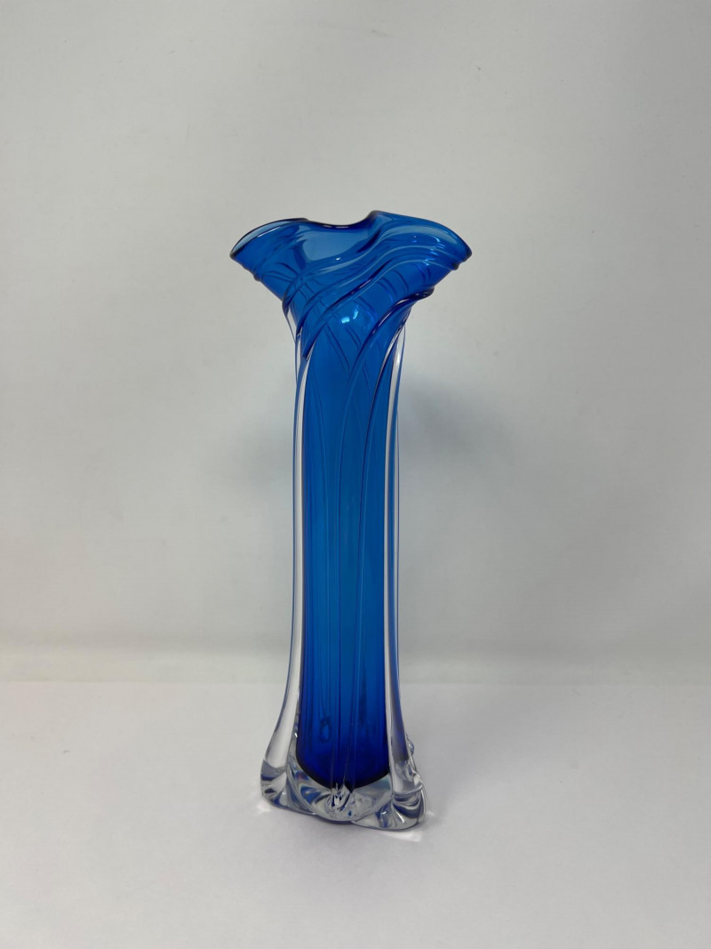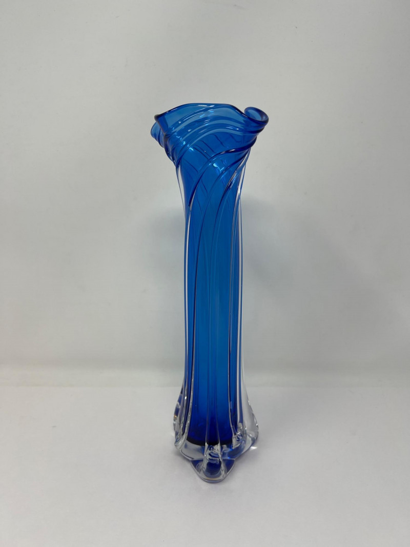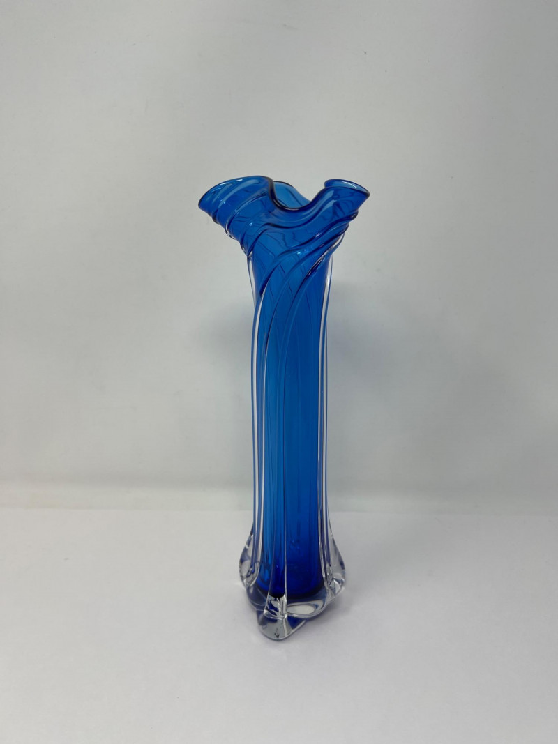 Hand-blown art glass vase by American glass artist Ed Branson, featuring a deep cobalt blue body with clear base and a flared, asymmetrical rim. The sculptural form and color gradient reflect Branson’s signature style from the early 1990s. Details: Artist: Ed Branson Material: Hand-blown glass Signature: Etched on base A striking example of contemporary studio glass, suitable for collectors or display in modern interiors. Number etched on base appears to be an artist style number and not the year. The vase is similar in style to those created by Branson in the 1990s. Friendly Reminder: This auction will start closing at 6:30pm on Tuesday, August 12th