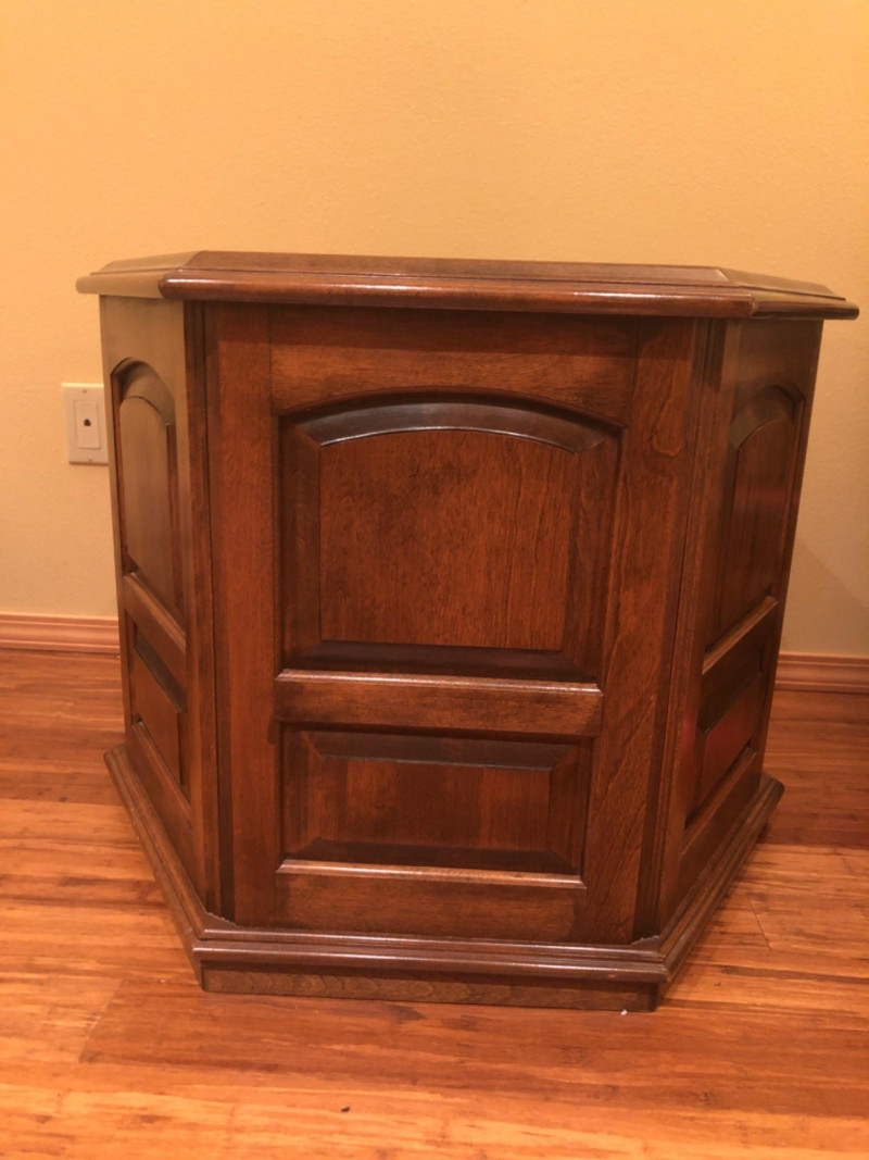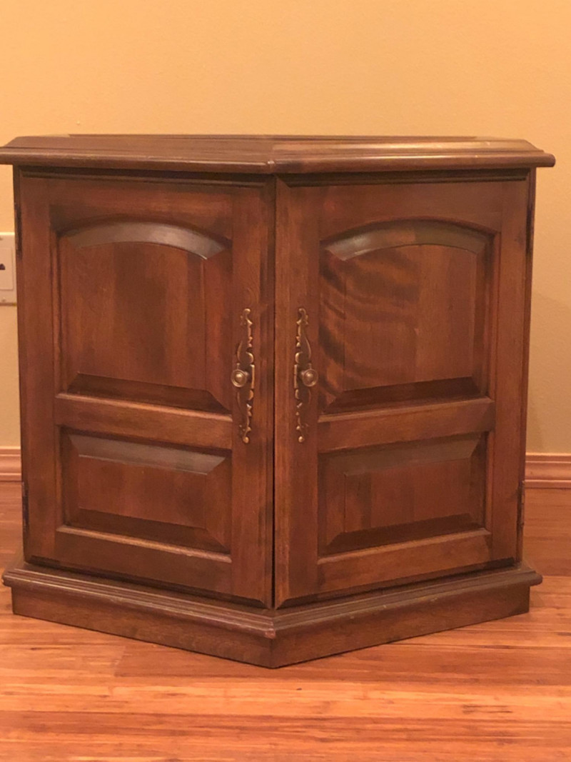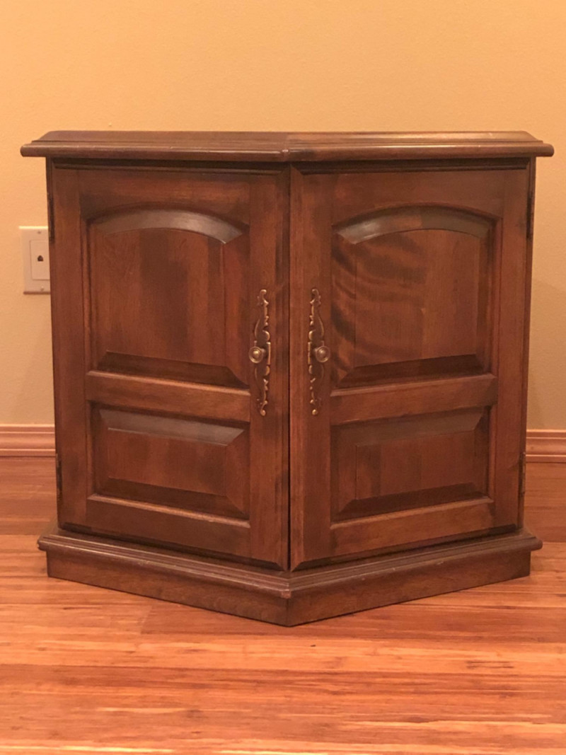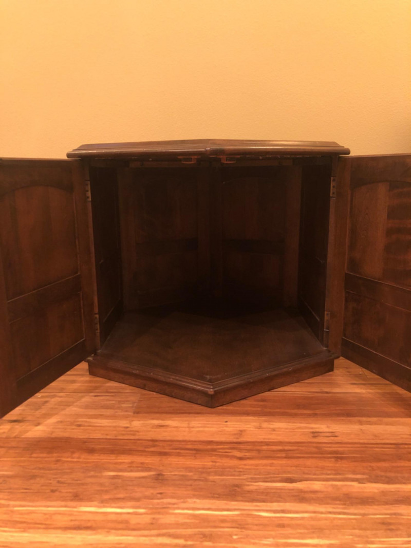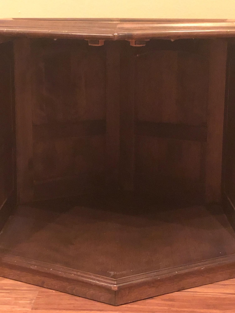 Striking hexagonal wood end table by Ethan Allen in classic mid-century design. Retro charm with enduring quality craftsmanship. Ample storage with double hinged doors. Bidding on this lot is an agreement that: (1.) You will have 2 capable, able-bodied persons to lift and load at a minimum. (2.) You
