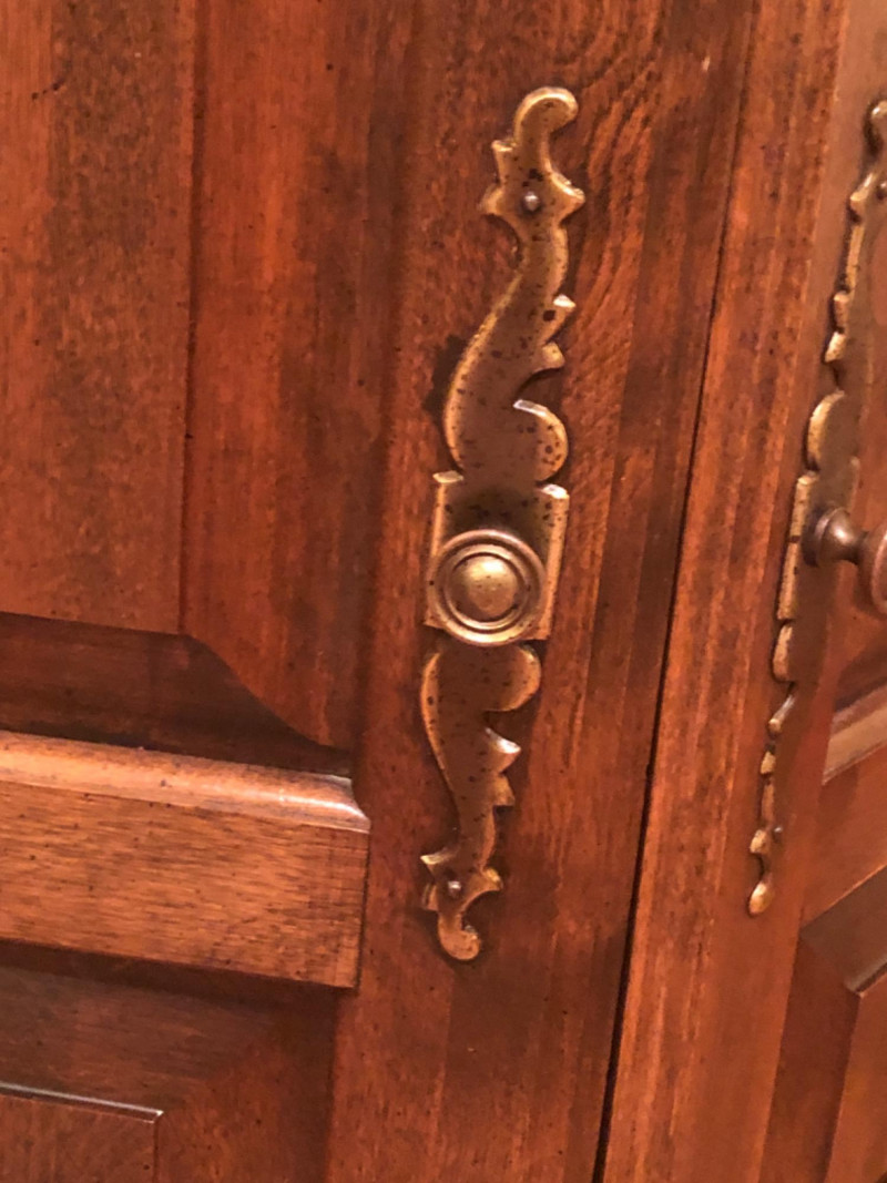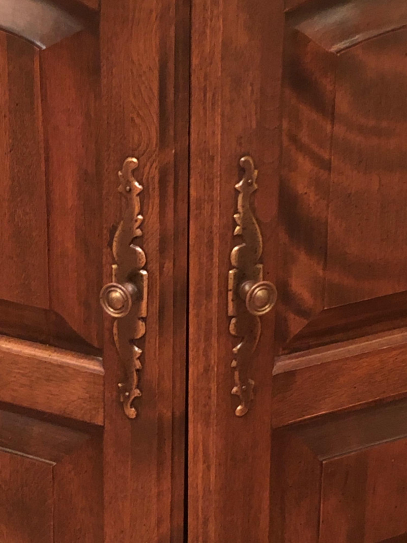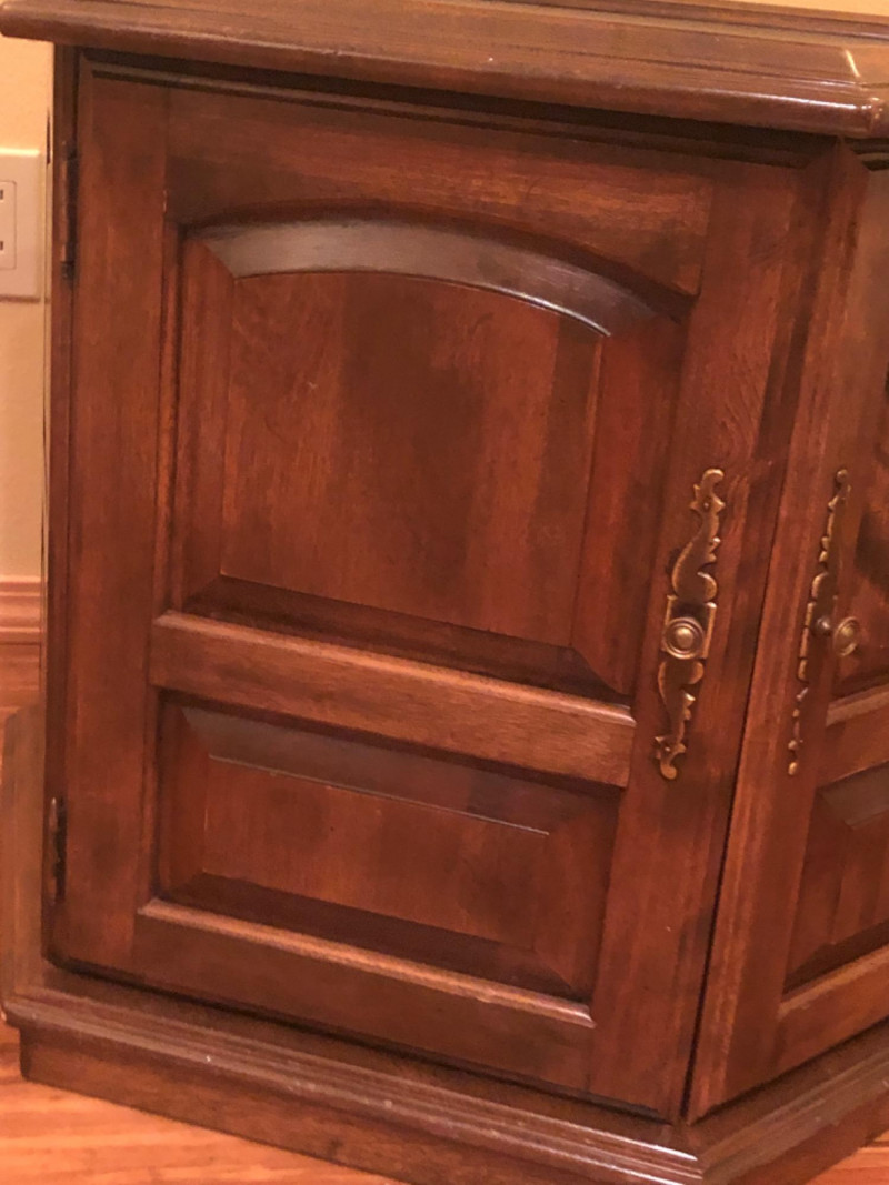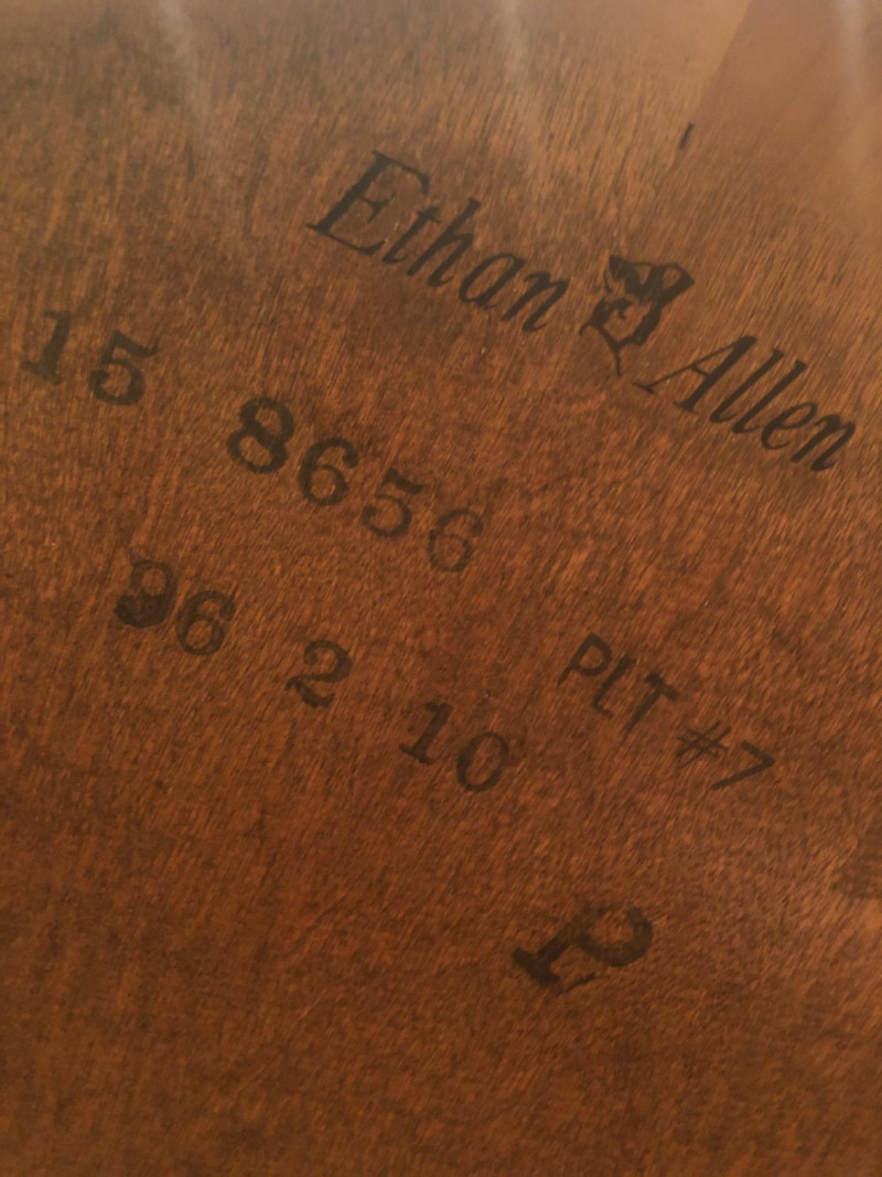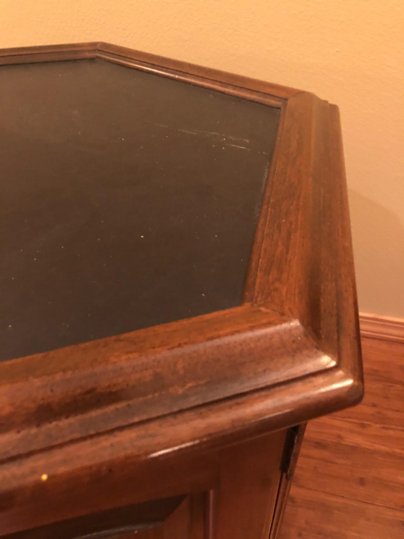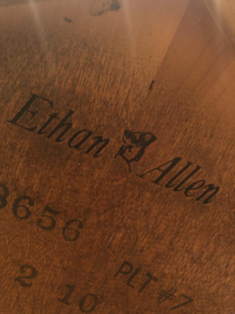 Striking hexagonal wood end table by Ethan Allen in classic mid-century design. Retro charm with enduring quality craftsmanship. Ample storage with double hinged doors. Bidding on this lot is an agreement that: (1.) You will have 2 capable, able-bodied persons to lift and load at a minimum. (2.) You