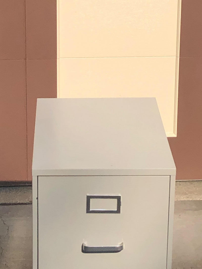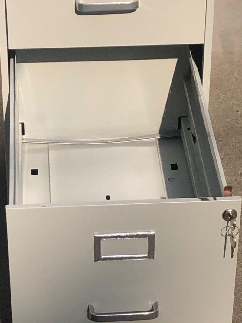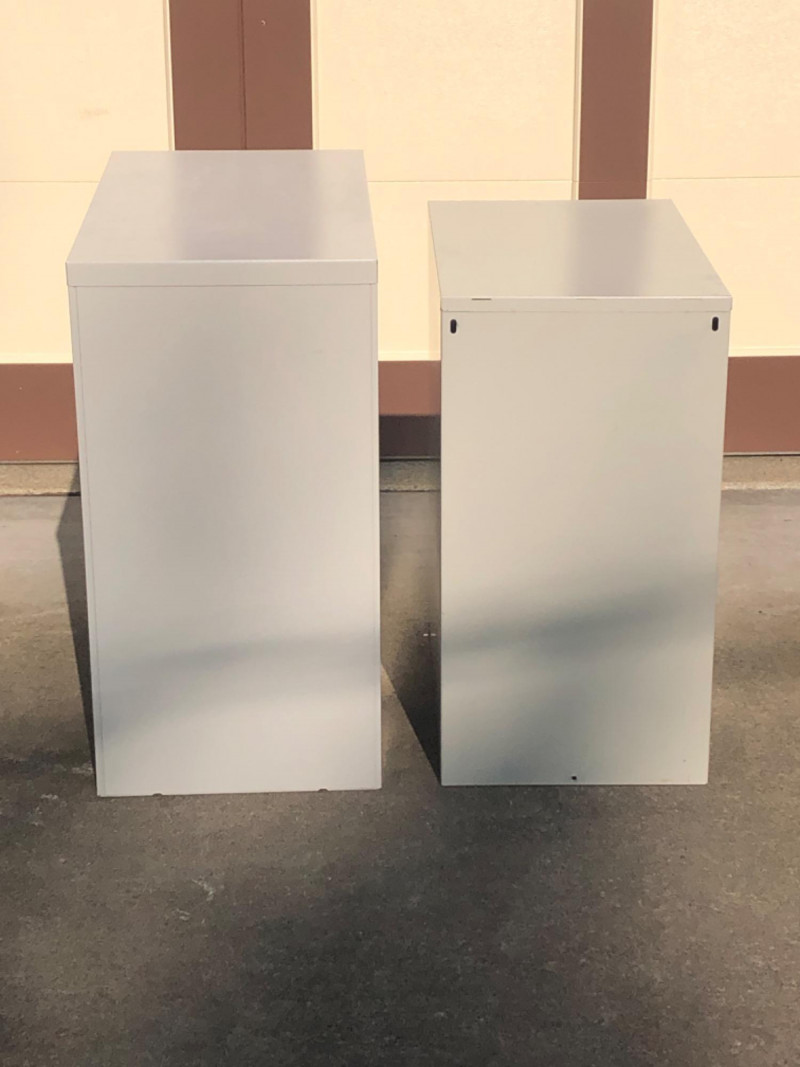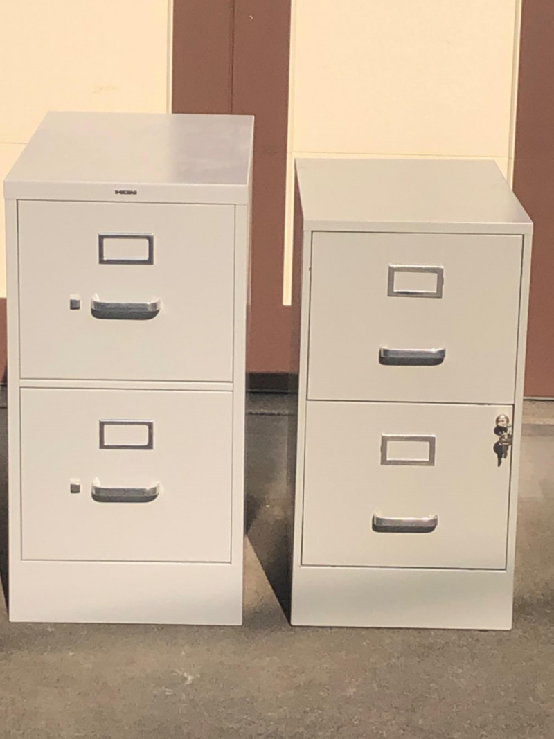 Set of two vintage-style metal file cabinets, each with two drawers, label slots, and sturdy handles. Practical and durable, these office staples offer ample document storage and work well in professional, home, or garage settings. Dimensions: one cabinet is 29" height x 26" depth x 15" width; the other is 27" height x 22" depth x 14.5" width. Friendly Reminder: This auction will start closing at 6:30pm on Tuesday, August 12th