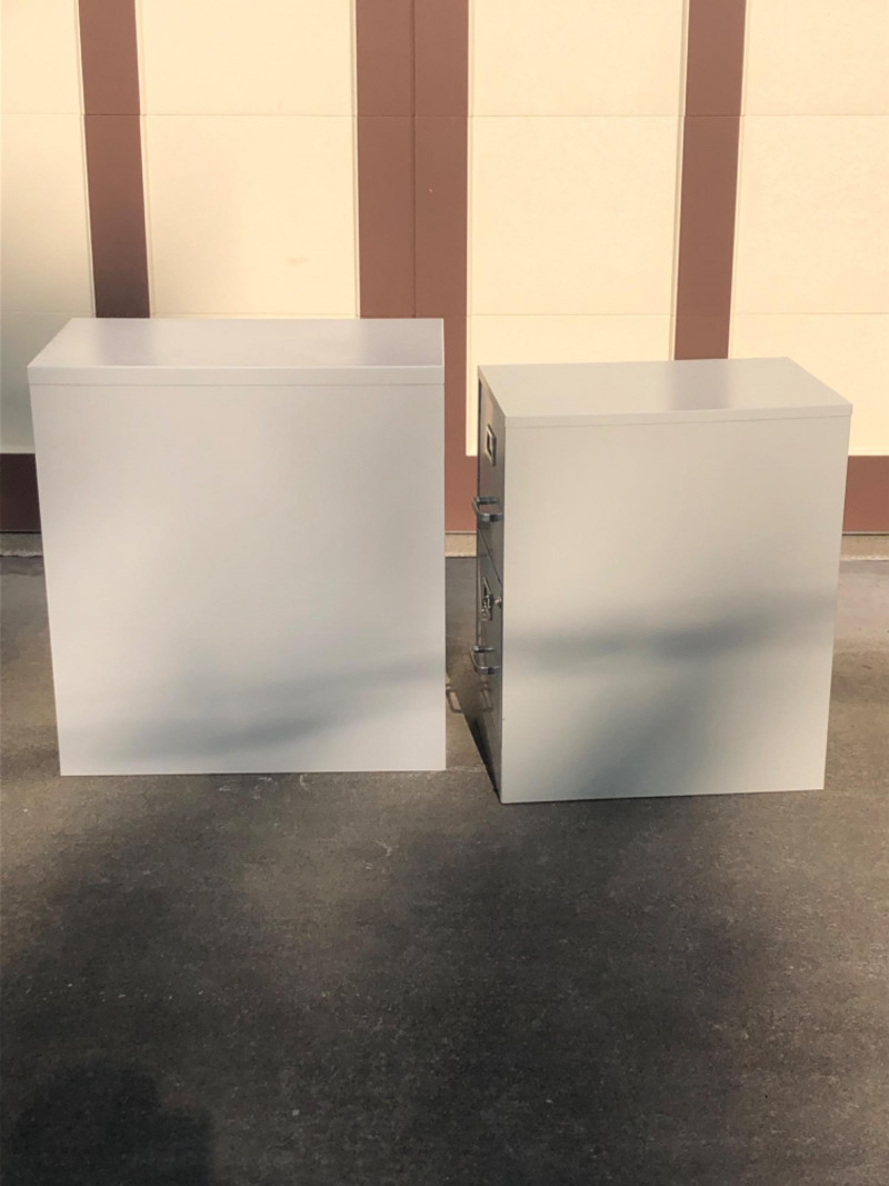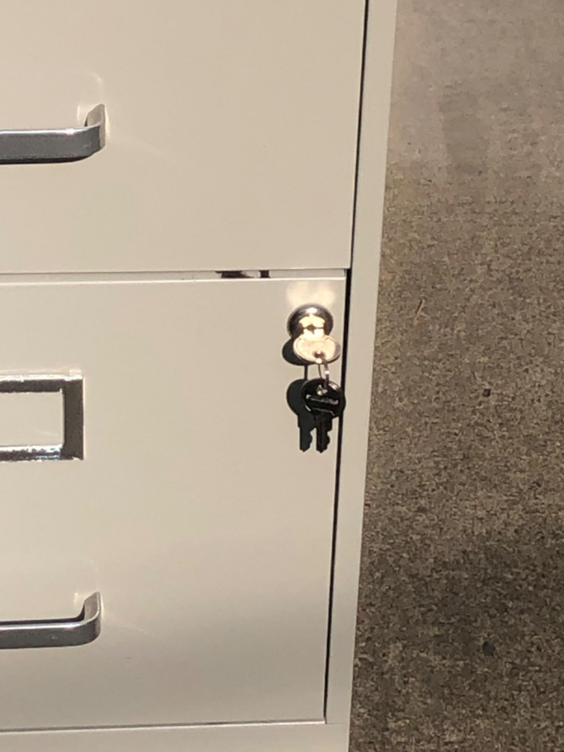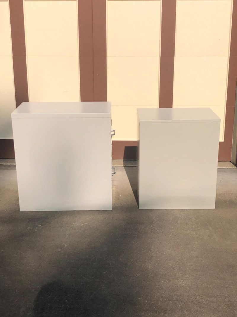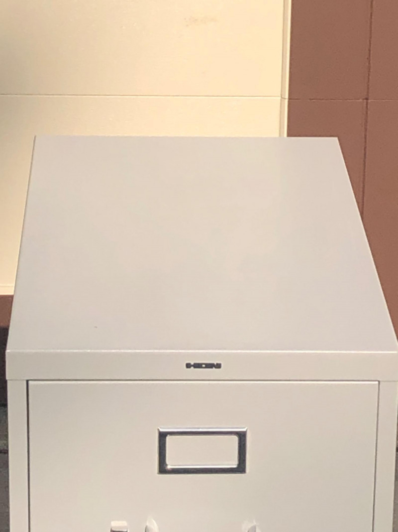 Set of two vintage-style metal file cabinets, each with two drawers, label slots, and sturdy handles. Practical and durable, these office staples offer ample document storage and work well in professional, home, or garage settings. Dimensions: one cabinet is 29" height x 26" depth x 15" width; the other is 27" height x 22" depth x 14.5" width. Friendly Reminder: This auction will start closing at 6:30pm on Tuesday, August 12th