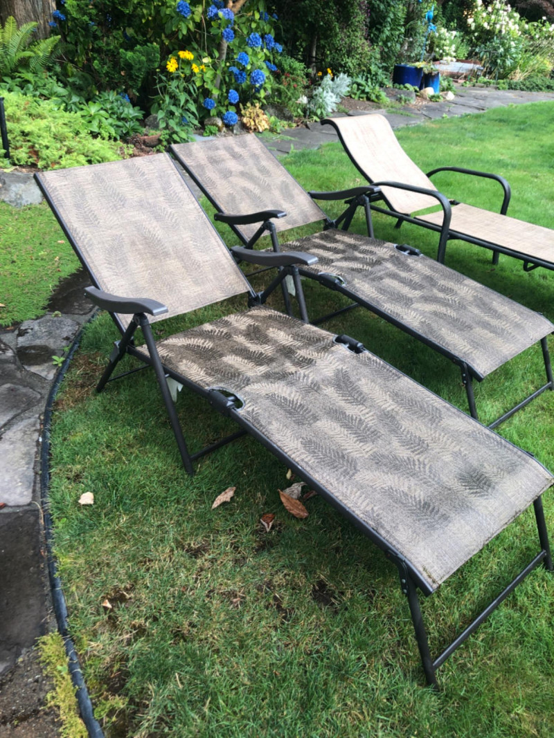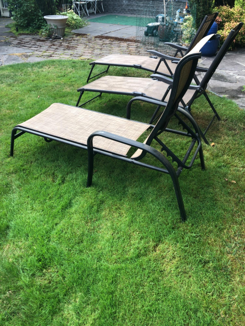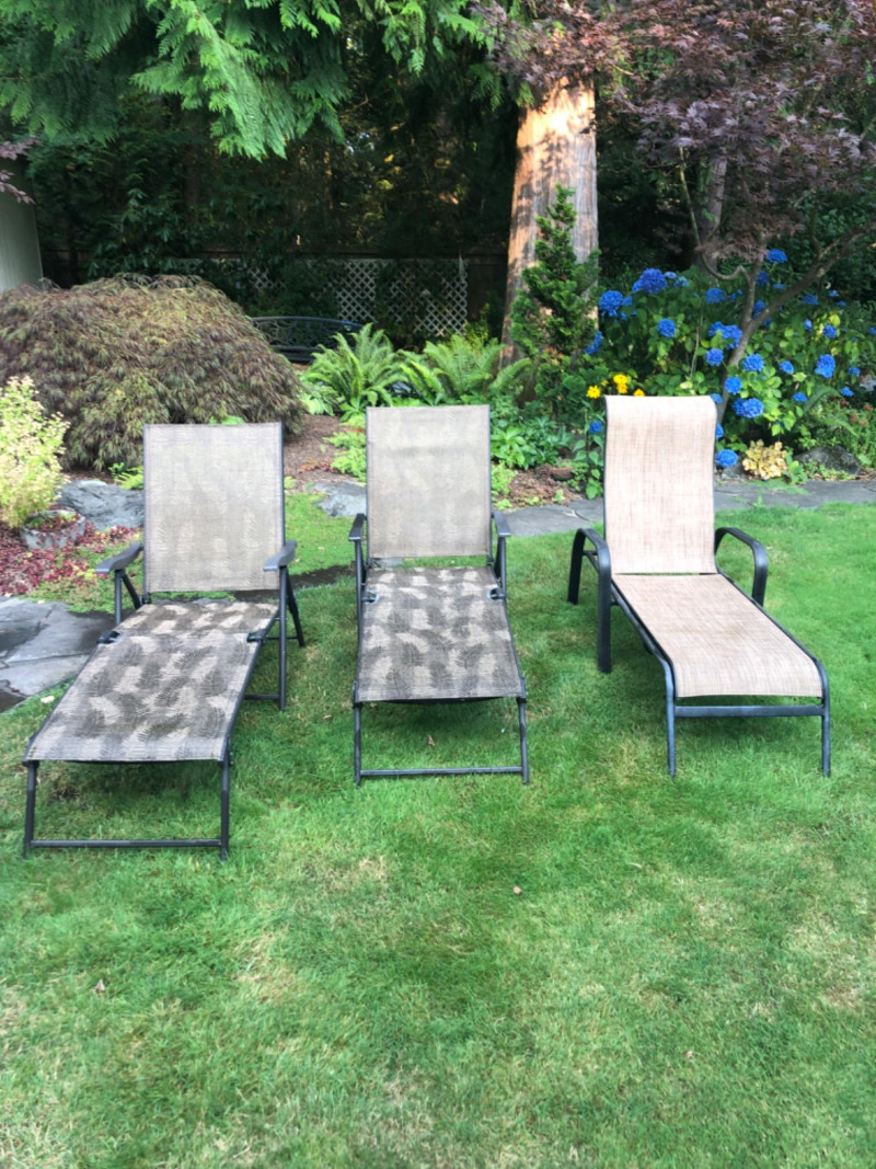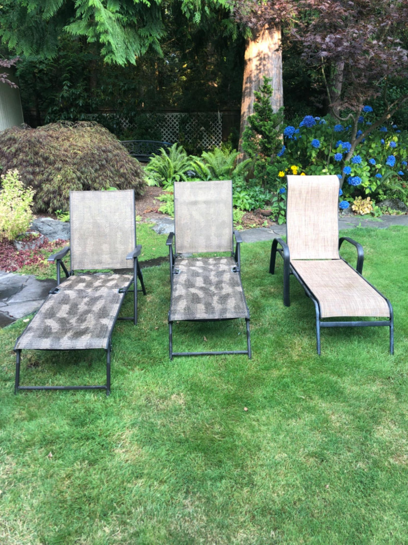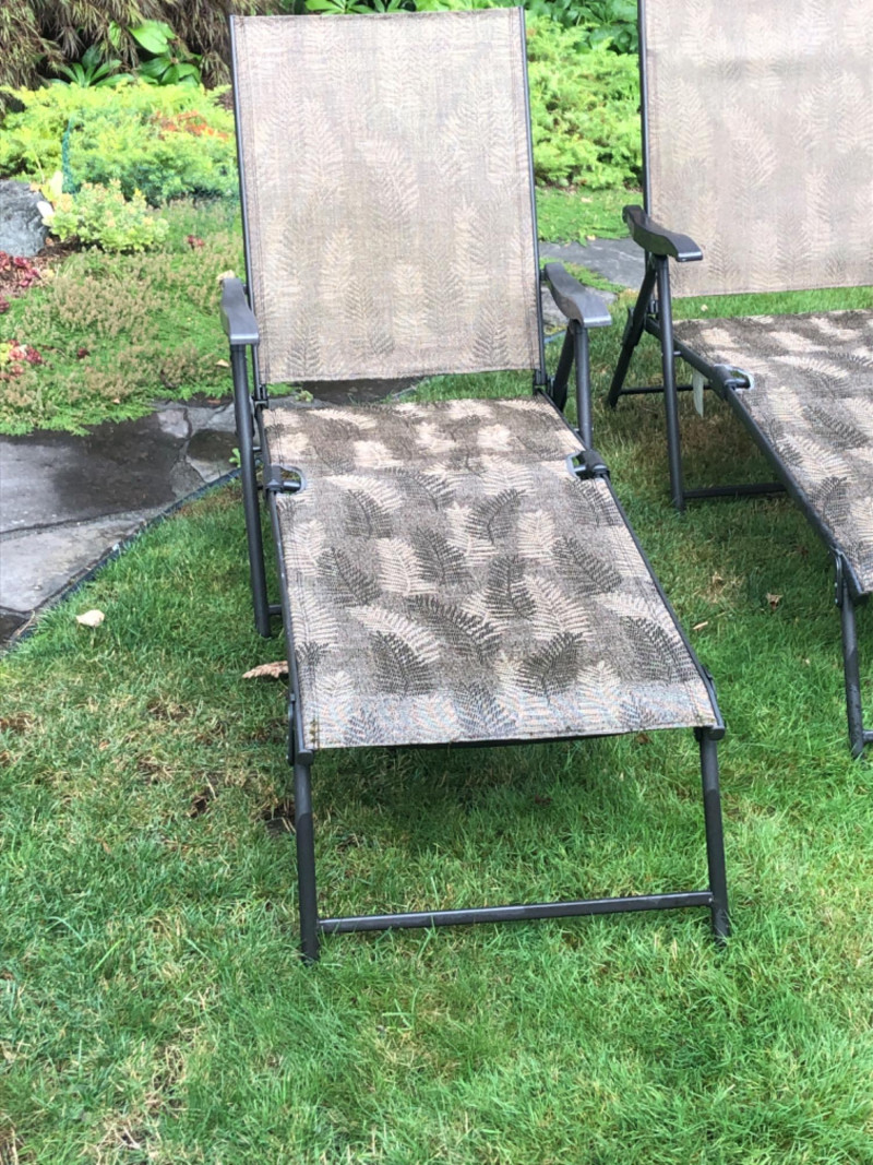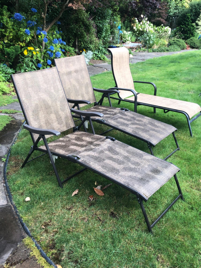 Trio of reclining patio lounge chairs with adjustable backrests and sling-style frames. Designed for outdoor comfort with breathable fabric stretched across lightweight metal bodies. Perfect for poolside, deck, or garden lounging. Each is made with a mesh/fabric style material with a metal frame and metal legs. The backs are adjustable on each to recline back or move forward. 2 of the chairs completely collapse for storage. Dimensions: Friendly Reminder: This auction will start closing at 6:30pm on Tuesday, August 12th