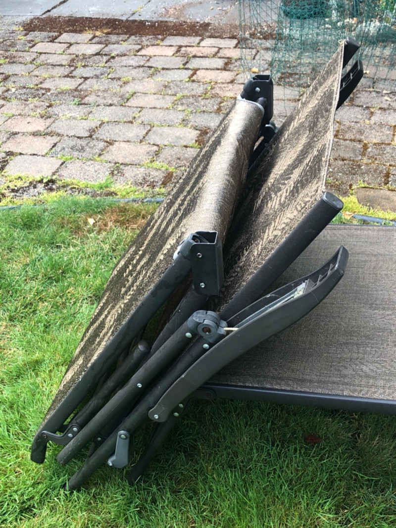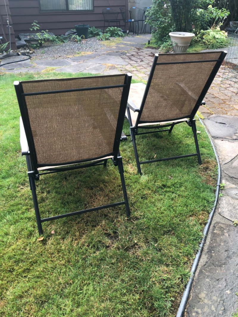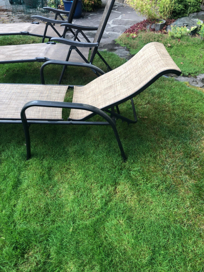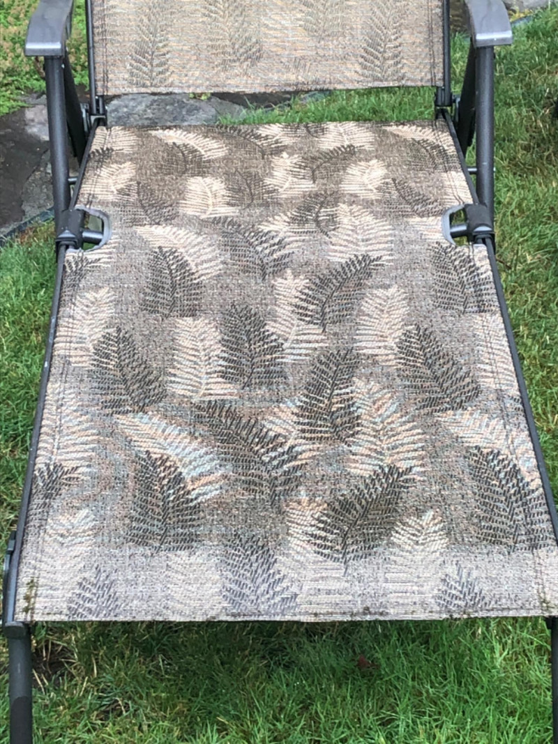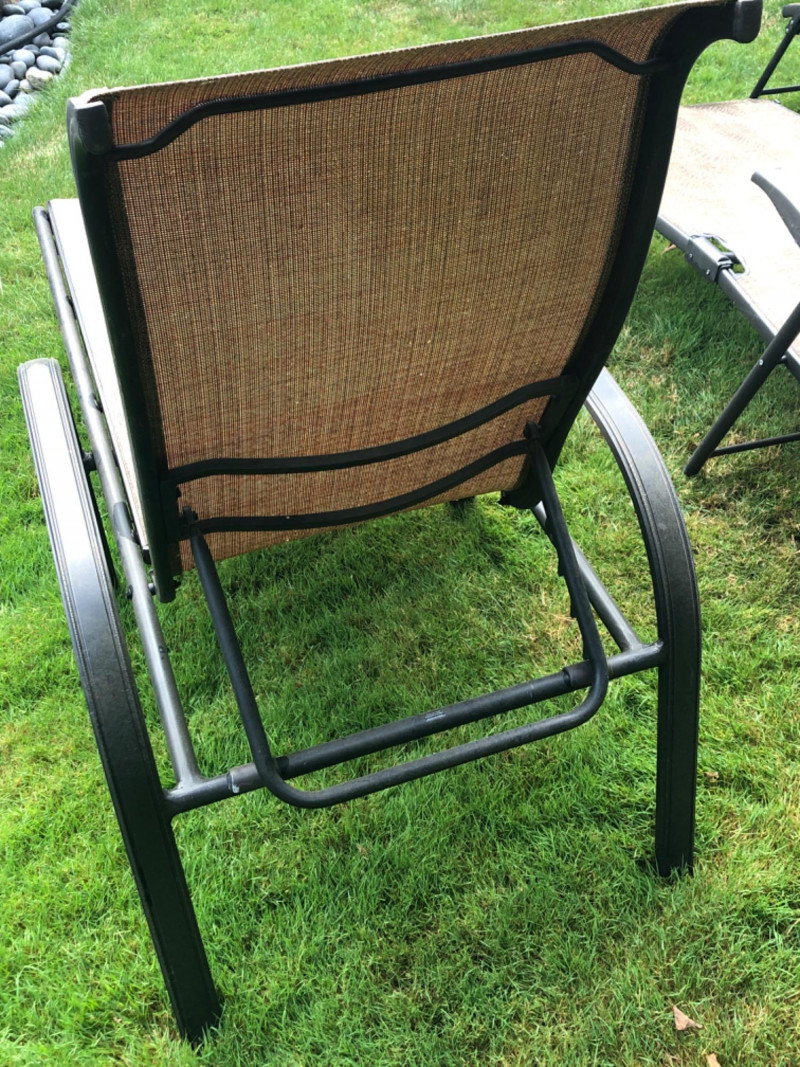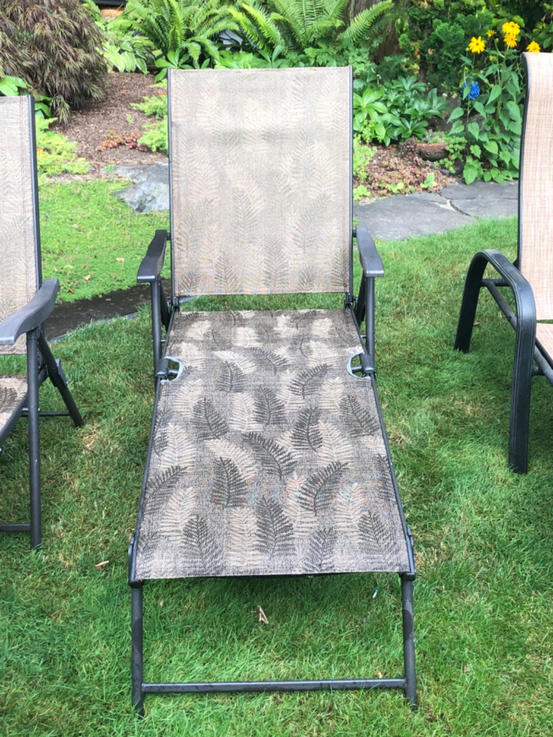 Trio of reclining patio lounge chairs with adjustable backrests and sling-style frames. Designed for outdoor comfort with breathable fabric stretched across lightweight metal bodies. Perfect for poolside, deck, or garden lounging. Each is made with a mesh/fabric style material with a metal frame and metal legs. The backs are adjustable on each to recline back or move forward. 2 of the chairs completely collapse for storage. Dimensions: Friendly Reminder: This auction will start closing at 6:30pm on Tuesday, August 12th