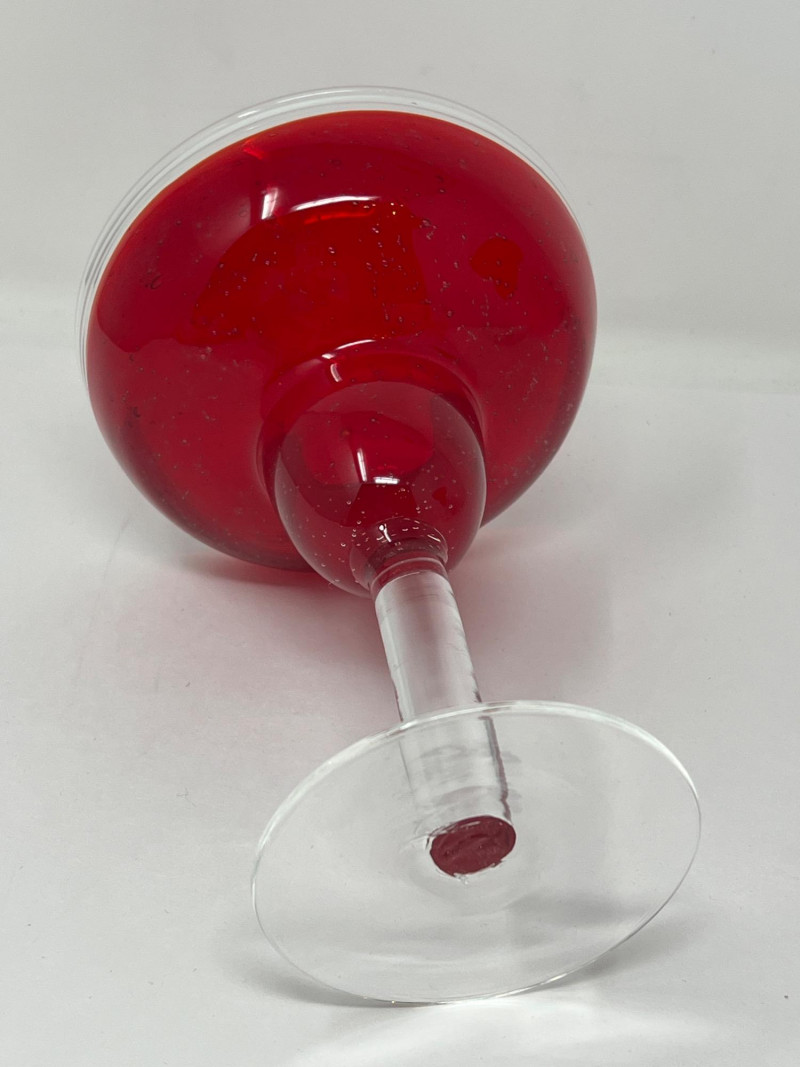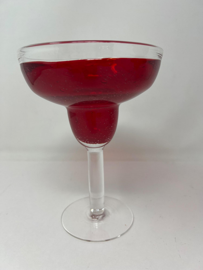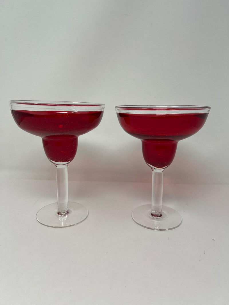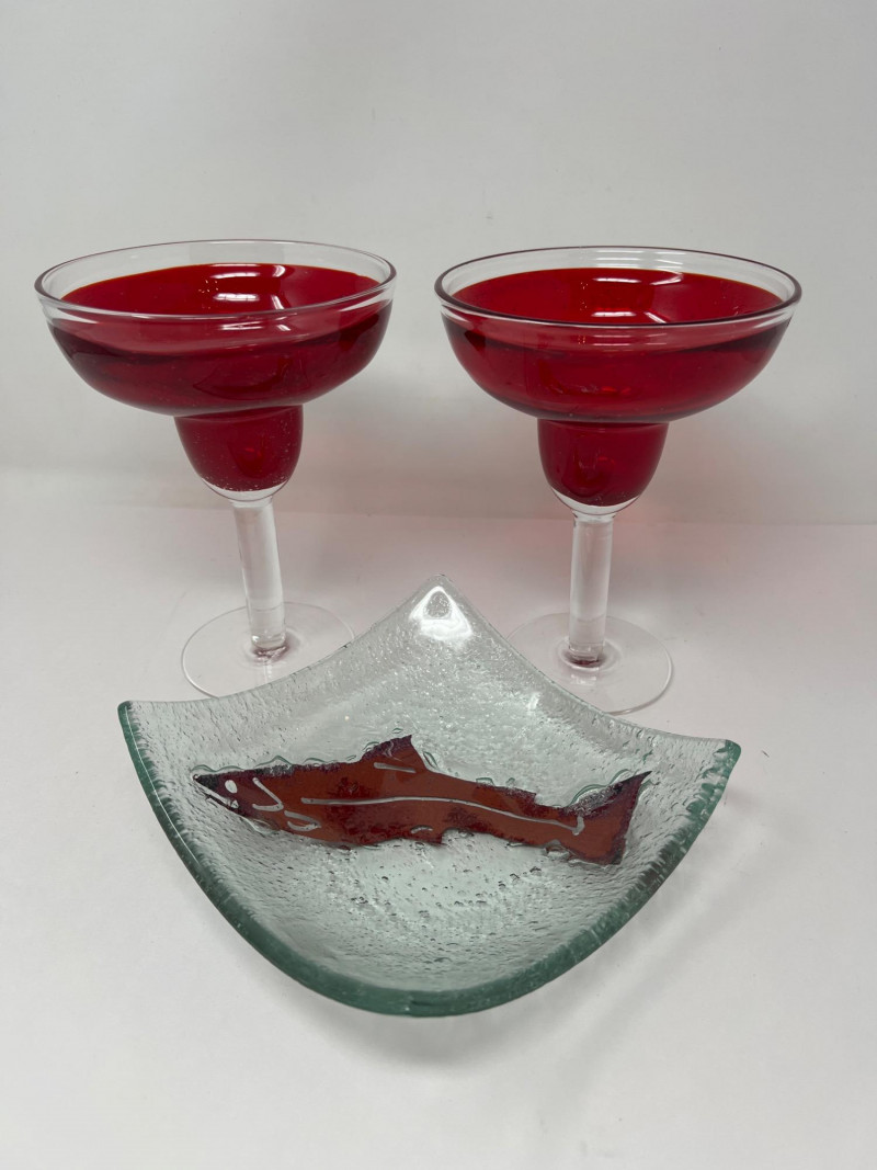 Artisan handblown glass margarita stems featuring vibrant swirled bases paired with a whimsical glass fish-motif serving dish shaped with upward corners to create a bowl effect. Rich in tropical hues and playful charm, ideal for festive dining or art glass display. Margarita glasses are 7 inches height and 5 1/2 inches diameter Fish motif glass dish - 6 1/2 inches wide x 6 3/4 inches wide (8 1/2 inches from point to point). Friendly Reminder: This auction will start closing at 6:30pm on Tuesday, August 12th