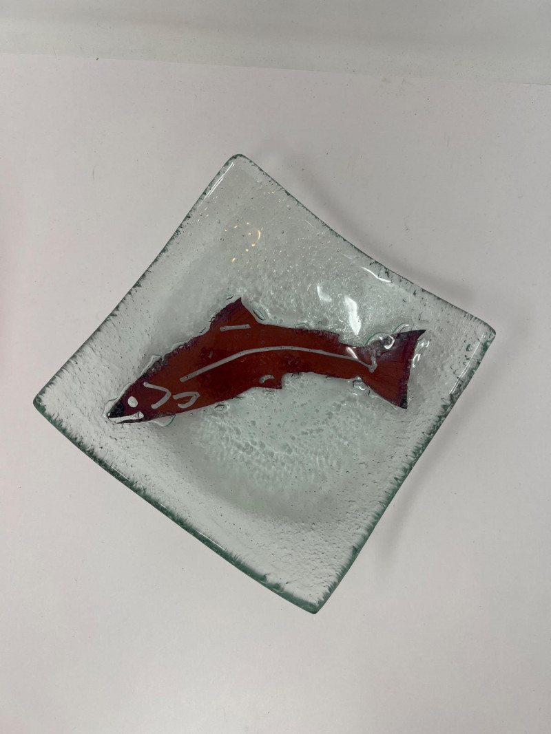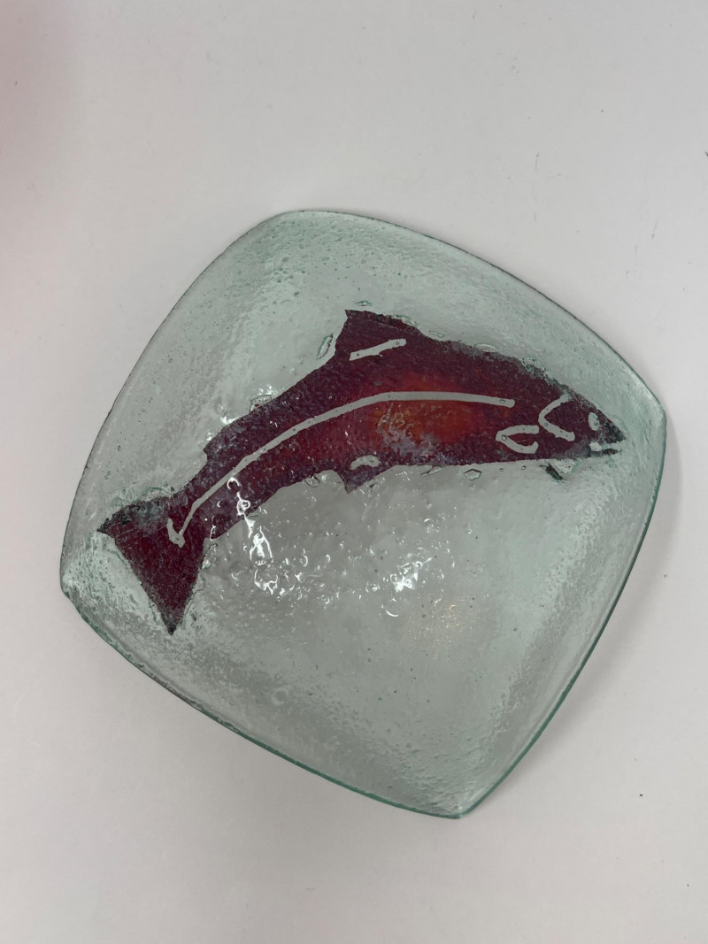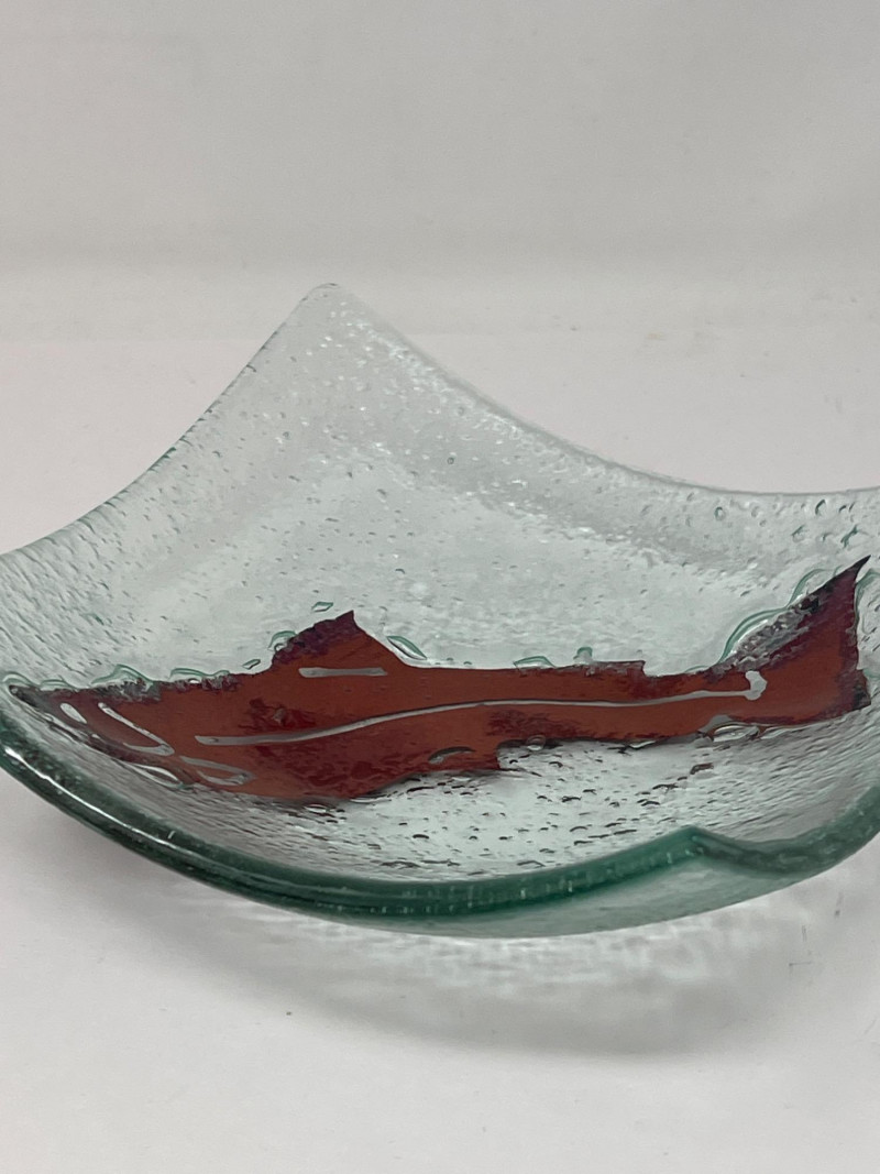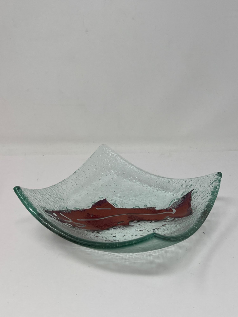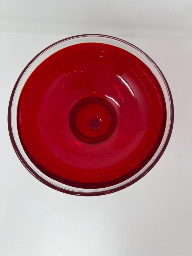 Artisan handblown glass margarita stems featuring vibrant swirled bases paired with a whimsical glass fish-motif serving dish shaped with upward corners to create a bowl effect. Rich in tropical hues and playful charm, ideal for festive dining or art glass display. Margarita glasses are 7 inches height and 5 1/2 inches diameter Fish motif glass dish - 6 1/2 inches wide x 6 3/4 inches wide (8 1/2 inches from point to point). Friendly Reminder: This auction will start closing at 6:30pm on Tuesday, August 12th