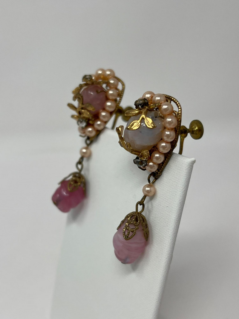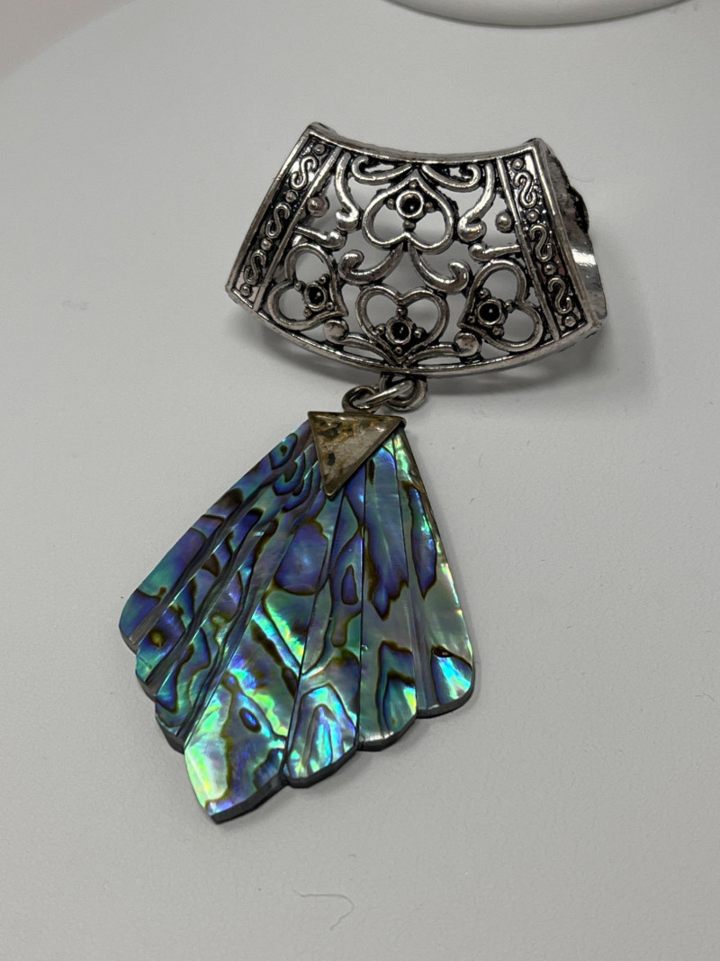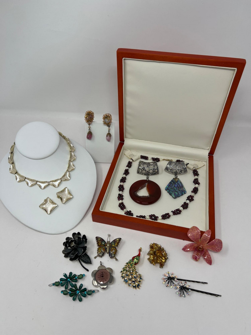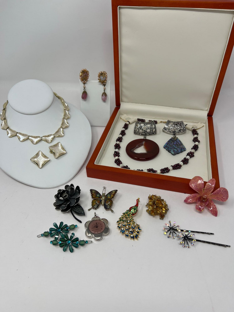 A curated selection of vintage fashion jewelry pieces showcasing varied materials, styles, and colors. Includes classic costume necklaces, earrings, brooches, and barrettes. Pieces may feature glass beads, enamel work, faux pearls, gold- and silver-tone finishes, and mid-century styling. Ideal for collectors, stylists, or crafters looking to repurpose with character.Each item displays signs of age and wear consistent with vintage fashion accessories. Some items included: Agate and crystalline scarf ring, abalone scarf ring, Jerry Berry pendant clock (needs new battery), colorful peacock multi-colored stone pin, unique antique screwback earrings and more. Friendly Reminder: This auction will start closing at 6:30pm on Tuesday, August 12th