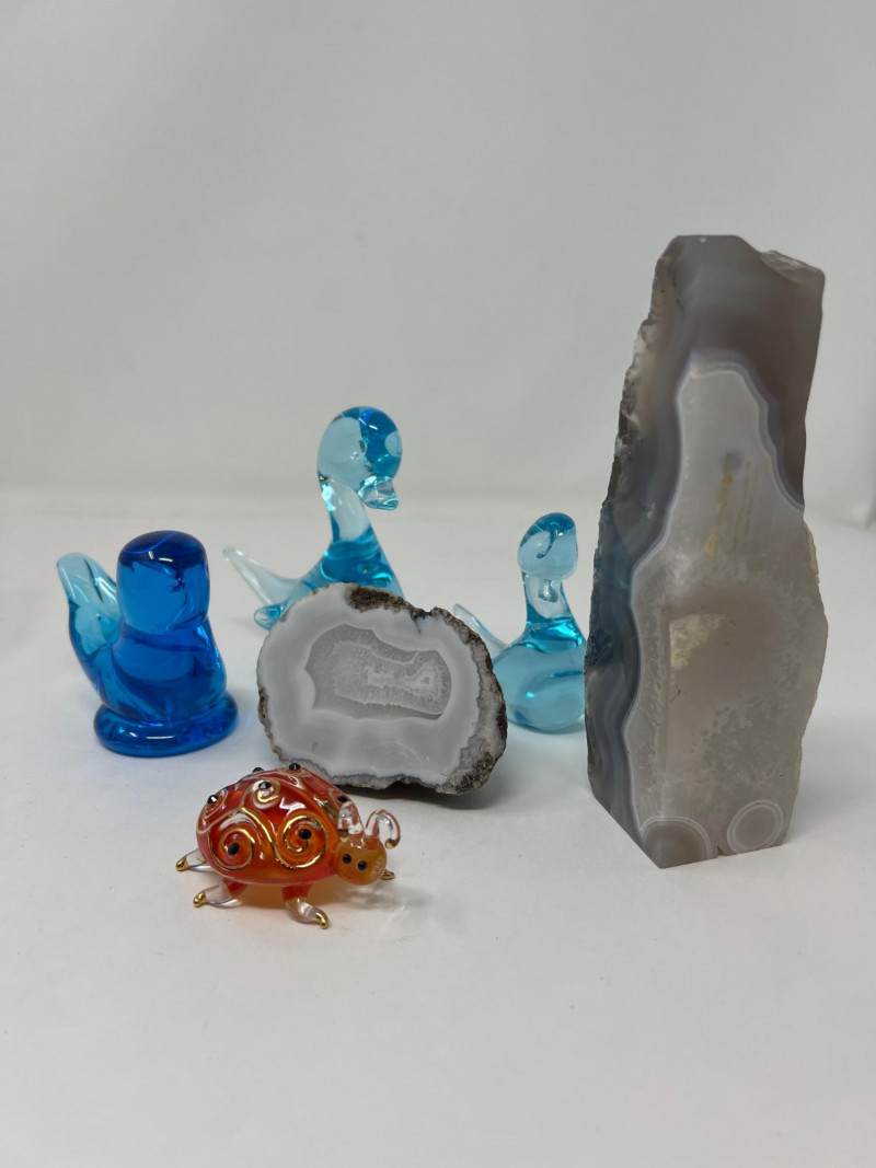 A thoughtfully curated blend of artistry and earth featuring handcrafted glass figurines alongside naturally formed stones. This lot includes: Friendly Reminder: This auction will start closing at 6:30pm on Tuesday, August 12th