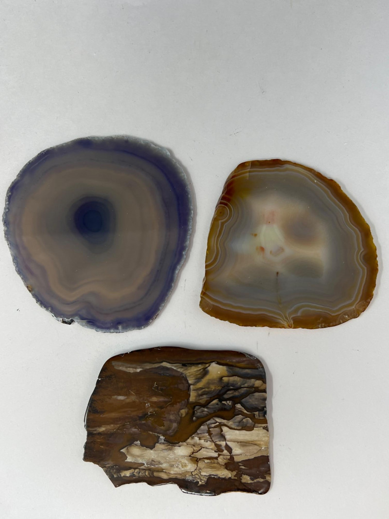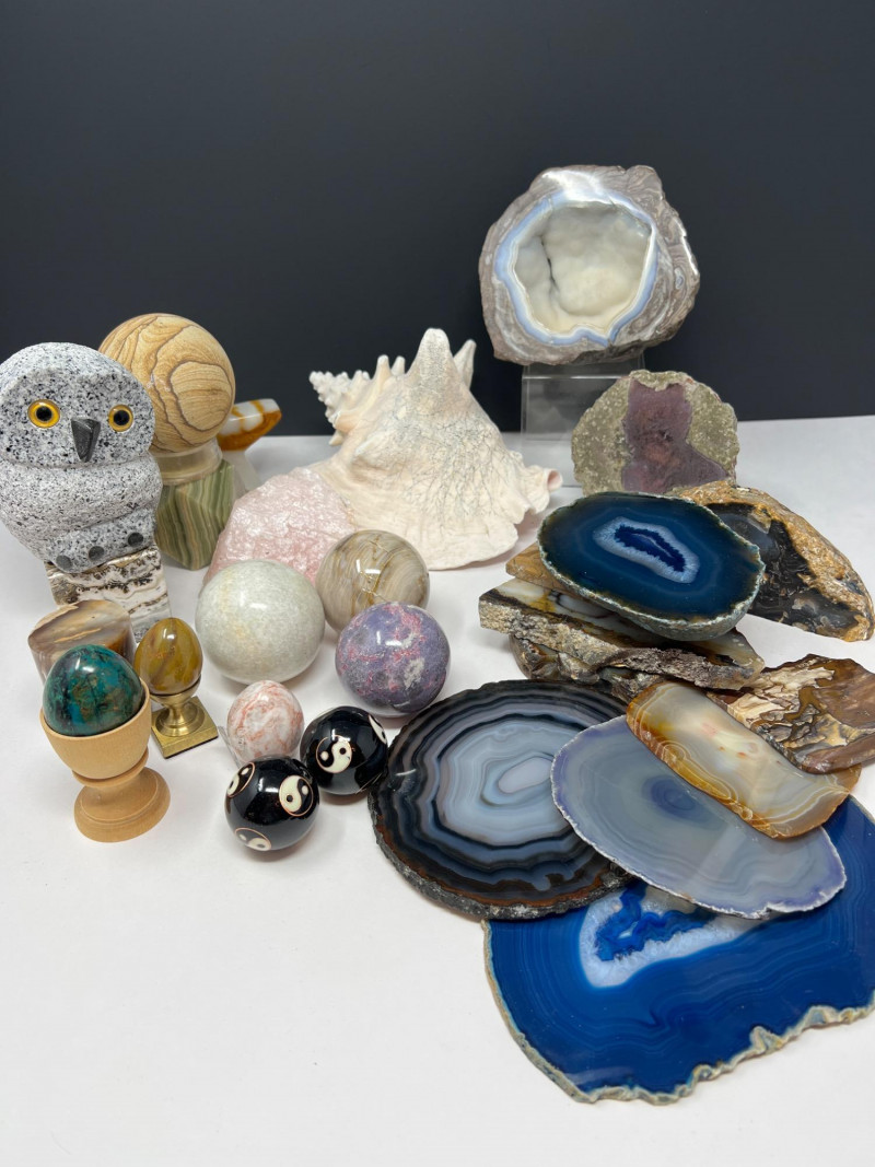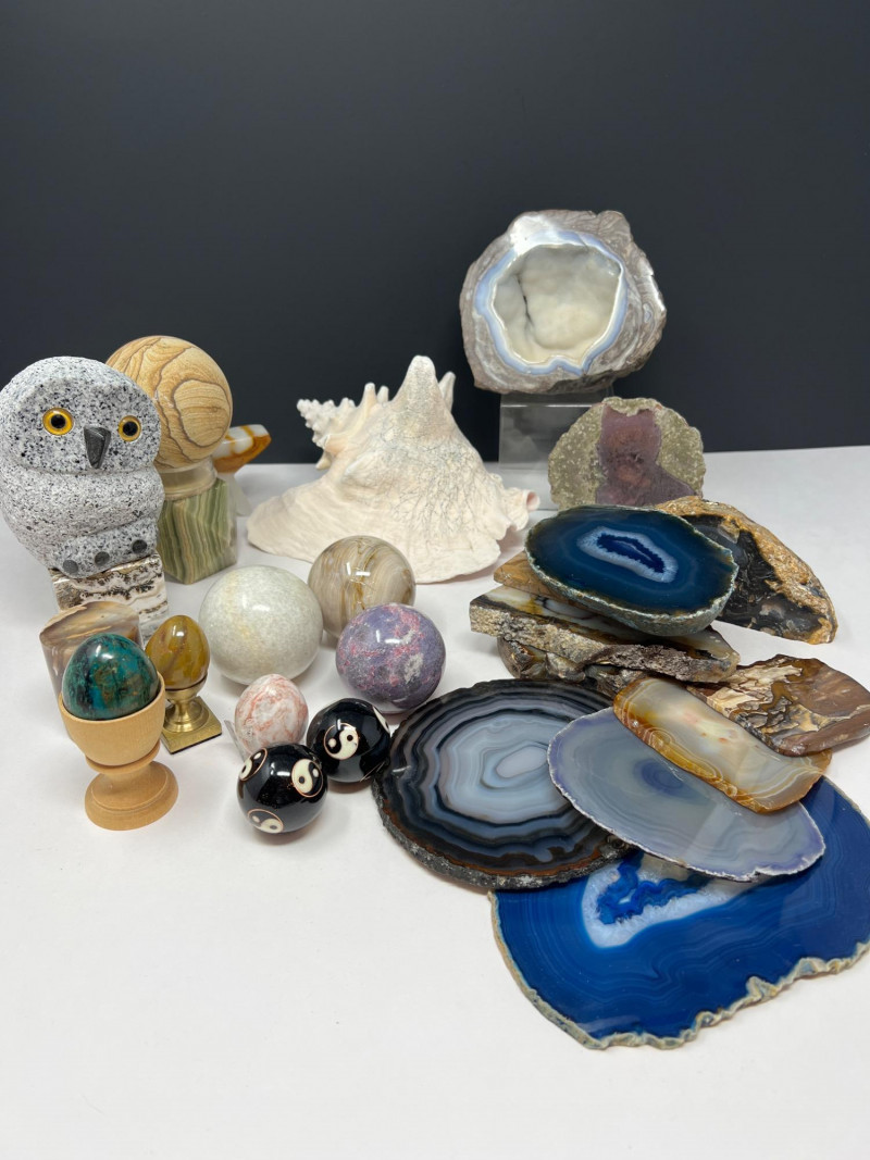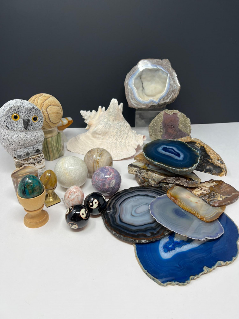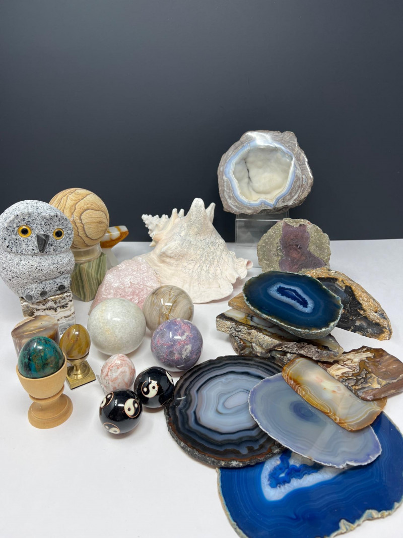 A curated collection of natural wonders and sculptural accents, perfect for display, meditation, or garden décor. Includes: Marble Orbs & Eggs Polished stone spheres in varied tones and sizes (approx. 3–6") Ideal for tactile display or metaphysical use Agate Slices & Geodes Irregular polished agate slabs with vibrant banding Natural geode fragments showcasing crystalline interiors Conch Shell Coastal accent with natural ridges and pink interior Solid Owl Sculpture Crafted from cement or natural stone Measures approx. 6" H × 4" W Stylized form with rustic texture This elemental mix evokes the serenity of nature and the mystery of the earth’s interior. A striking addition to any shelf, garden nook, or collector’s cabinet. Friendly Reminder: This auction will start closing at 6:30pm on Tuesday, August 12th
