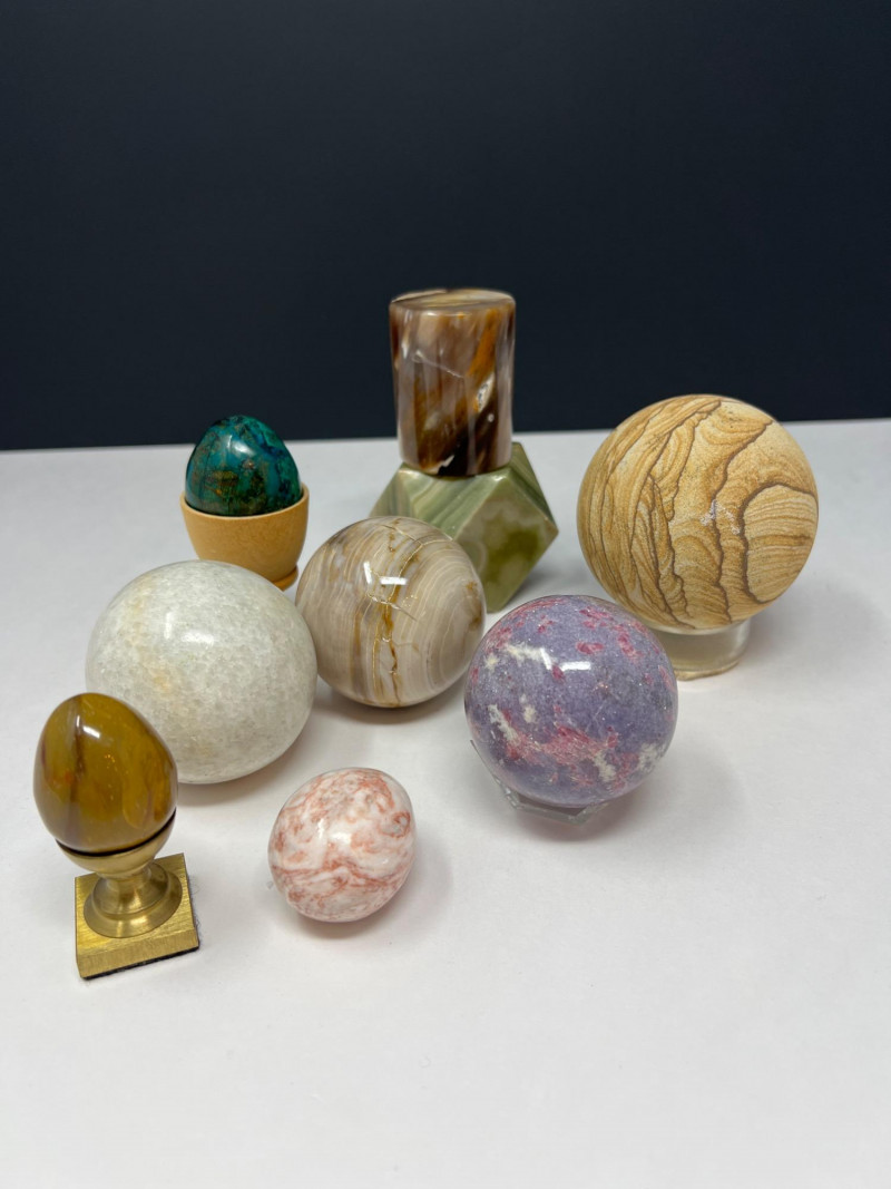 Lot # 238 - Earth Elements Collection:Marble Orbs, Geodes/Agate Slices & Stone Owl