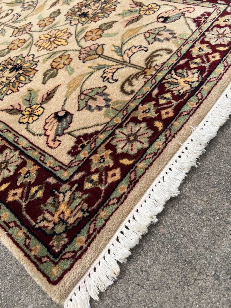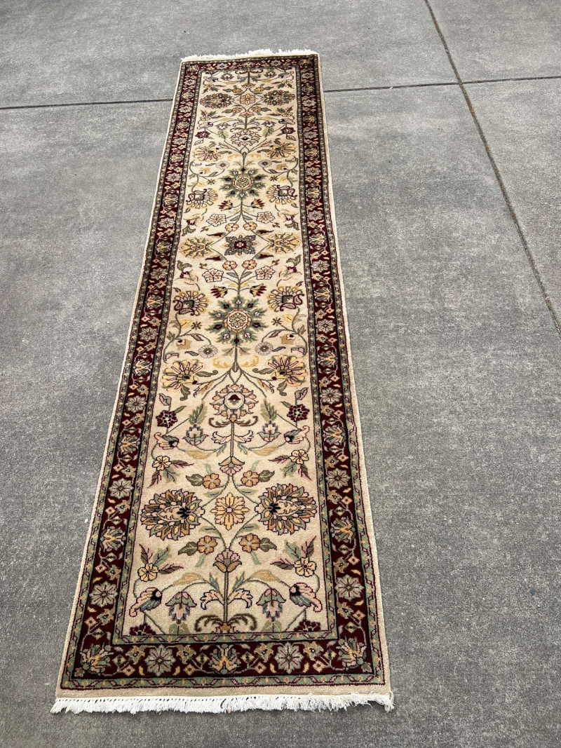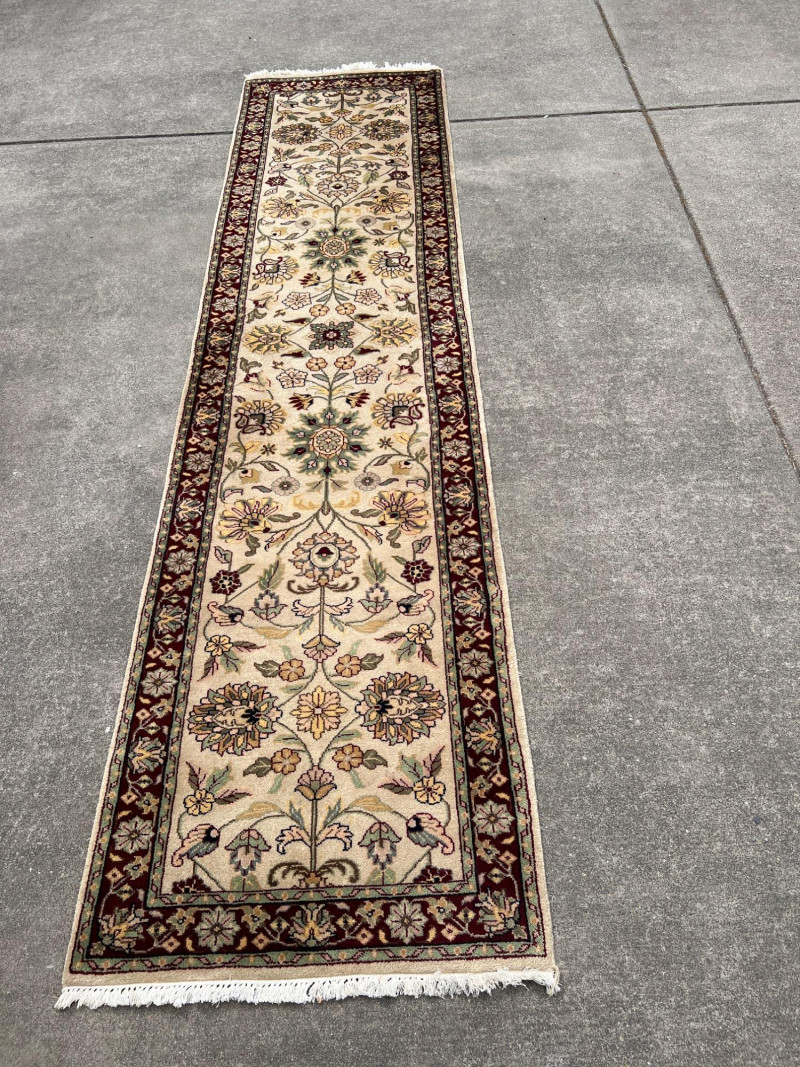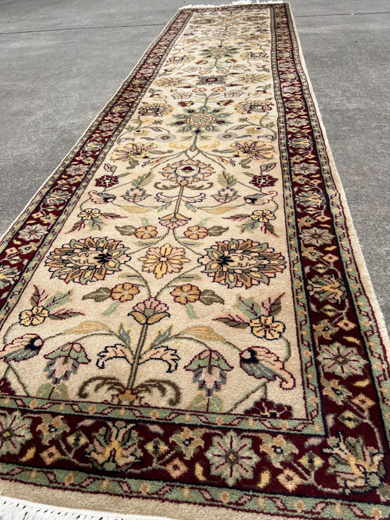 A striking 10-foot runner rug originating from South Kashmir or Srinagar, India. This handcrafted piece features a richly detailed floral motif set against a warm cream field, framed by a deep burgundy border. Expertly hand-knotted using 100% wool pile, the rug shows light wear consistent with age, yet retains solid structural integrity.