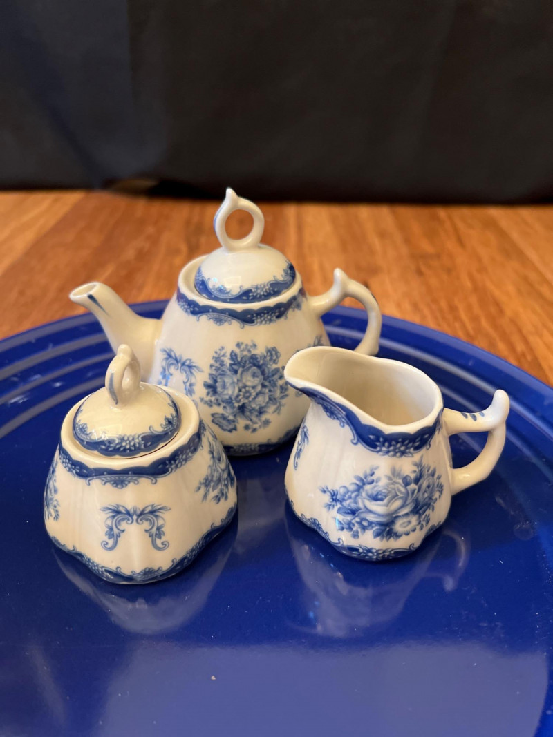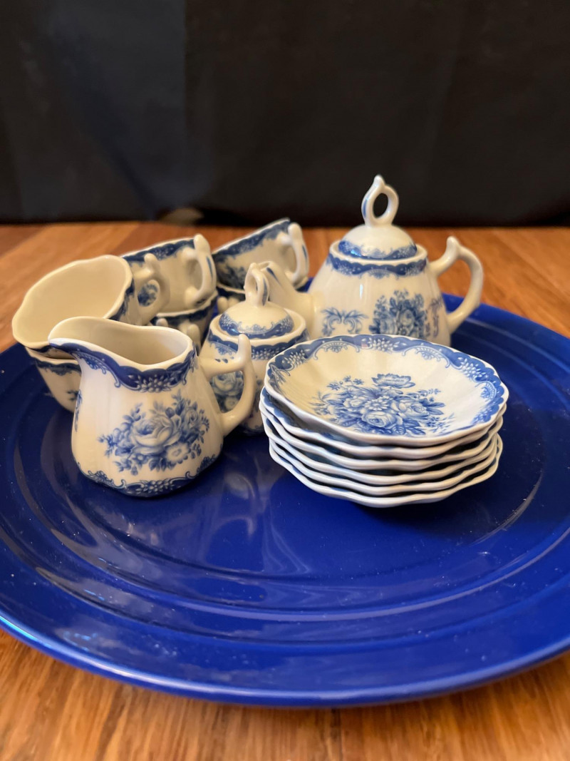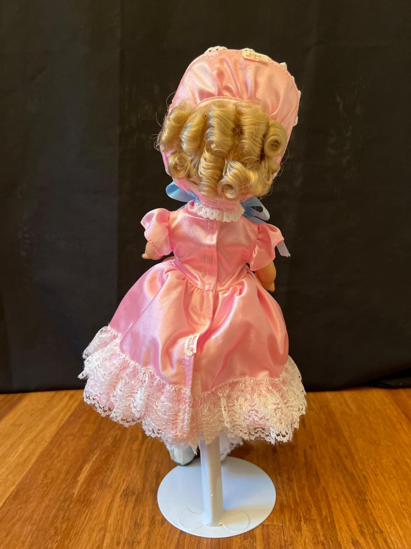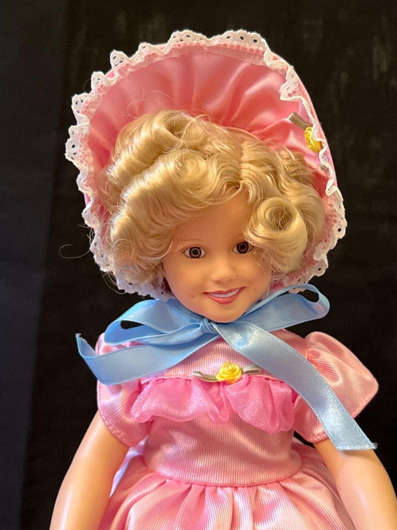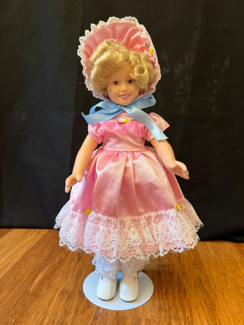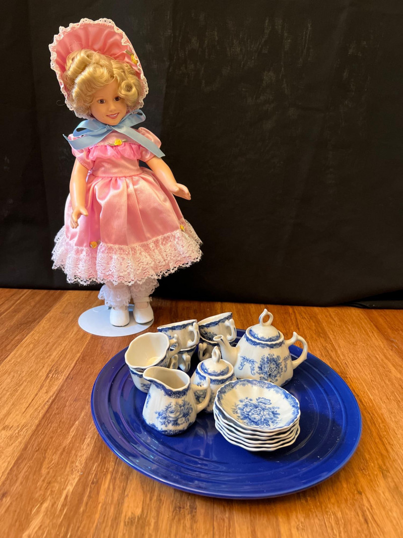 Celebrate childhood elegance and mid-century charm with this delightful pairing: Shirley Temple Danbury Mint Doll Measuring 16" tall, this beautifully crafted porcelain doll honors America's sweetheart. Dressed in a classic solid pink with white lace dress with blue bow and matching pink bonnet - her iconic curls and expressive eyes evoke timeless appeal. Madison Bay Company Miniature Tea Set A dainty children’s tea set perfect for doll displays or imaginative play. Includes miniature porcelain pieces with vintage floral detailing, presented in lovely condition. Both items radiate nostalgia and would make a lovely addition to doll collections, vintage décor setups, or children’s memorabilia. Friendly Reminder: This auction will start closing at 6:30pm on Tuesday, August 12th