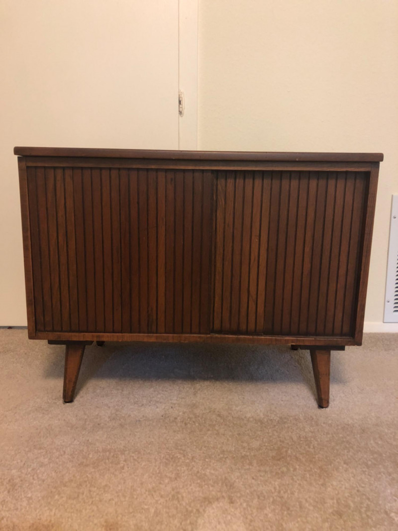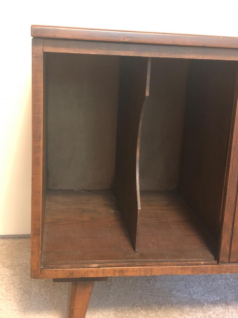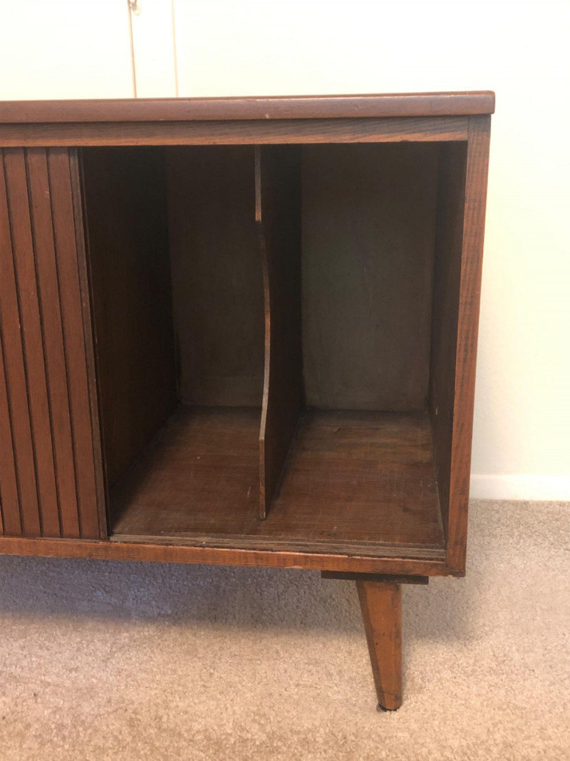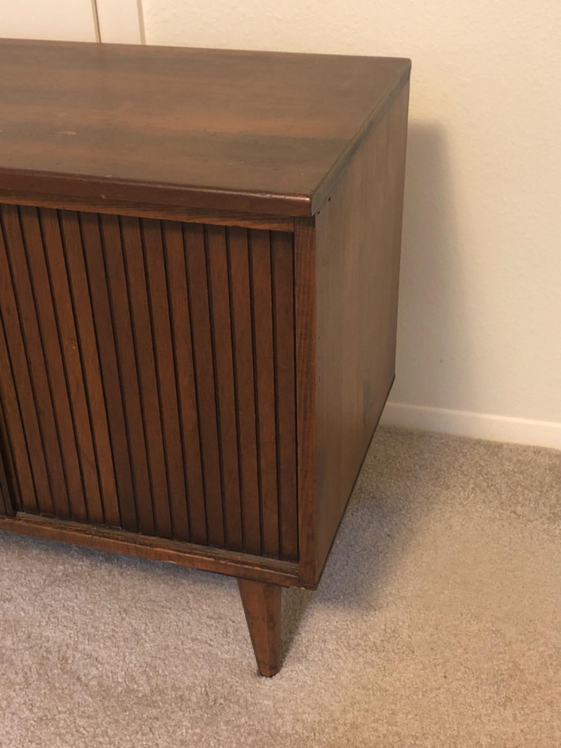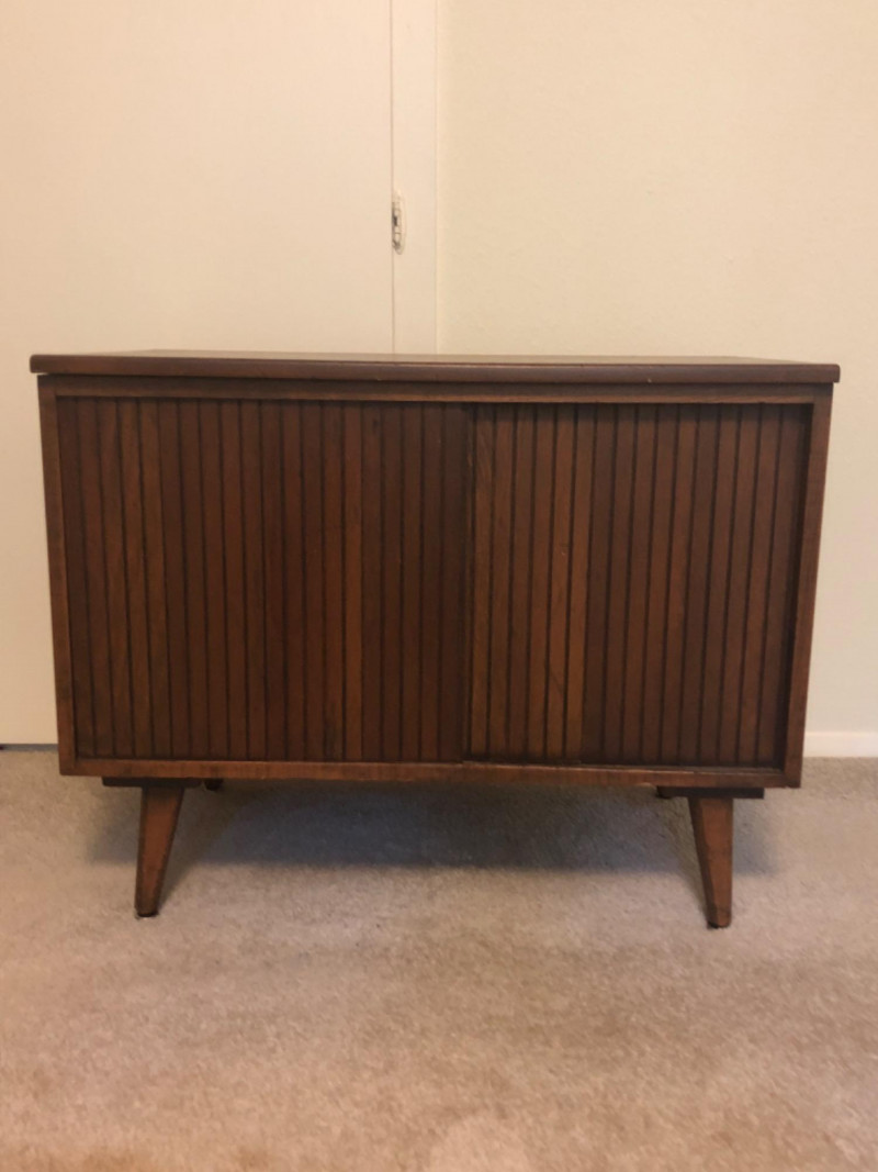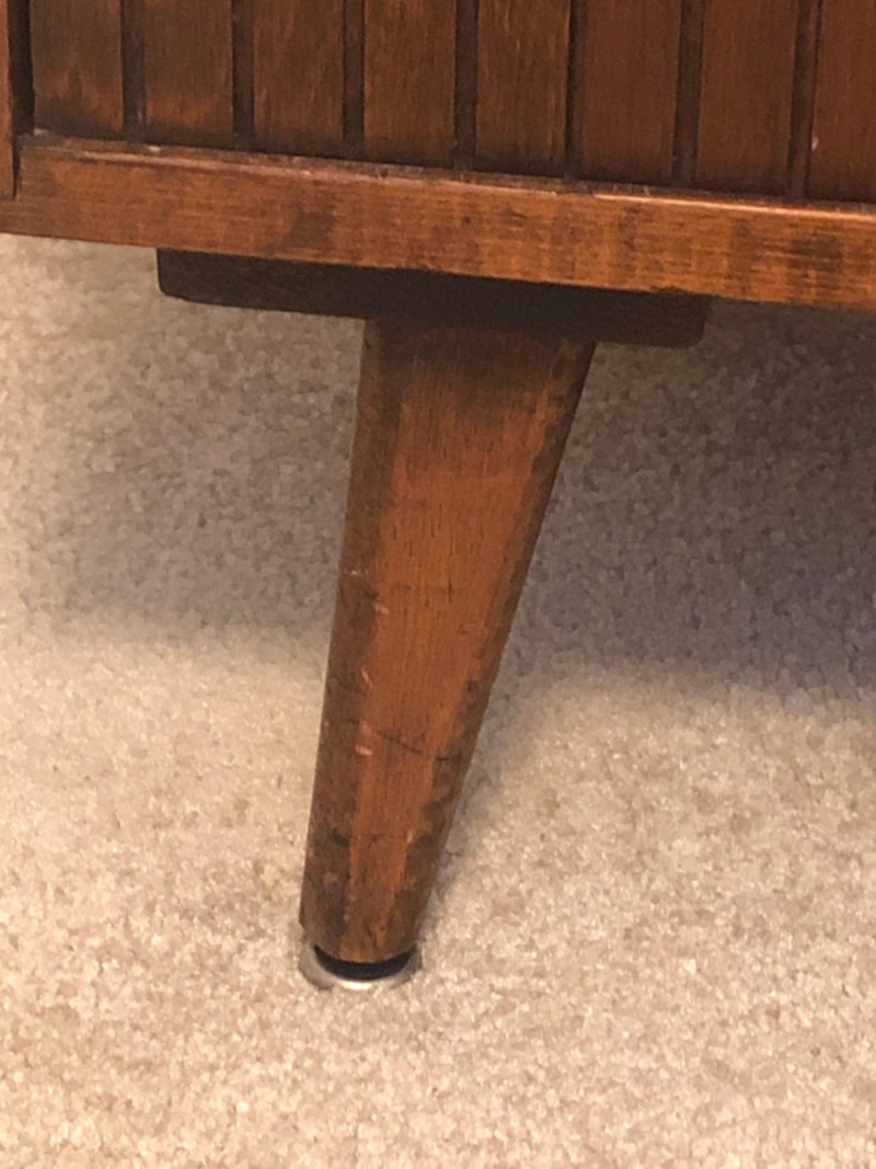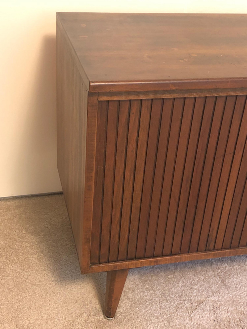 A sleek, mid-century modern style cabinet with clean lines and timeless utility: Design Features: Vertical slatted front adds dimensional texture Four tapered legs emphasize the classic MCM silhouette Compact rectangular form makes it ideal for storing records, media, or accent display Construction Details: Estimated contemporary build with homage to mid-century design Maker unknown; solid and stable construction with quality finishes Gently used condition with light wear consistent with age Located on second floor near staircase (15 steps) and ground level exit. Bidding on this lot is an agreement that: (1.) You will have 2 capable, able-bodied persons to lift and load at a minimum. (2.) You