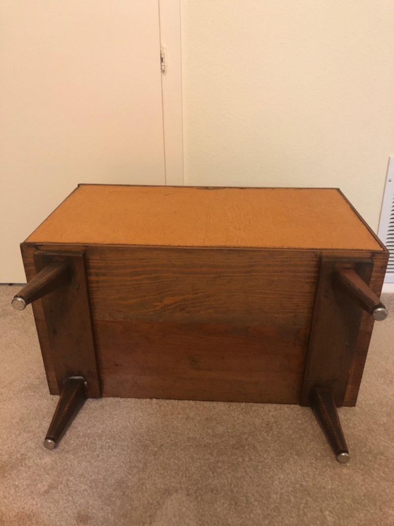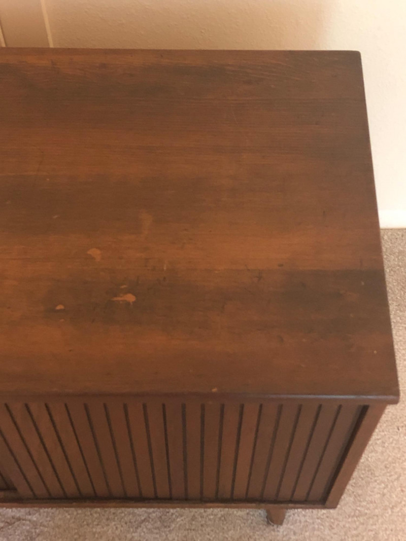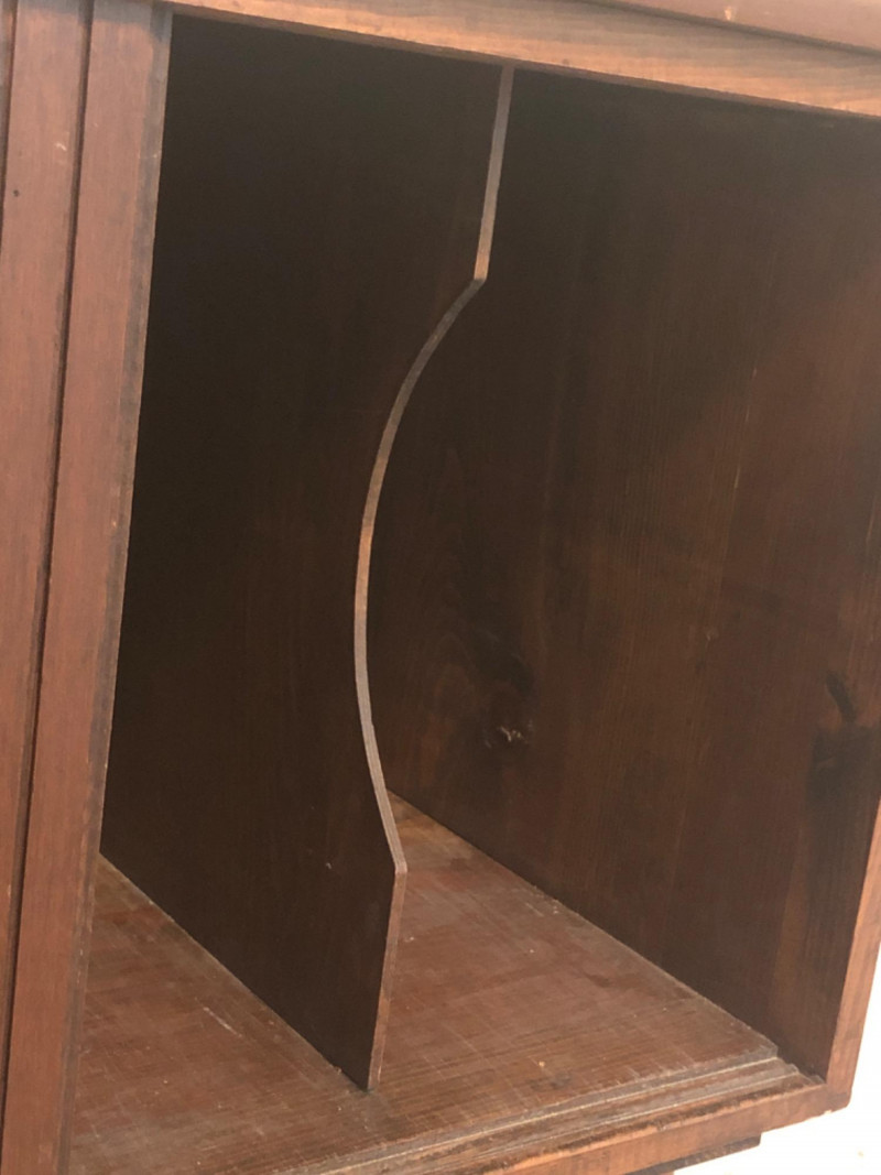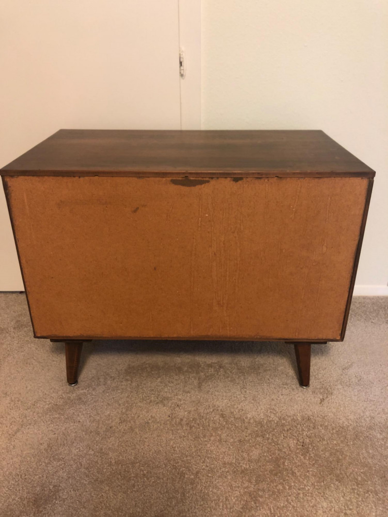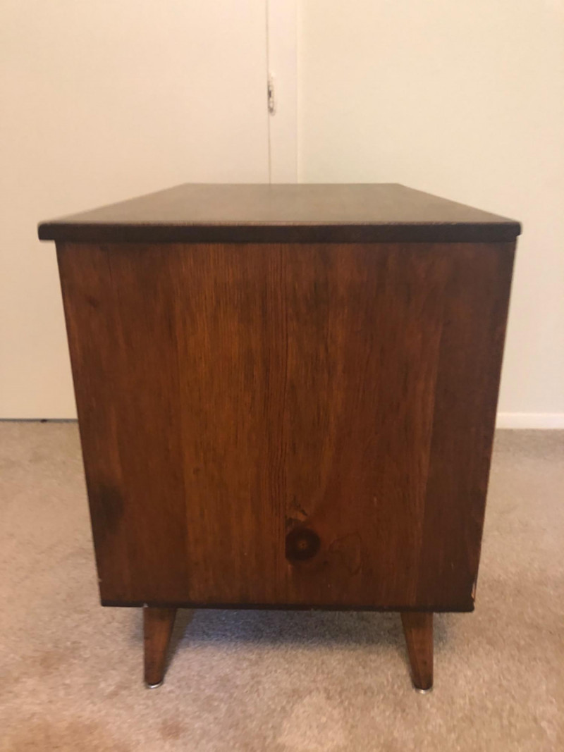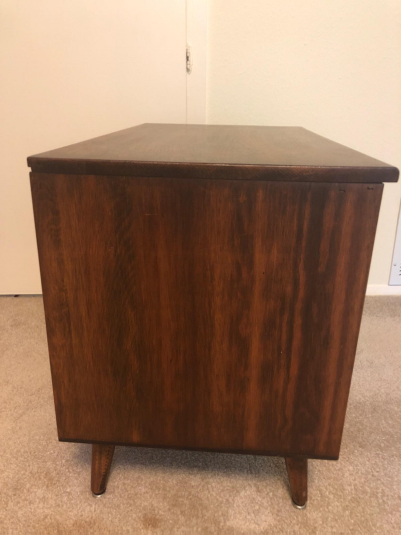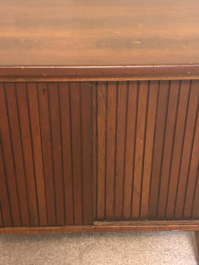A sleek, mid-century modern style cabinet with clean lines and timeless utility: Design Features: Vertical slatted front adds dimensional texture Four tapered legs emphasize the classic MCM silhouette Compact rectangular form makes it ideal for storing records, media, or accent display Construction Details: Estimated contemporary build with homage to mid-century design Maker unknown; solid and stable construction with quality finishes Gently used condition with light wear consistent with age Located on second floor near staircase (15 steps) and ground level exit. Bidding on this lot is an agreement that: (1.) You will have 2 capable, able-bodied persons to lift and load at a minimum. (2.) You