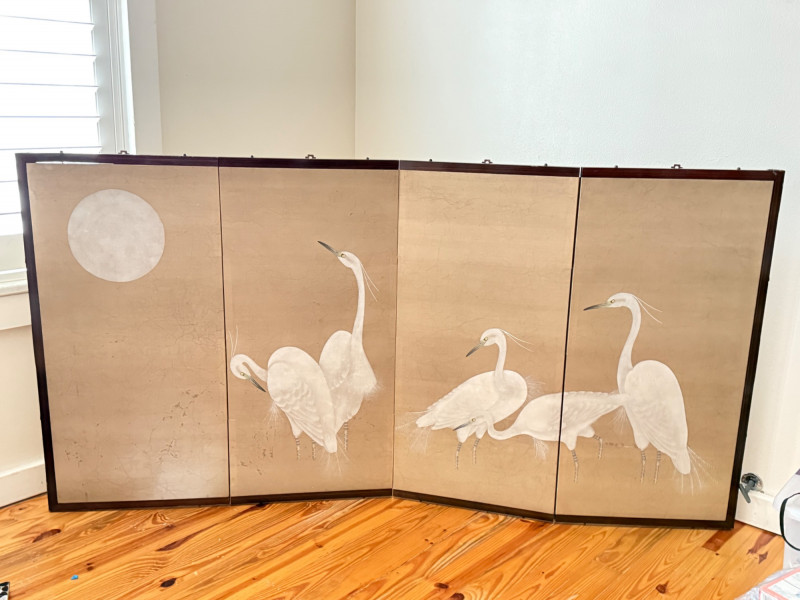 Lot # 171 - White Cranes and Moon Four-Panel Makura-Byōbu – 74”W x 36”H