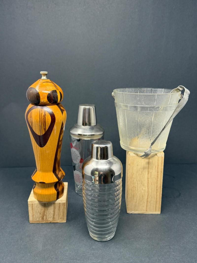 MCM Kitchen Accessories Grouping of mid-century modern kitchen and bar accessories including: Wooden pepper mill with abstract inlay design Two glass and stainless steel cocktail shakers (one with printed cocktail recipes) Textured glass ice bucket with metal handle Ice Bucket Dimensions: 5.5" W x 5.5" H