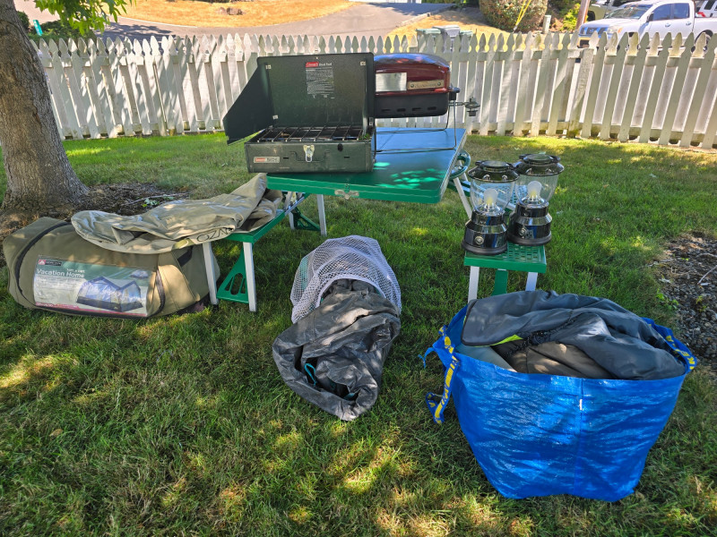 Camping Lot #1 A camping bundle with essential gear for group or family outdoor trips. Great for setting up a full campsite with cooking, sleeping, and lighting equipment. Includes: Sunbeam Gas Grill – Portable tabletop model Coleman Dual Fuel Camp Stove – Supports white gas and unleaded gasoline Ozark Trail 14' x 14' Vacation Home Tent – Sleeps up to 10, with optional room dividers Compact Two-Person Tent – Spare tent with mesh cover Ozark Trail Twin Inflatable Mattress – For added sleeping comfort Two GE LED Lanterns – Battery-operated, ideal for campsite lighting And more!