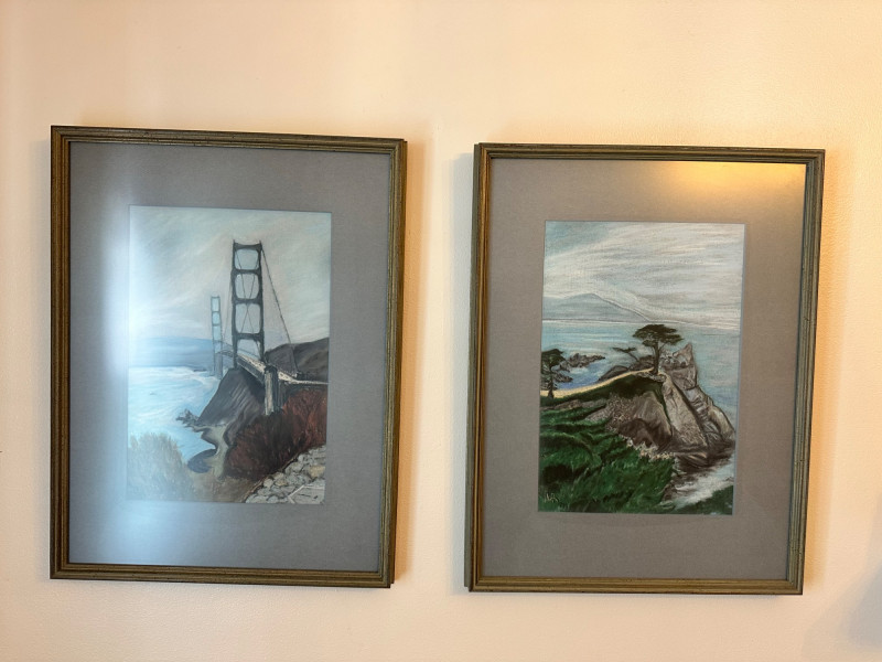 Pair of Signed Chalk Drawings – Coastal California Scenes (1973) Two original chalk drawings depicting iconic California landscapes: one featuring the Golden Gate Bridge and the other showcasing the Lone Cypress on the Monterey Peninsula. Both works are signed and dated 1973 by different artists and are framed in matching mats and wood frames. Medium: Chalk on paper