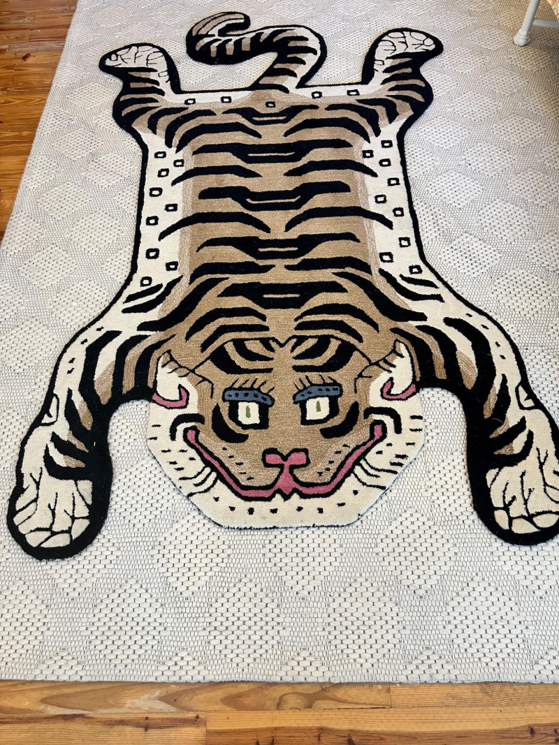Tiger Rug – 93” Length Rug shaped in the stylized form of a tiger with bold black stripes, beige and tan tones, and a detailed face with blue eyes and pink accents. The tiger design is bordered by a cream background featuring a diamond-patterned weave. Dimensions: