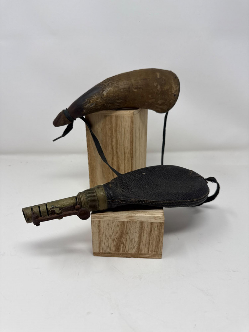 Vintage 1800s James Dixon & Sons Sterling Tip Black Powder Flask Black powder flask by James Dixon & Sons, featuring a leather-covered body, brass dispensing spout, and sterling tip, accompanied by a traditional powder horn. Details: Maker: James Dixon & Sons Era: 1800s Flask Tip: Sterling Flask Material: Leather with brass hardware Note: The horn shows some scrapes and abrasions as pictured.