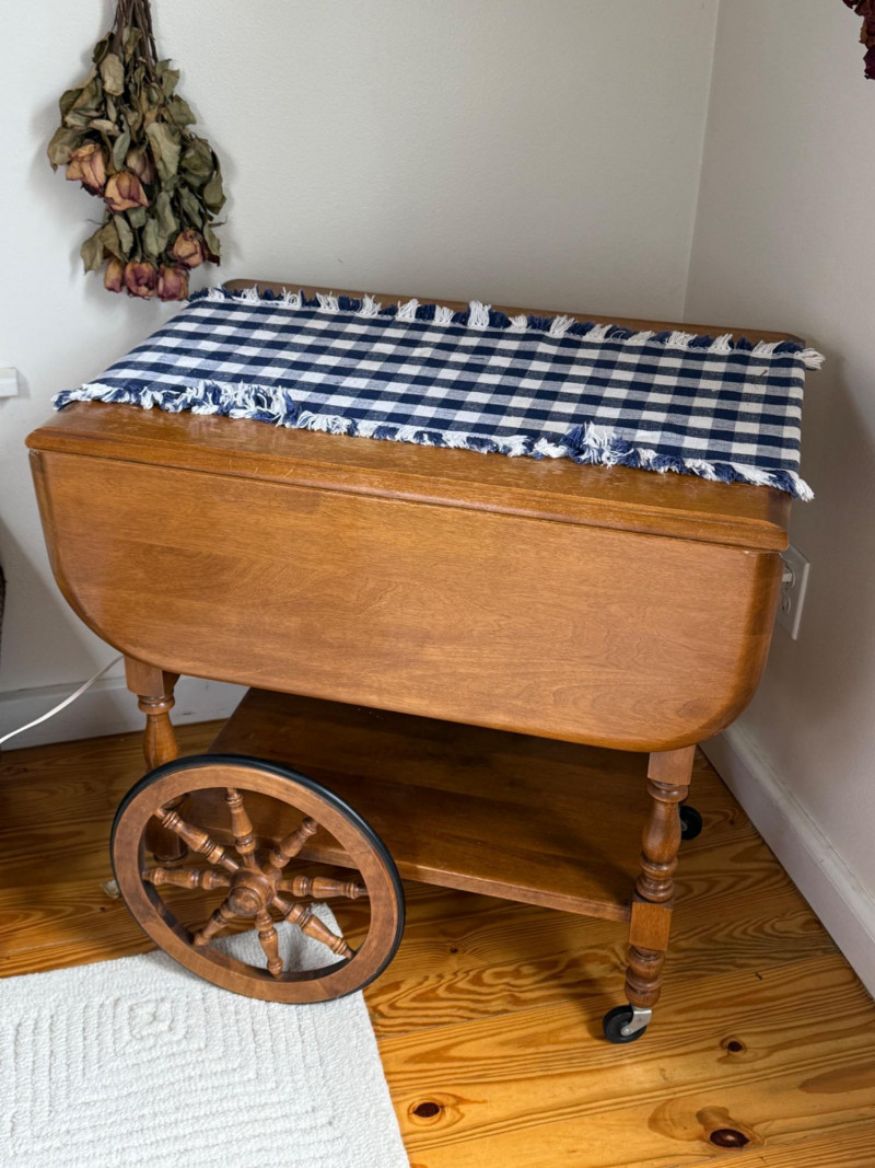 Mid-Century Colonial Style Drop-Leaf Tea or Bar Cart Colonial-style wooden serving cart from the mid-20th century, featuring a drop-leaf table top, turned wood legs, and large spoked wheels. Includes a removable lower shelf tray and a single drawer for storage. The cart is mobile with two small caster wheels at the rear. Details: Style: Mid-century Colonial Features: Drop-leaf top, removable serving tray shelf, single drawer, large spoked wheels, casters Material: Wood Function: Tea cart, bar cart, or side server Measurements: Height: 29" (73.7 cm) Length (Closed): 32" (81.3 cm) Width (Closed): 20.75" (52.7 cm) Width (Open): 41" (104.1 cm) Shelf Height: 10" (25.4 cm)