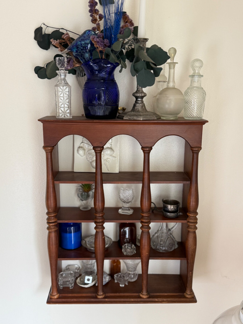 Vintage Wood 4-Tier Wall Shelf with Accessories Wall-mounted wooden shelving unit stained in a reddish-brown or cherry tone. Features turned half-spindle columns across the front and four fixed shelves. Comes with a collection of glass and metal accessories, including vases, bottles, and small containers. Details: Material: Wood (type unspecified), stained finish Features: 4 fixed shelves, 3-section front with turned half spindles Measurements: Overall: 19" W x 5.5" D x 22.75" H Shelf spacing: 4.5" Pillar spacing: 4.5" Condition: