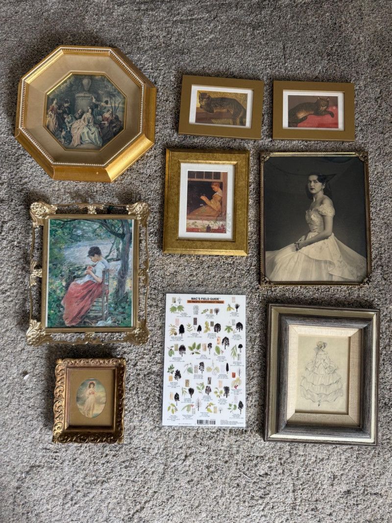 Assorted Framed Wall Art Lot Collection of ten framed art pieces including vintage prints, illustrations, a botanical reference chart, and a black-and-white portrait. Subjects include women in period dress, cats, a garden reader, and trees of the Pacific Northwest. Framed in a variety of ornate and contemporary styles, with both rectangular and octagonal formats. Dimensions: Smallest: 6” W x 7” H Largest: 9.5” W x 12” H