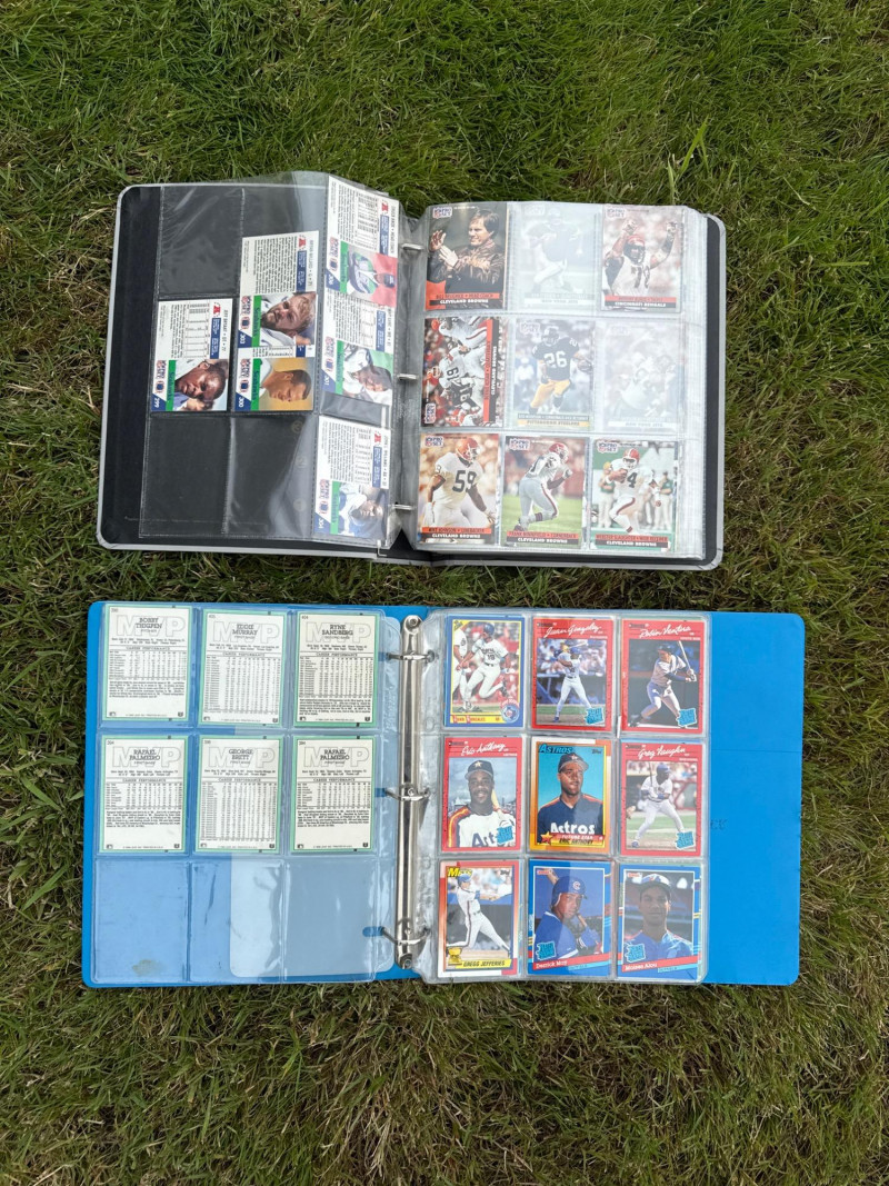 Vintage Baseball and Football Card Lot Large mixed lot of vintage sports trading cards featuring primarily football cards, with a selection of baseball cards included. Football cards span several teams and players, housed in a black binder. Baseball cards are organized in a separate blue binder, and include various players and card styles. Type: Football and Baseball Cards Storage: Two binders (1 grey, 1 blue)