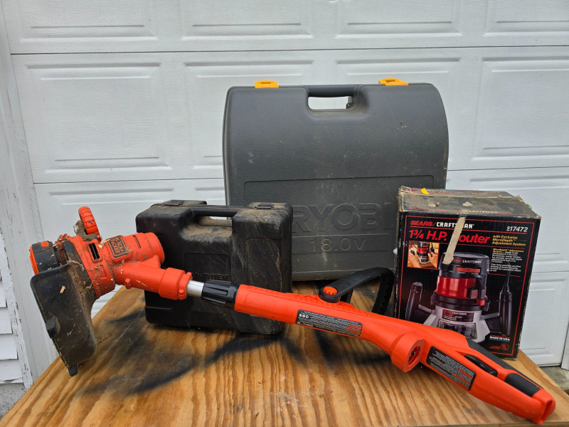 Miscellaneous Power Tool Set Assorted lot of power tools and accessories including the following: Ryobi 18V Cordless Tool Set (No Batteries Included) Black & Decker Electric Weed Whacker Wagner 2-Step Electronic Pro-Duty Power Painter Sears Craftsman Router – 1¾ HP