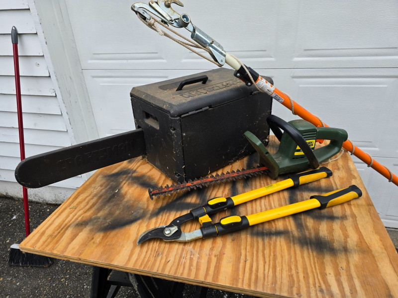 Tree and Shrub Trimming Tool Lot Comprehensive set of outdoor trimming tools for tree, shrub, and garden maintenance. Includes: Fiskars Extendable Tree Pruner 14 ft fiberglass pole with manual rope-operated bypass blade Designed for high branches and tree limbs Craftsman Gas Chainsaw (Model 358.360880) 2.6 cu.in. / 42cc 2-cycle engine 18” bar length Comes with hard plastic carrying/storage case Black & Decker Hedge Trimmer 16” dual-action blade Corded electric model (120V, 400mm) Designed for shrubs and hedges Expert Gardener Telescoping Bypass Loppers Extendable handles for adjustable reach Bypass blade for precision limb and branch cutting