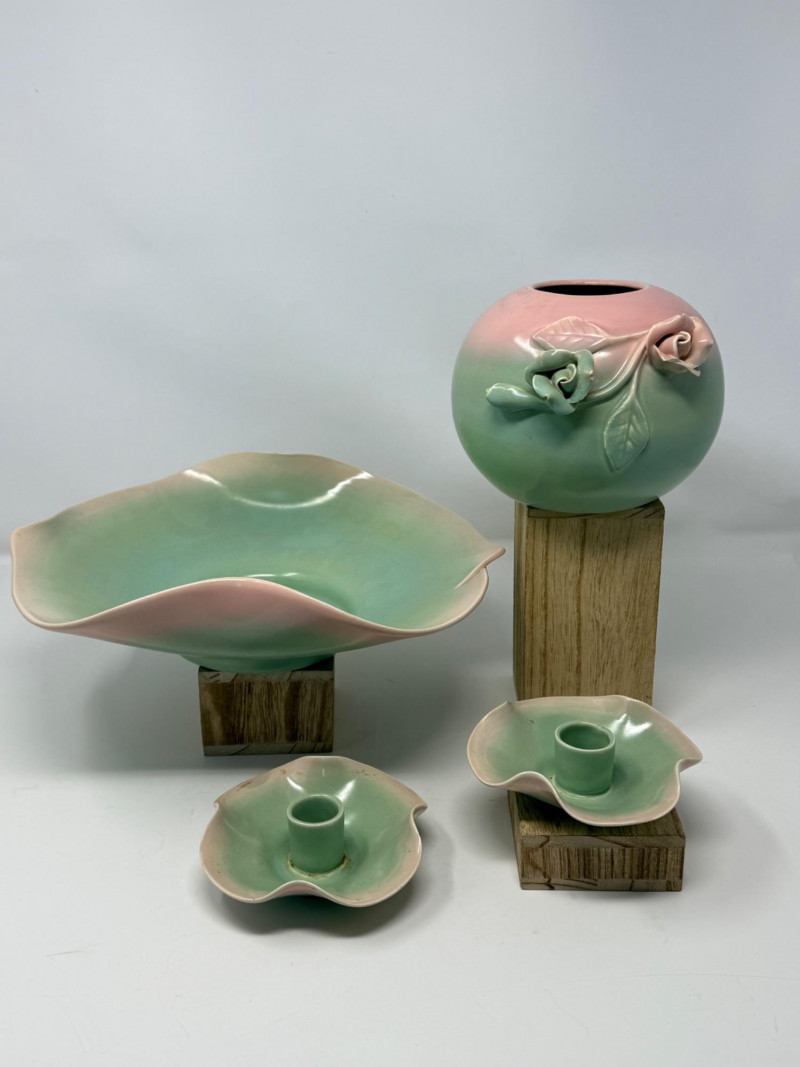 Signed 1930s Haldeman Calif Pottery Caliente Set Set of four pieces by Haldeman California Pottery in the Caliente pattern, featuring a gradient pink and green glaze. The set includes: One large low flower bowl with gently flared edges One round vase with applied floral relief decoration Two matching flower-form candle holders Each piece bears the incised signature on the underside. Measurements: Candle Holders: 5" diameter each Flower Bowl: 12" widest point x 3.5" tallest point