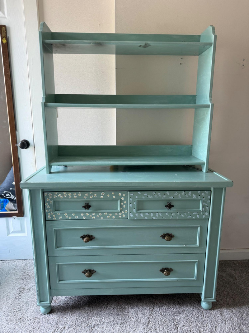 Vintage Provincial Hutch in Faded Aqua – 63" Tall Two-piece wooden hutch painted in a faded aqua finish. Features include three open display shelves and a base with four drawers—two small upper drawers adorned with hand-painted floral details and two full-width drawers below. Finished with decorative trim, round feet, and mixed metal hardware. Measurements: