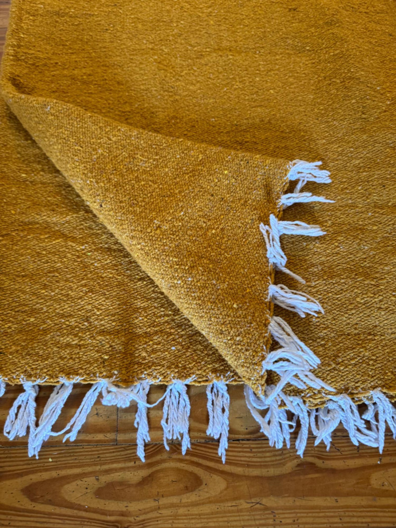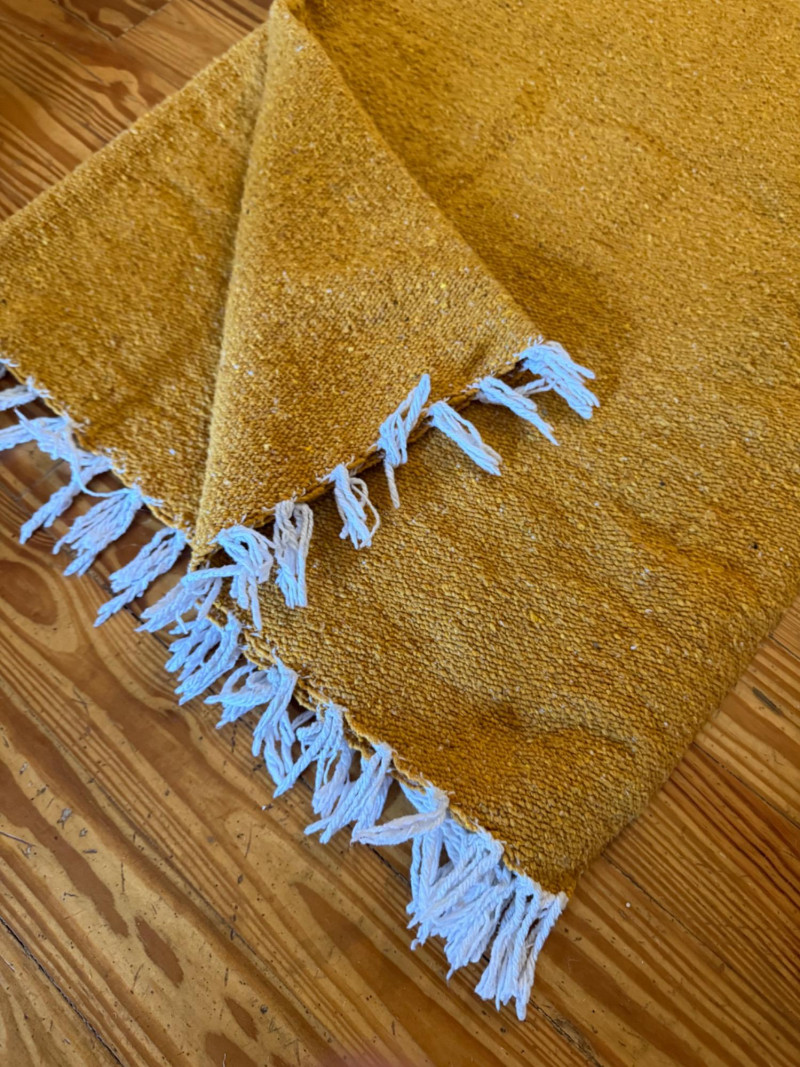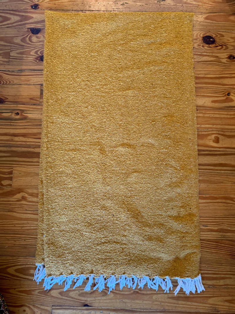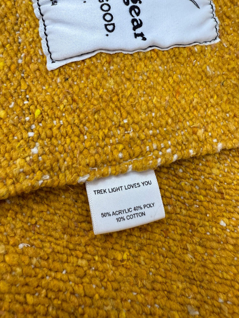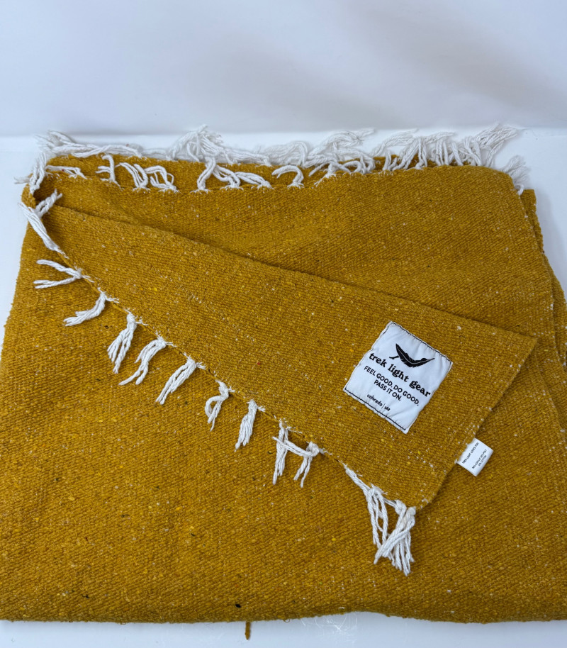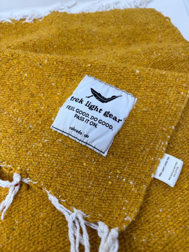 Trek Light Gear Woven Blanket – Mustard Yellow with White Fringe Woven throw blanket made by Trek Light Gear. Features a mustard yellow body with white fringe on both ends. Includes stitched brand label and fiber content tag. Material: Dimensions:
