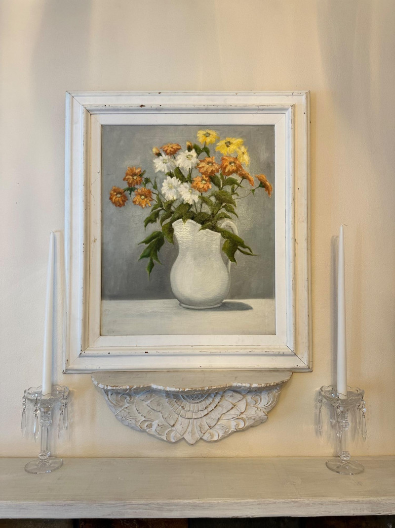 Floral Still Life, Glass Candlesticks with Crystal Prisms & Wall Shelf Wall-mounted display featuring a framed floral still life painting, a pair of glass candlesticks, and an ornate wall shelf. The painting shows orange, yellow, and white flowers in a white pitcher, set in a distressed white wood frame. The clear pressed glass candlesticks are designed for taper candles and adorned with hanging crystal-style prisms. All components share coordinating tones for a cohesive presentation. Measurements: Painting (with frame): 31.5" H x 27" W Candlesticks: 8" H Shelf: 21" W x 6" T
