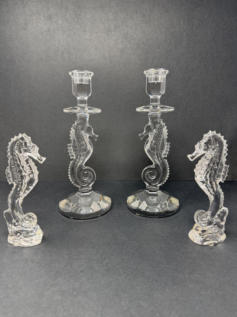 Waterford Seahorse Candlestick Holders and Figurines – Set of 4 Set of four clear crystal pieces featuring Waterford's seahorse motif, including: Two candlestick holders, each formed with a central seahorse figure and faceted base. Two standalone seahorse figurines with matching detailing and molded bases. Measurements: Candlestick holders: 11.5" height x 4.5" diameter Seahorse figurines: 7.25" height x 2.5" length x 1.5" width