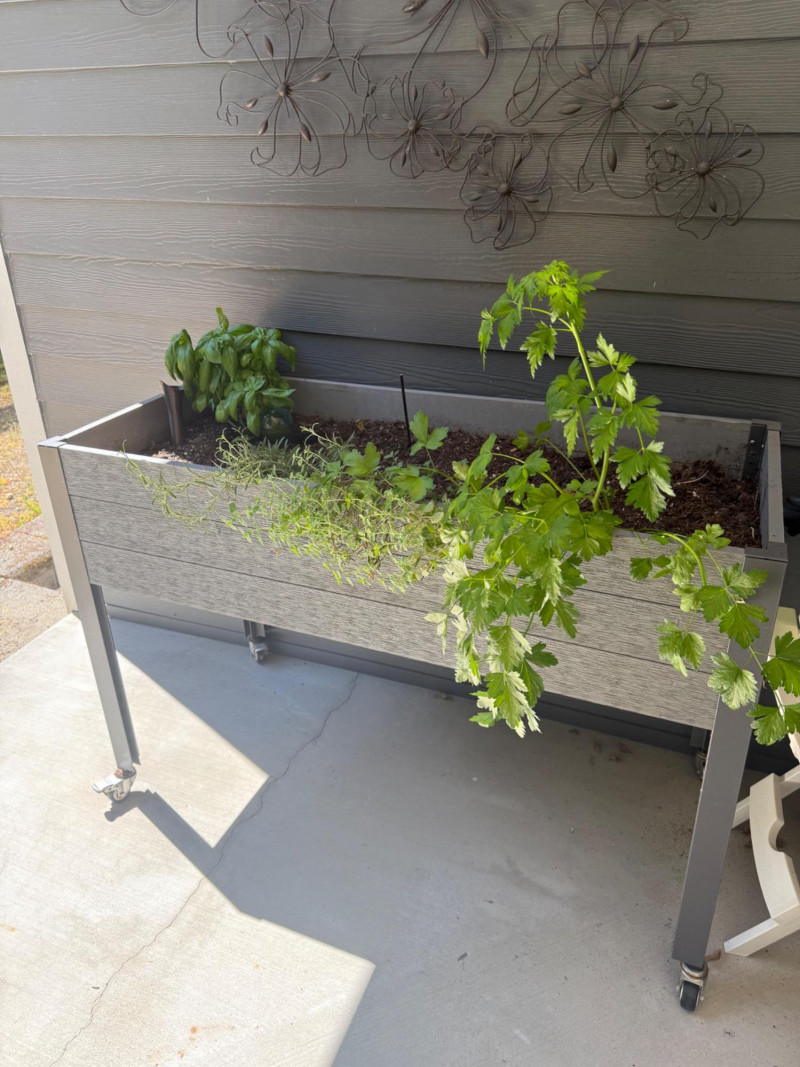 Portable Rolling Herb Planter Box – Herbs Included Elevated rectangular planter on wheels with metal frame and wood-style paneling. Includes planted herbs: visible basil, parsley, and dill. Suitable for patios or balconies. Box has drainage and ample soil depth for herb growth. Measurements: