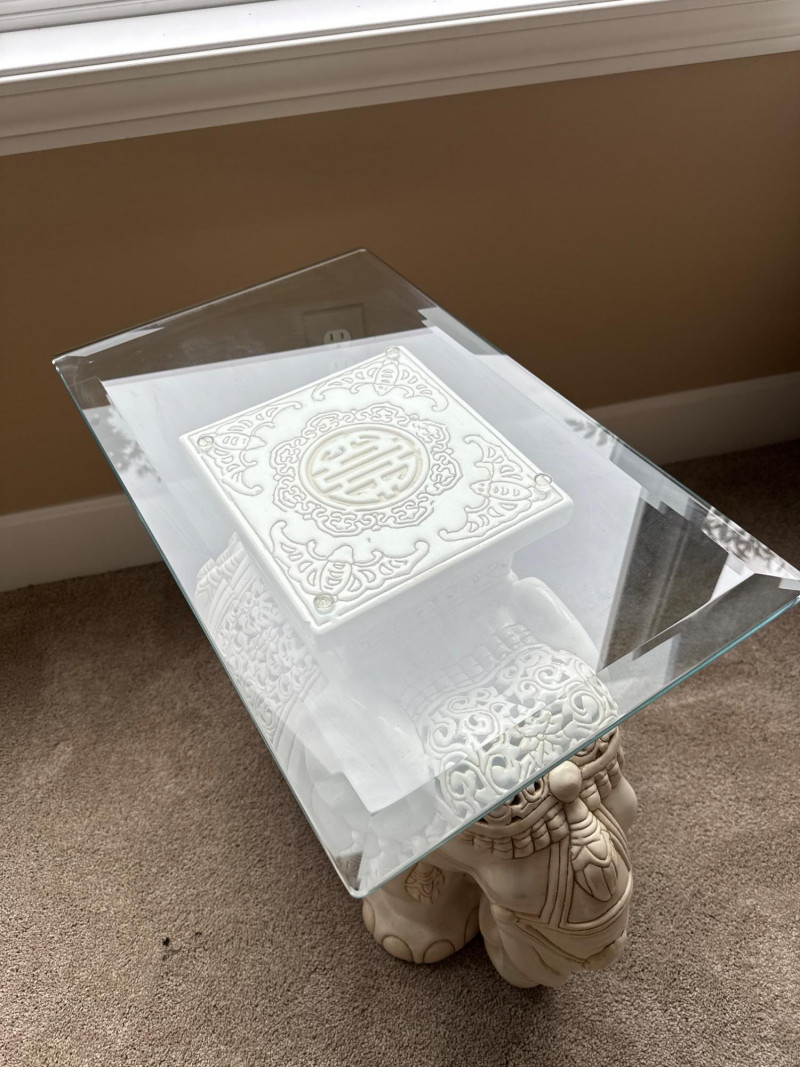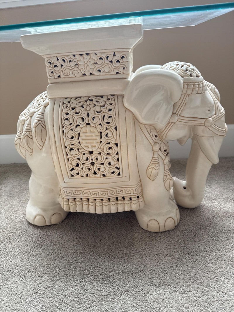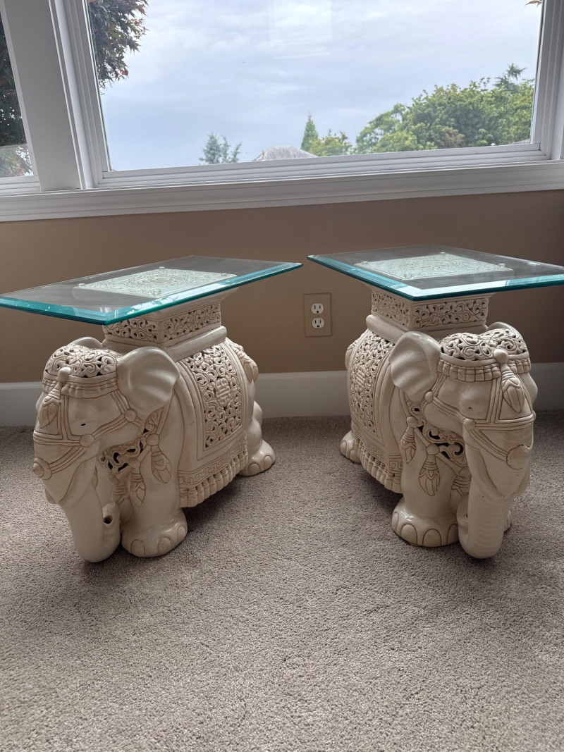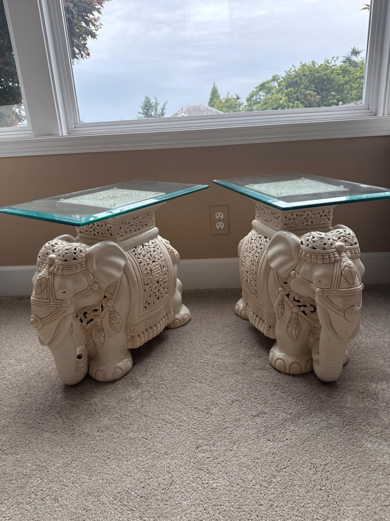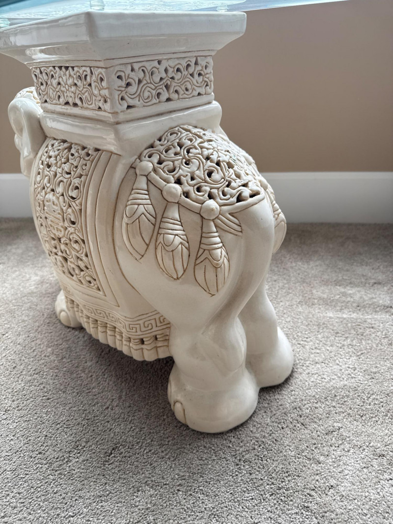 Pair of Ornate Elephant Side Tables with Glass Tops Pair of decorative elephant-shaped side tables featuring square glass tops. The bases are made of ceramic or resin with an ivory-toned glaze and intricate raised detailing. The design shows Asian or Chinoiserie influence, with the elephants depicted in traditional ornamental dress. Measurements: