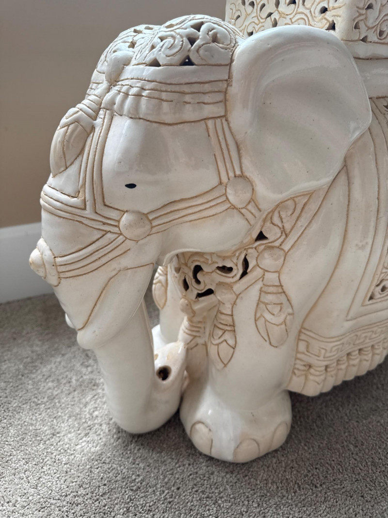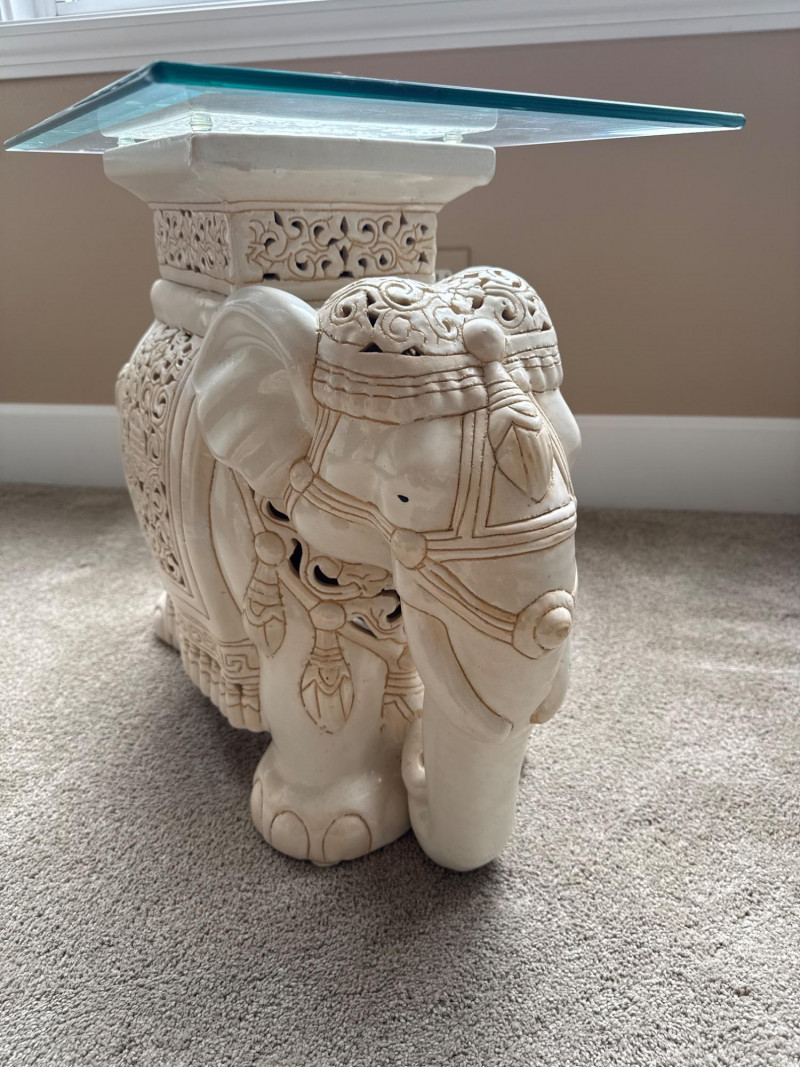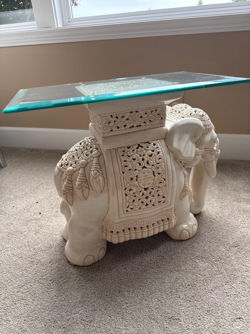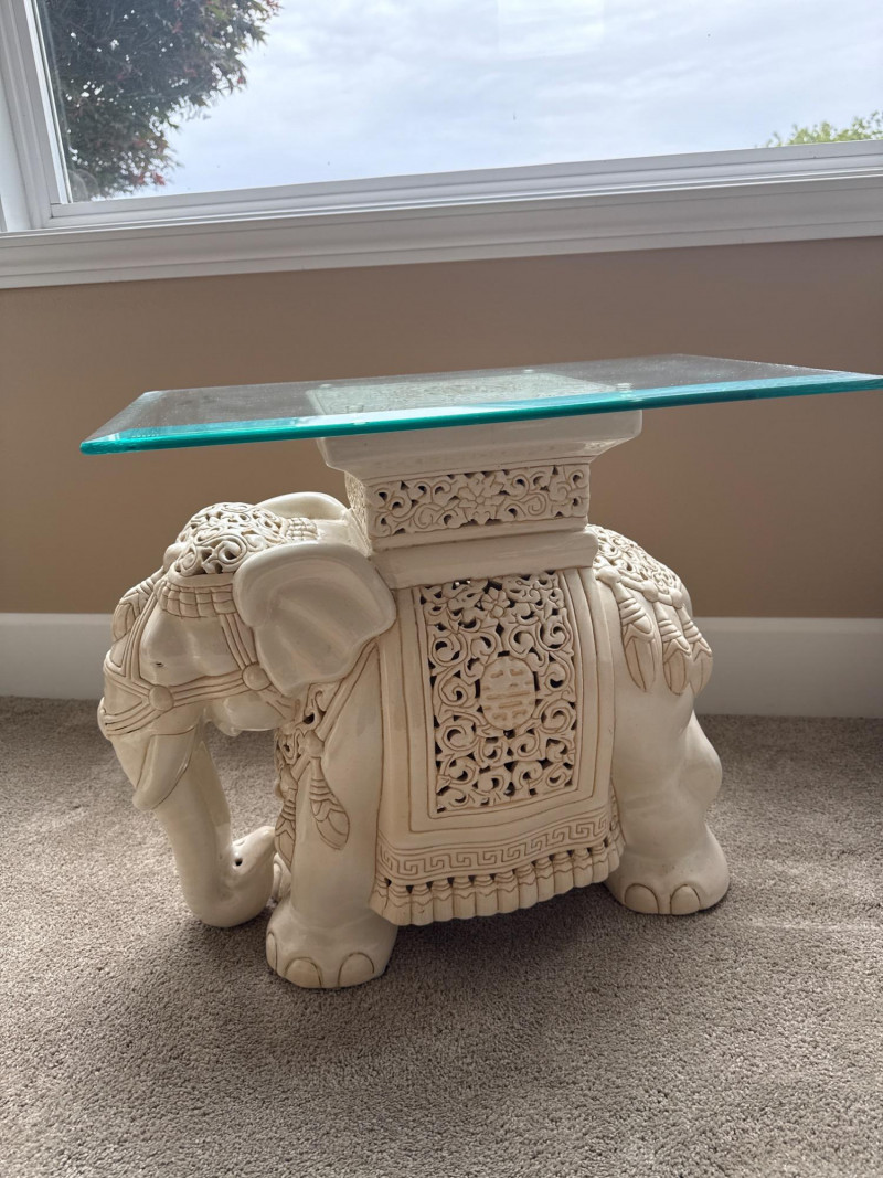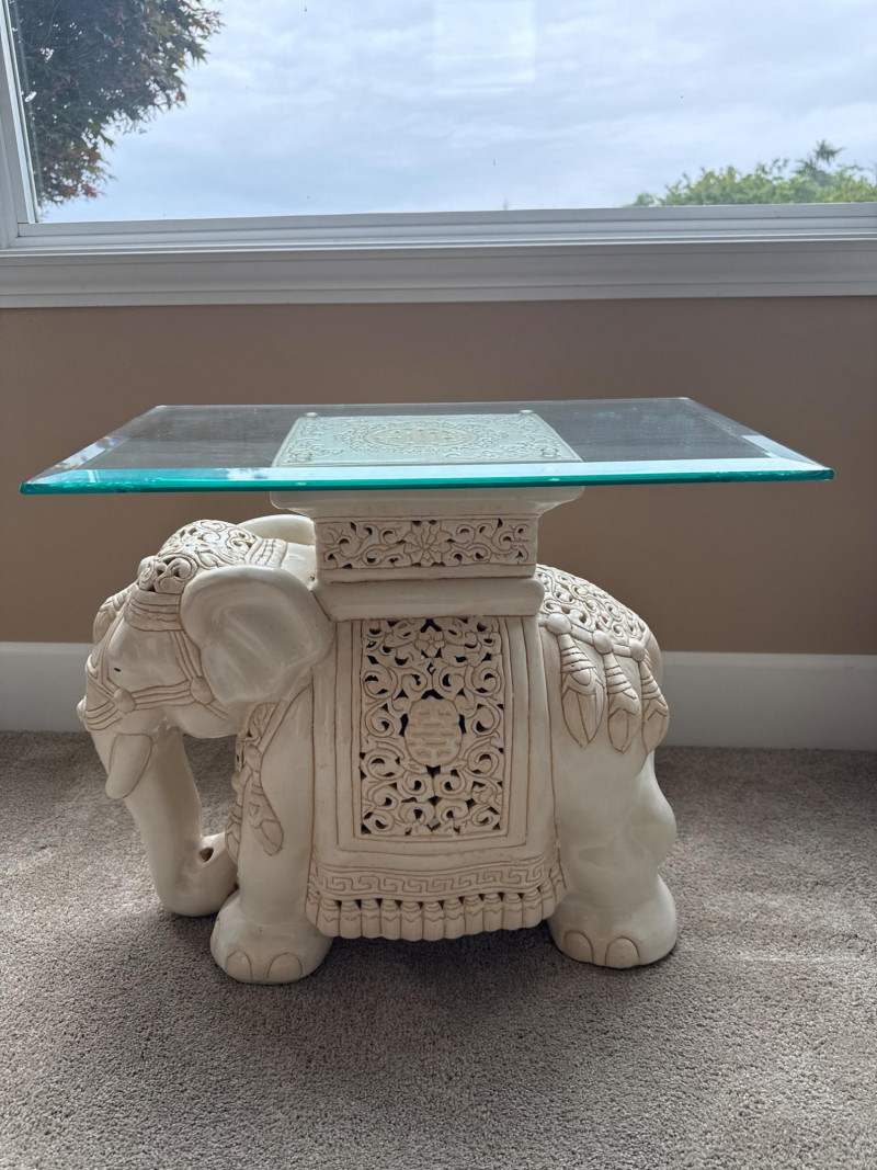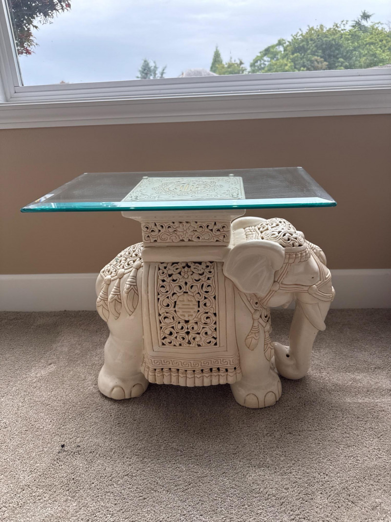 Pair of Ornate Elephant Side Tables with Glass Tops Pair of decorative elephant-shaped side tables featuring square glass tops. The bases are made of ceramic or resin with an ivory-toned glaze and intricate raised detailing. The design shows Asian or Chinoiserie influence, with the elephants depicted in traditional ornamental dress. Measurements: