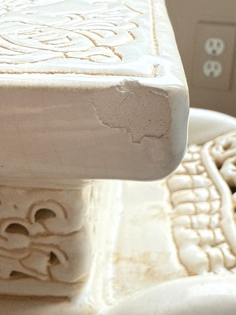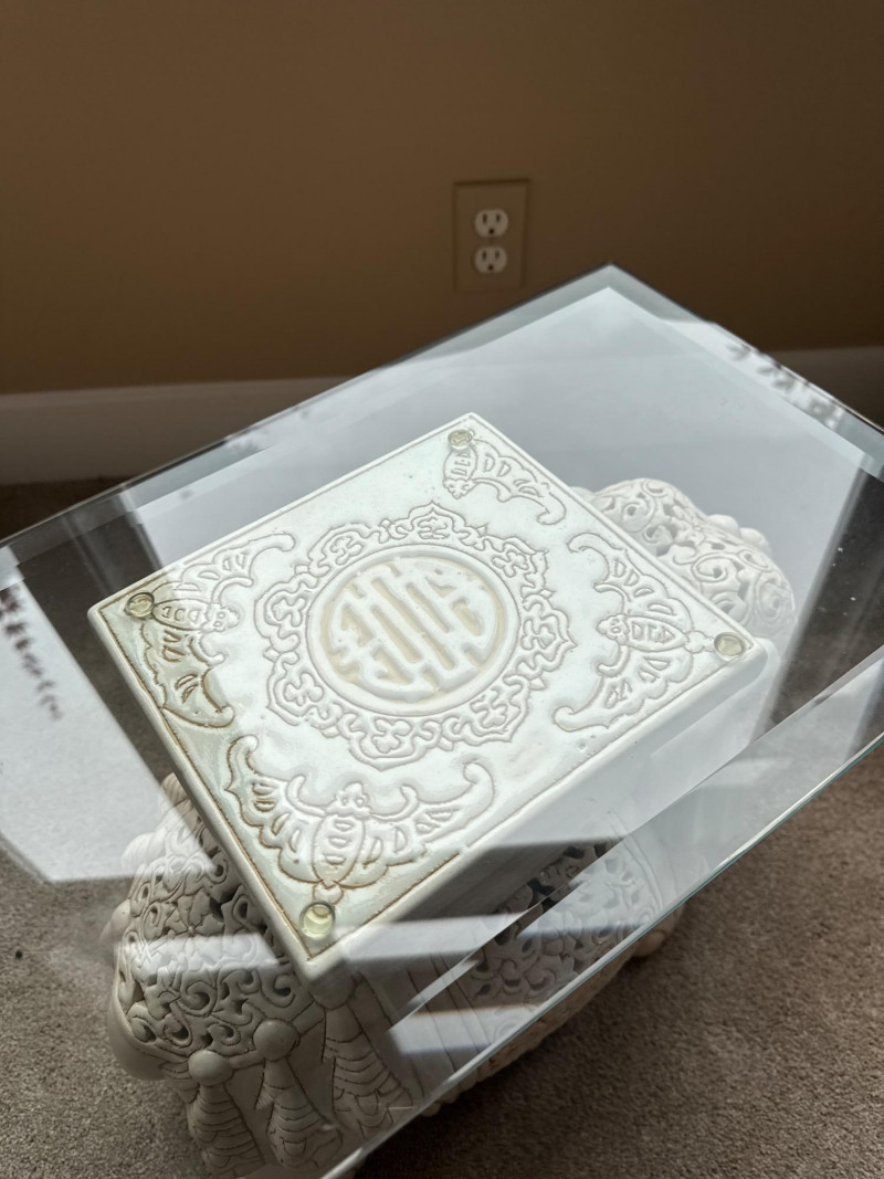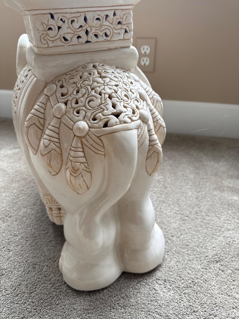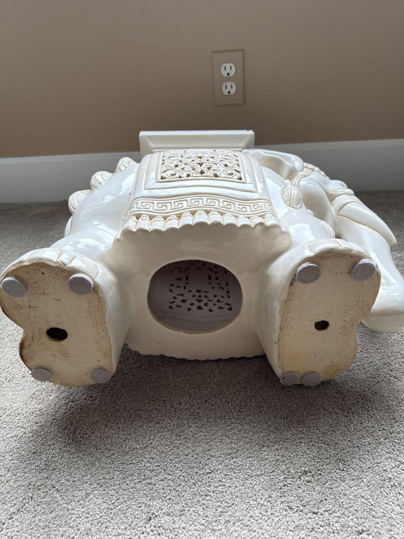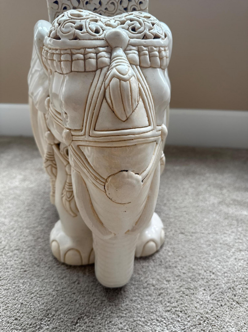 Pair of Ornate Elephant Side Tables with Glass Tops Pair of decorative elephant-shaped side tables featuring square glass tops. The bases are made of ceramic or resin with an ivory-toned glaze and intricate raised detailing. The design shows Asian or Chinoiserie influence, with the elephants depicted in traditional ornamental dress. Measurements: