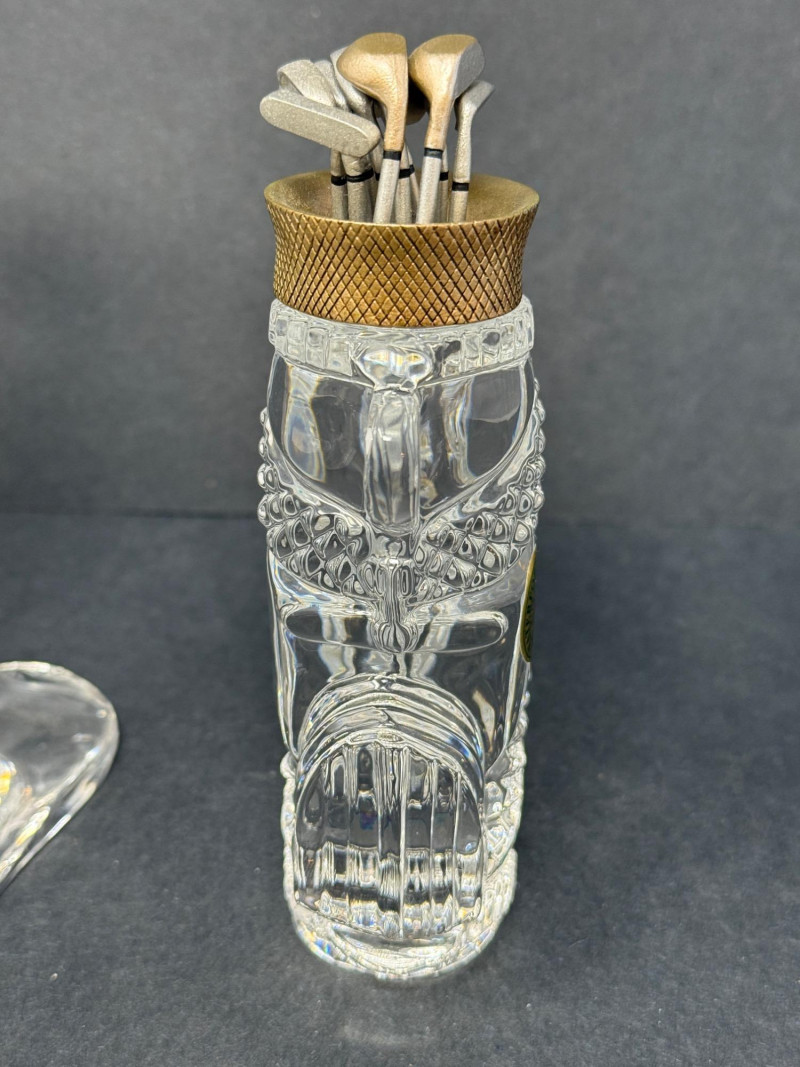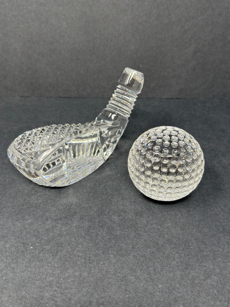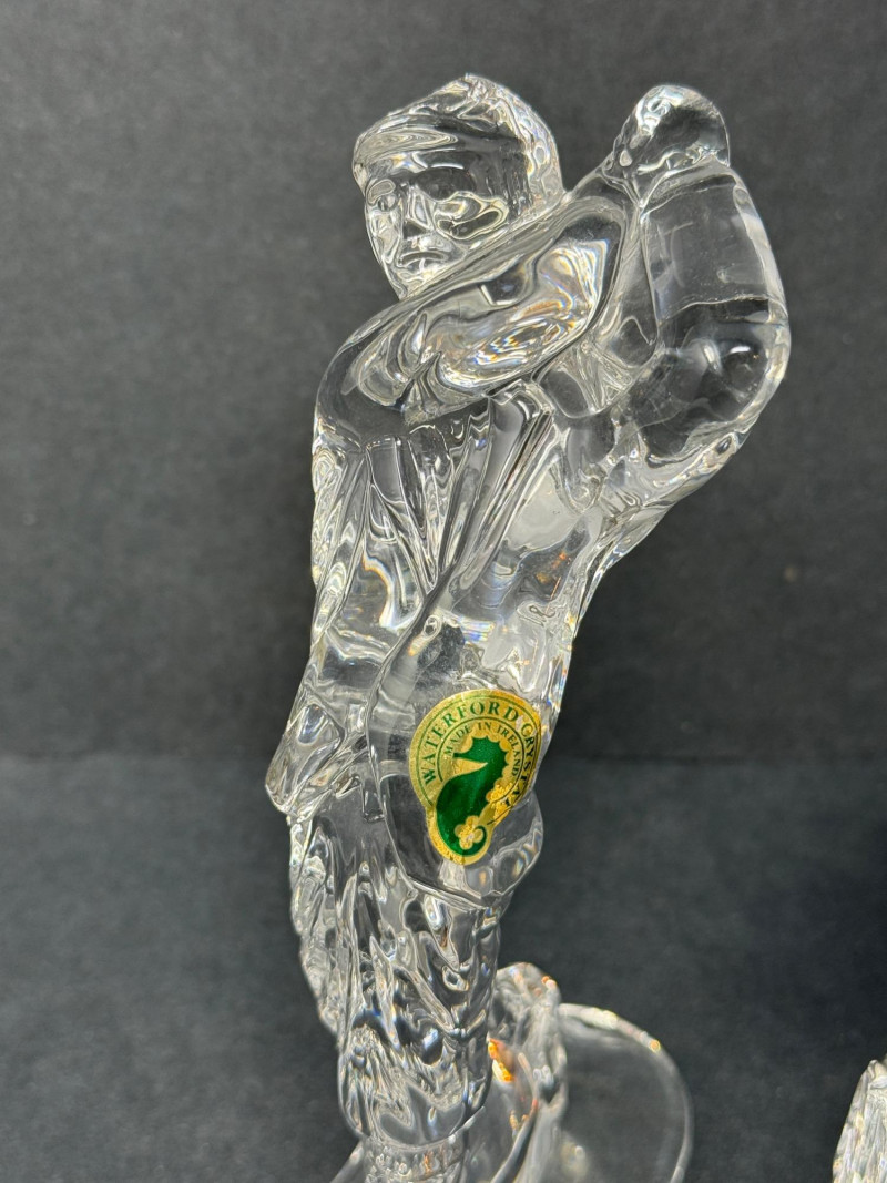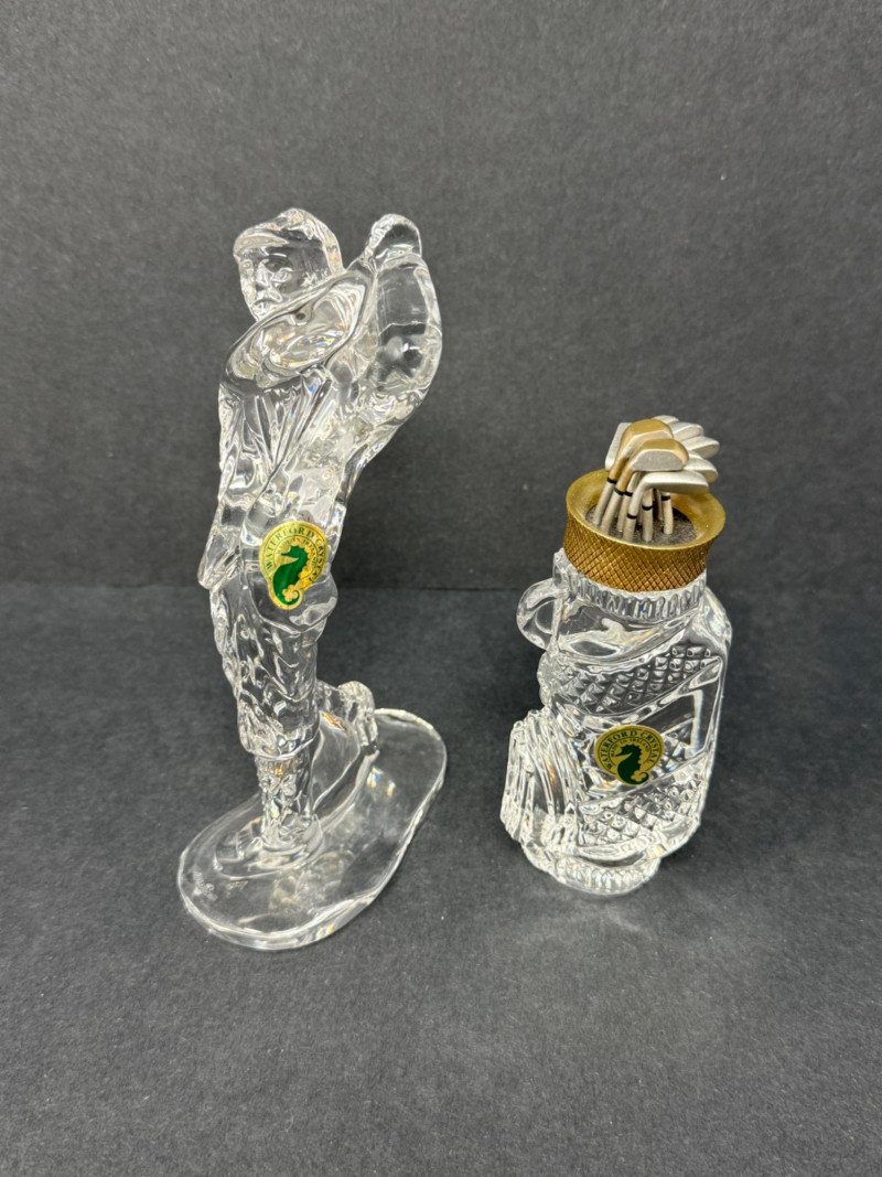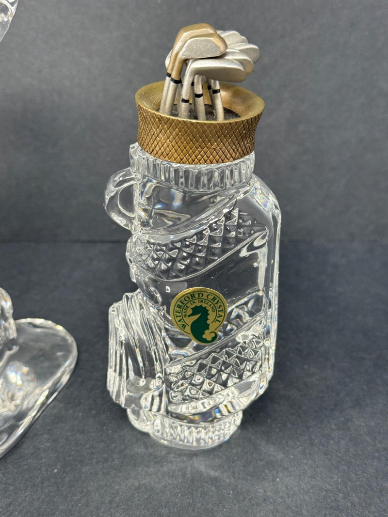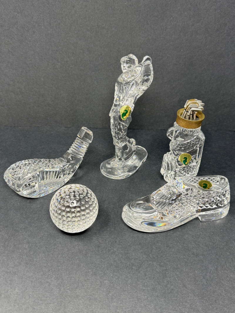Set of Five Waterford Golf Pieces Set of five clear cut crystal golf-themed pieces by Waterford, each bearing the original green and gold Waterford foil label. The set includes: Golfer in mid-swing Golf shoe Golf bag with clubs Golf putter Golf ball Crafted with detailed texture and faceted design characteristic of Waterford crystal. Measurements: