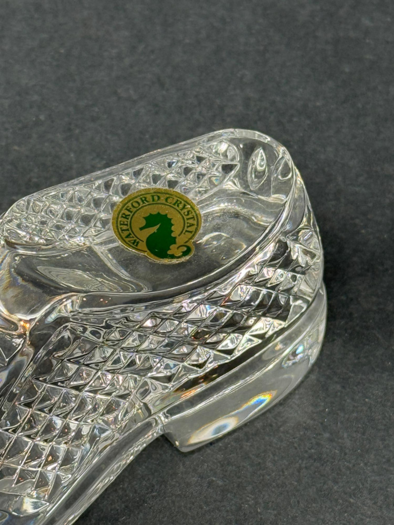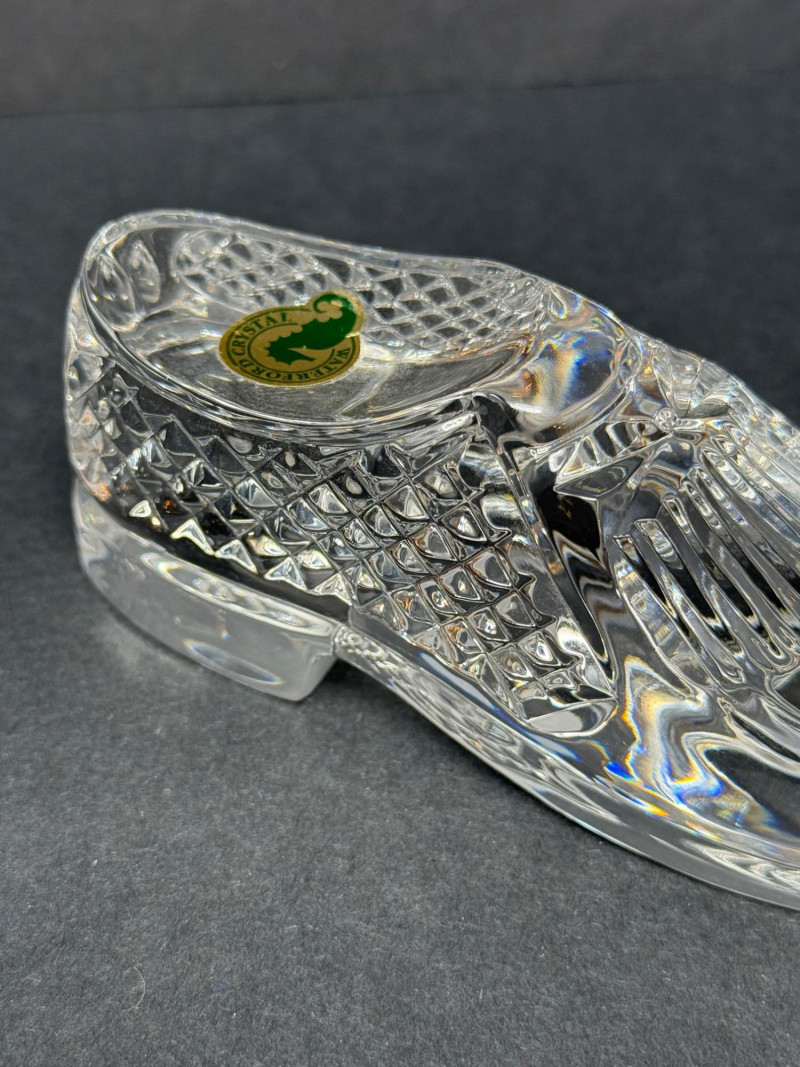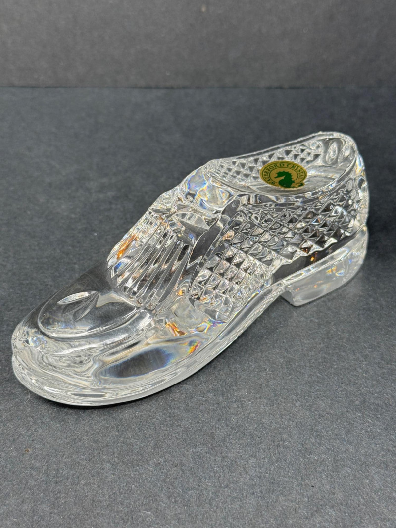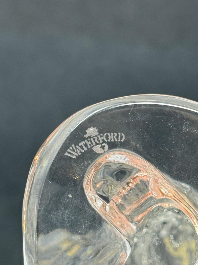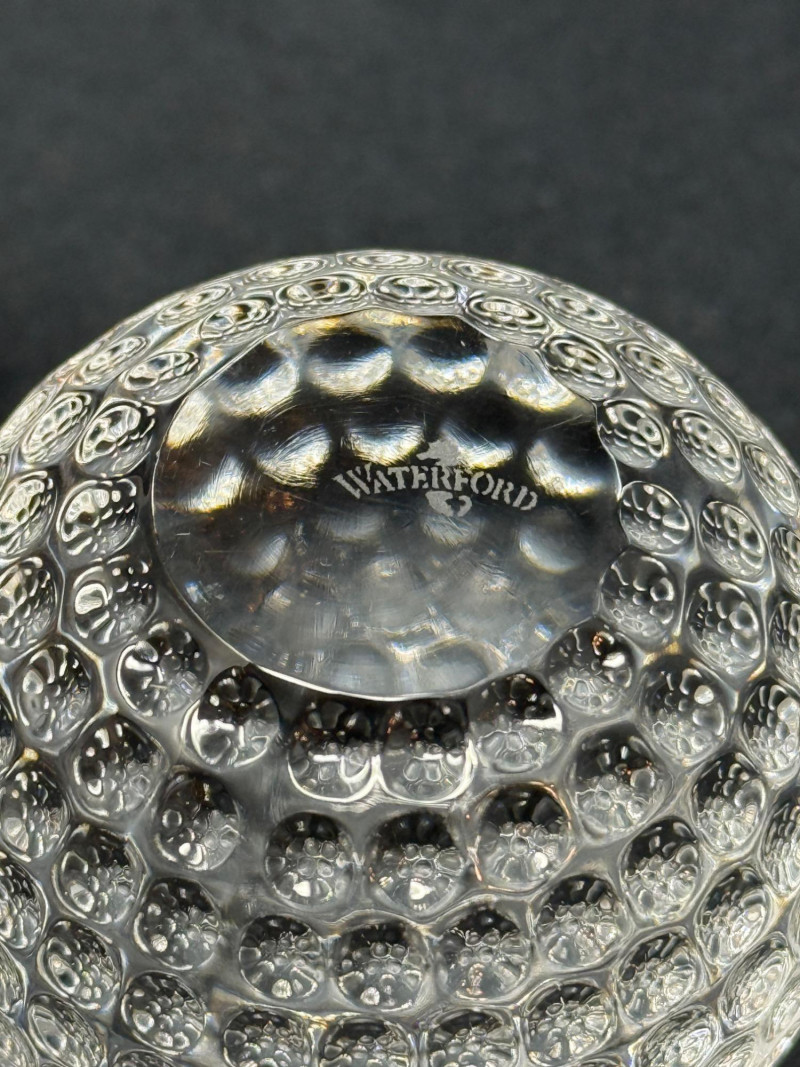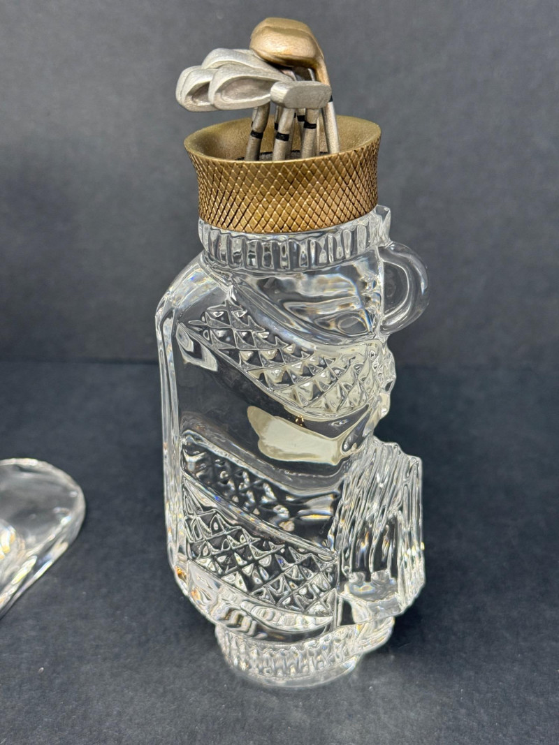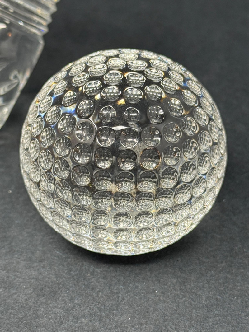 Set of Five Waterford Golf Pieces Set of five clear cut crystal golf-themed pieces by Waterford, each bearing the original green and gold Waterford foil label. The set includes: Golfer in mid-swing Golf shoe Golf bag with clubs Golf putter Golf ball Crafted with detailed texture and faceted design characteristic of Waterford crystal. Measurements: