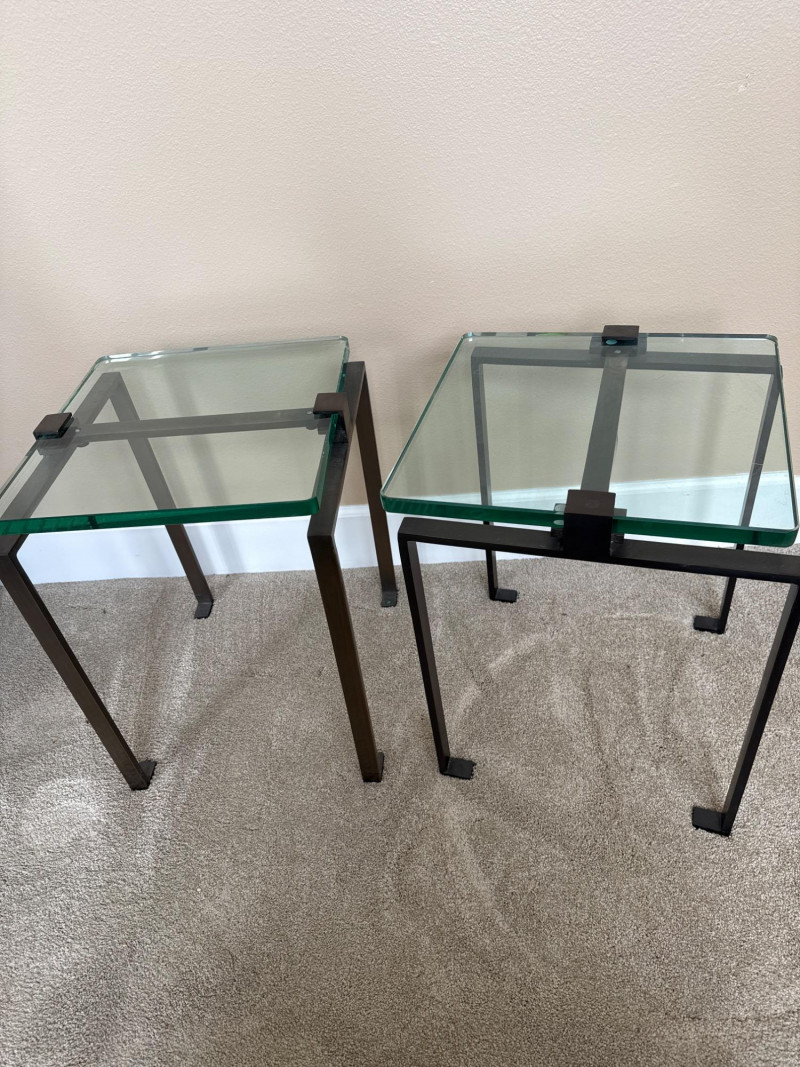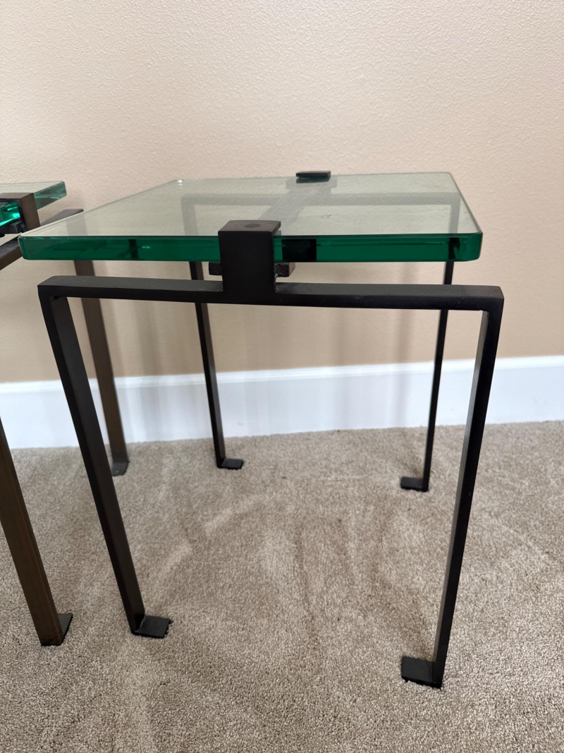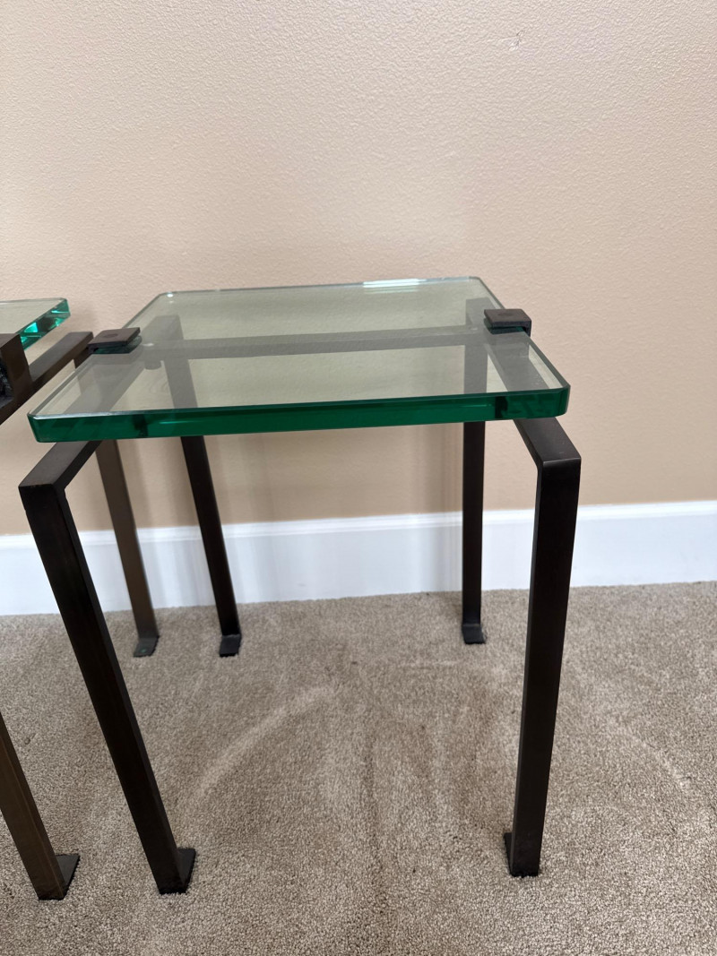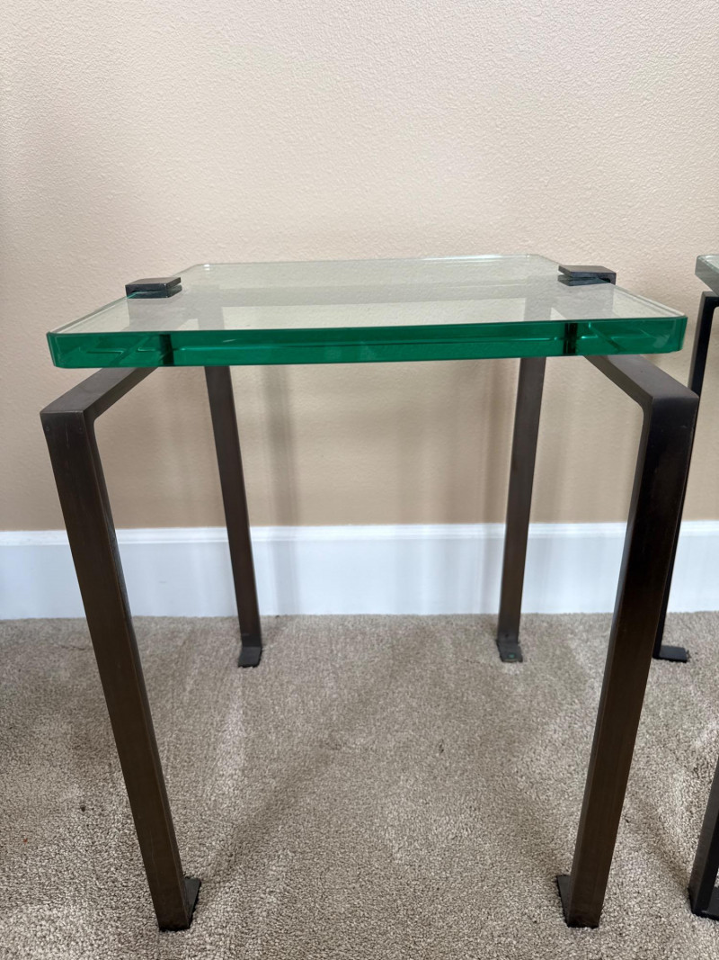 Pair of Trendy Highend Glass End Tables Set of two end tables with super thick square glass tops mounted on black metal frames. Each table features exposed corner brackets and a modern open-leg design. Measurements:
