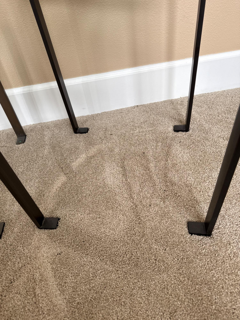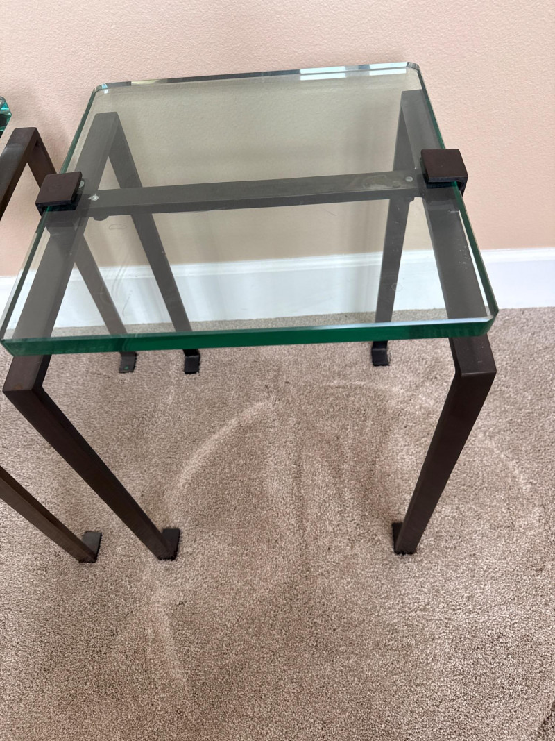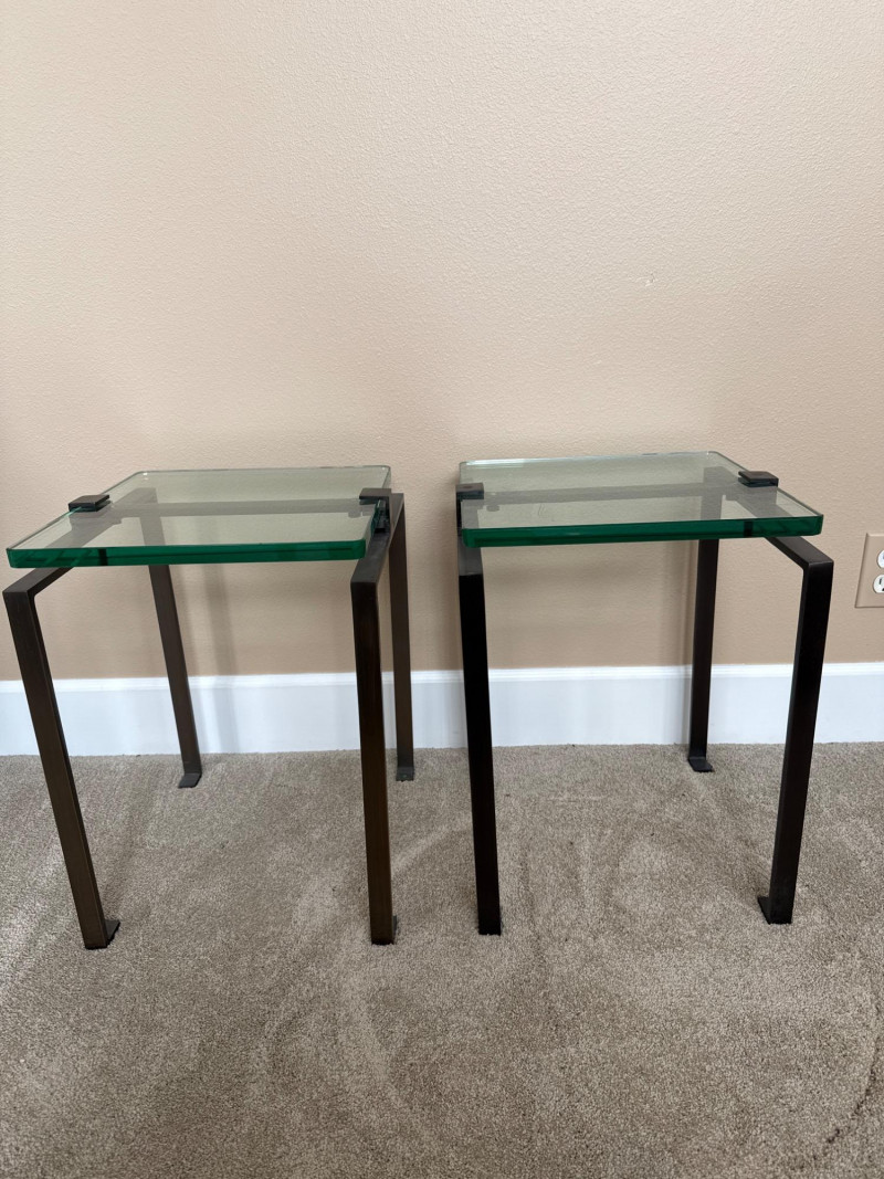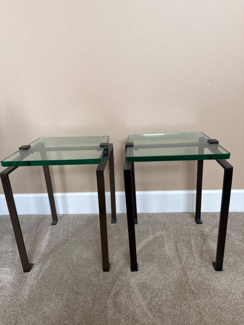 Pair of Trendy Highend Glass End Tables Set of two end tables with super thick square glass tops mounted on black metal frames. Each table features exposed corner brackets and a modern open-leg design. Measurements:
