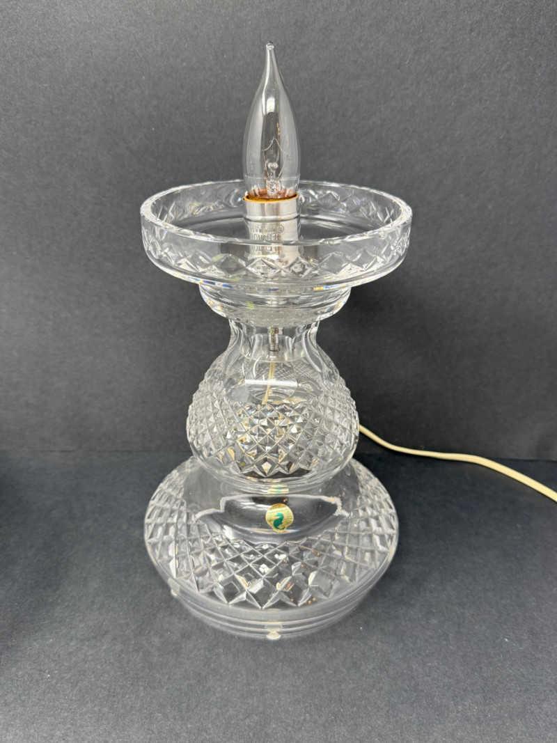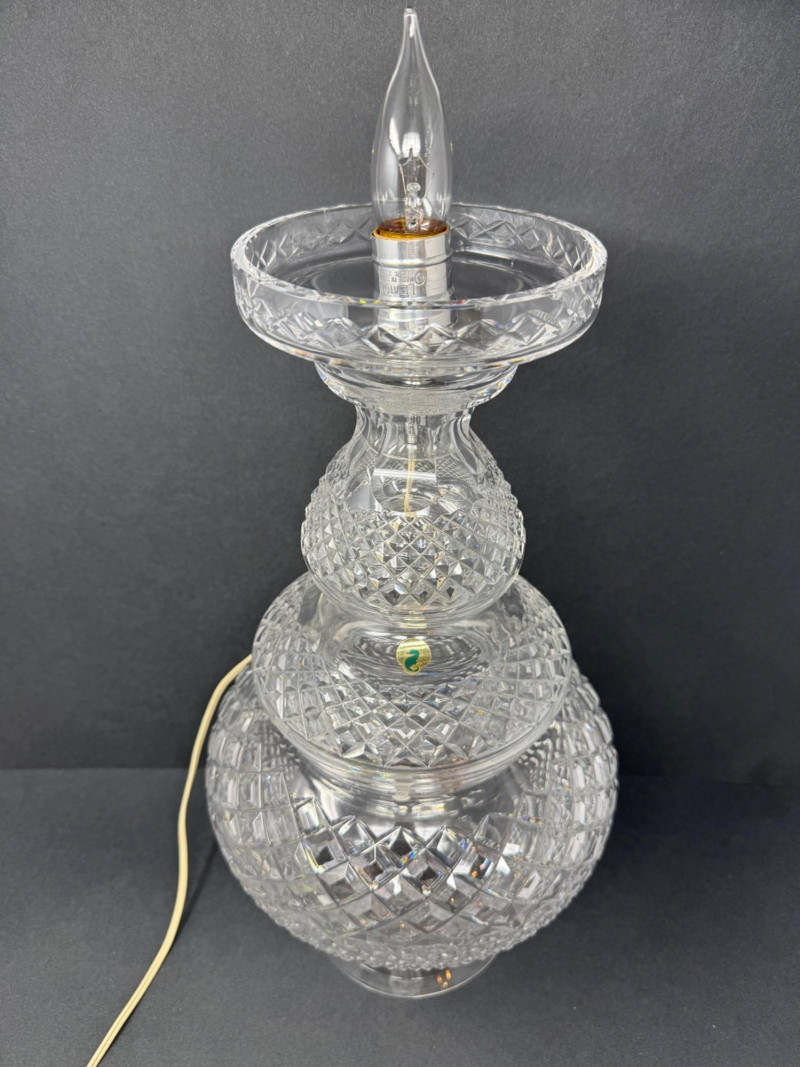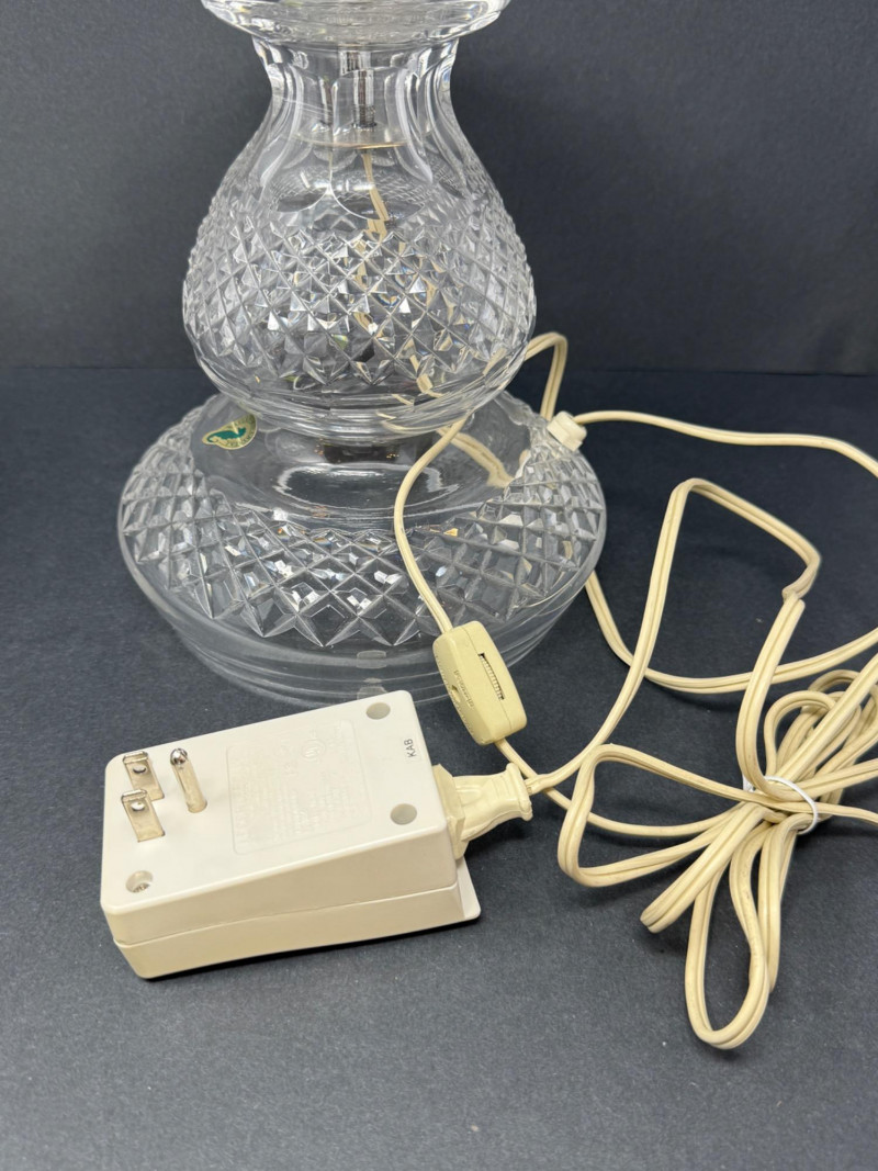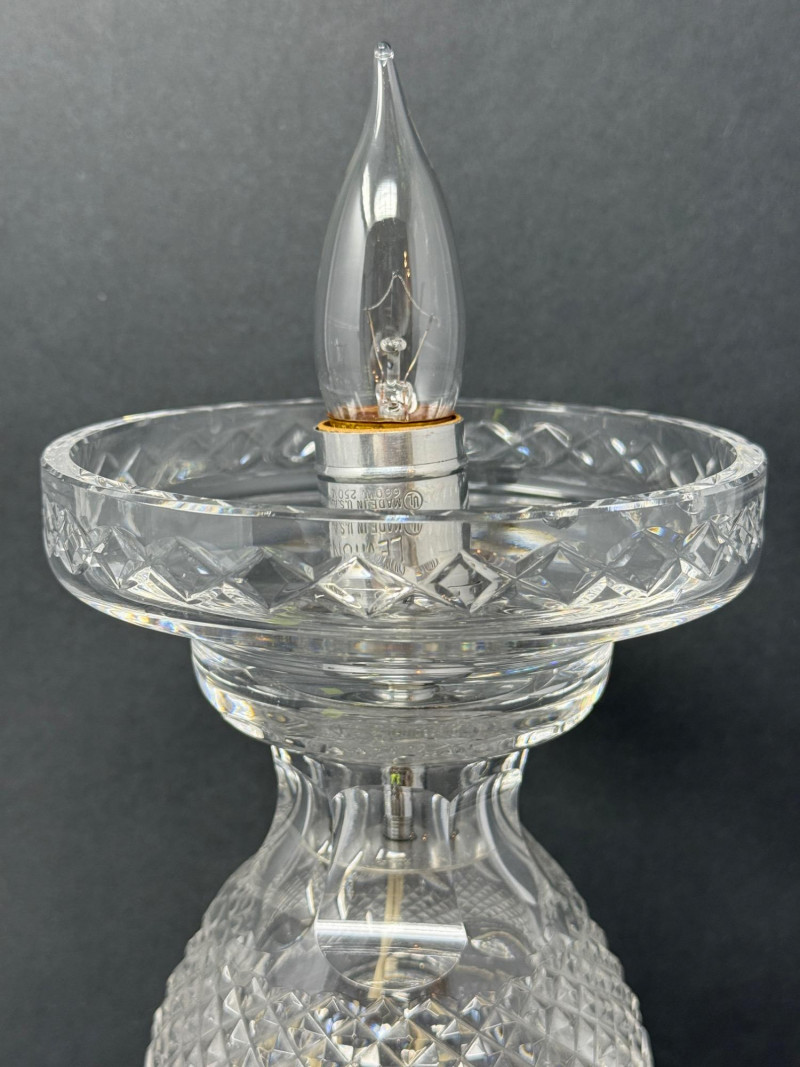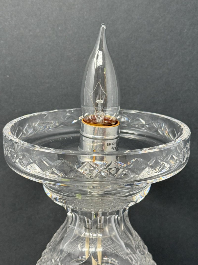 Waterford Crystal Electric Hurricane Lamp Electric hurricane lamp with clear cut Waterford crystal base and matching shade. The lamp features a bulb holder with a faux flame-style bulb. The crystal showcases Waterford's signature crosshatched diamond pattern, with rounded contours on both the base and shade. Original sticker still present on the base. Sold as one complete assembled unit. Measurements: