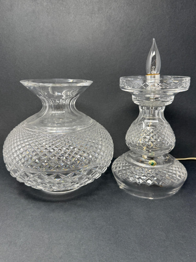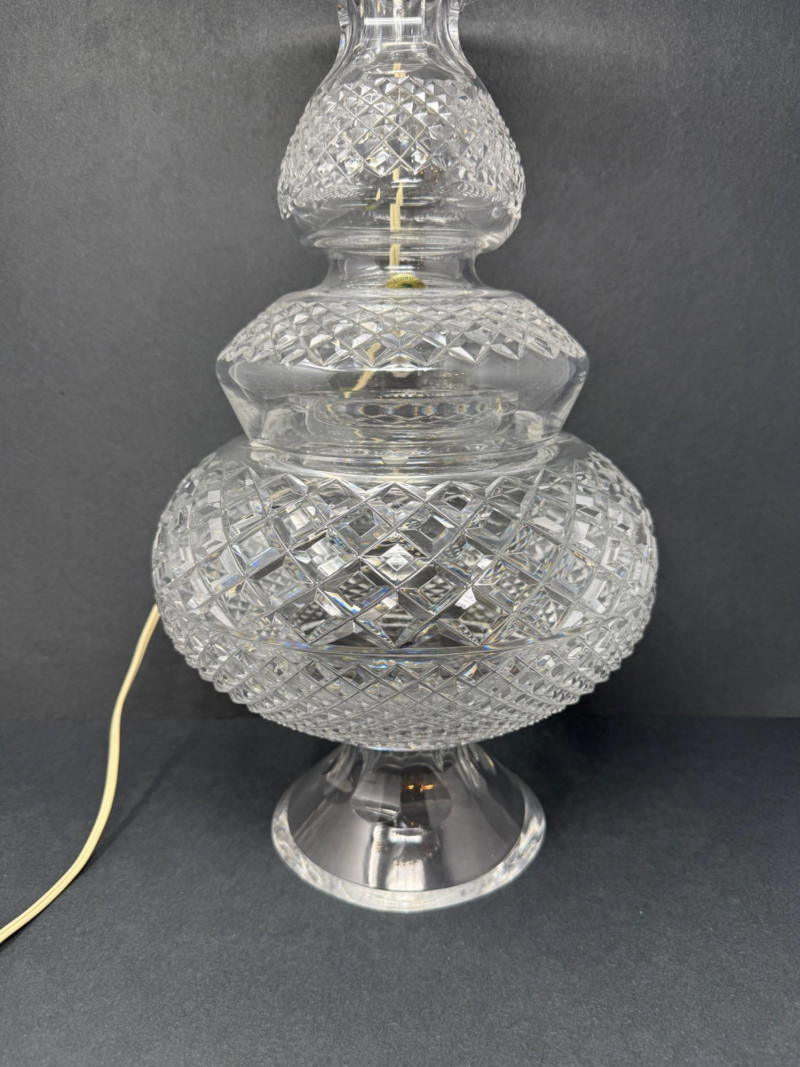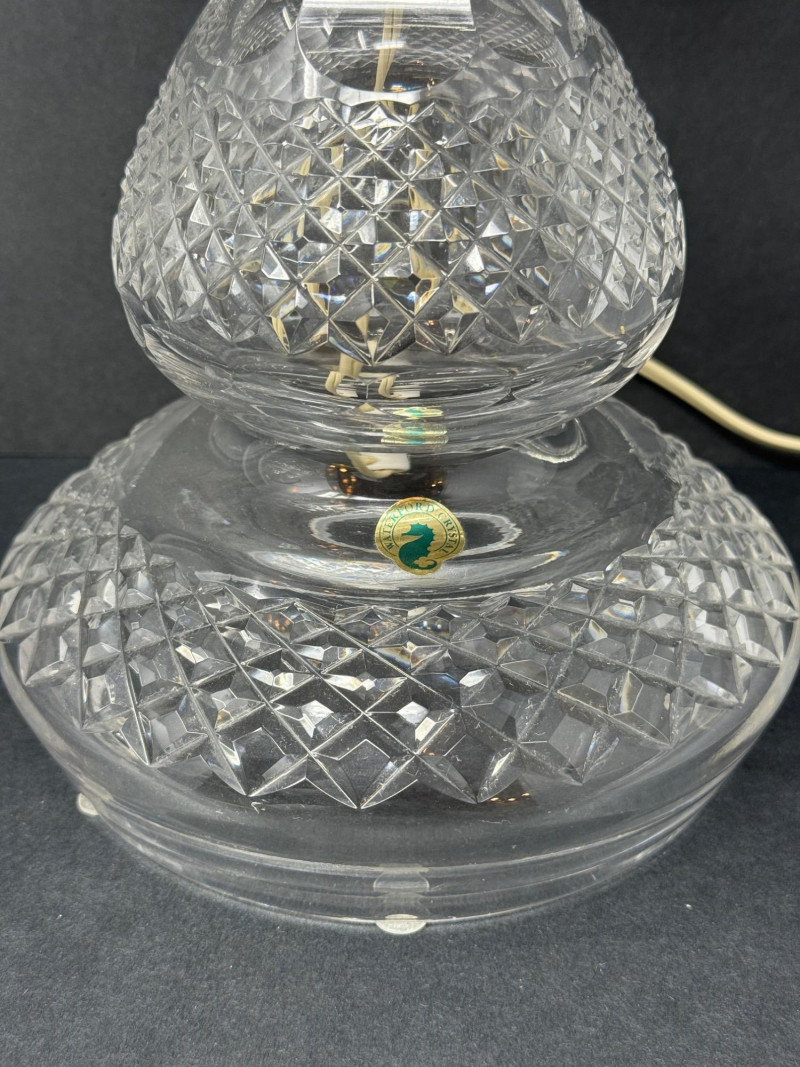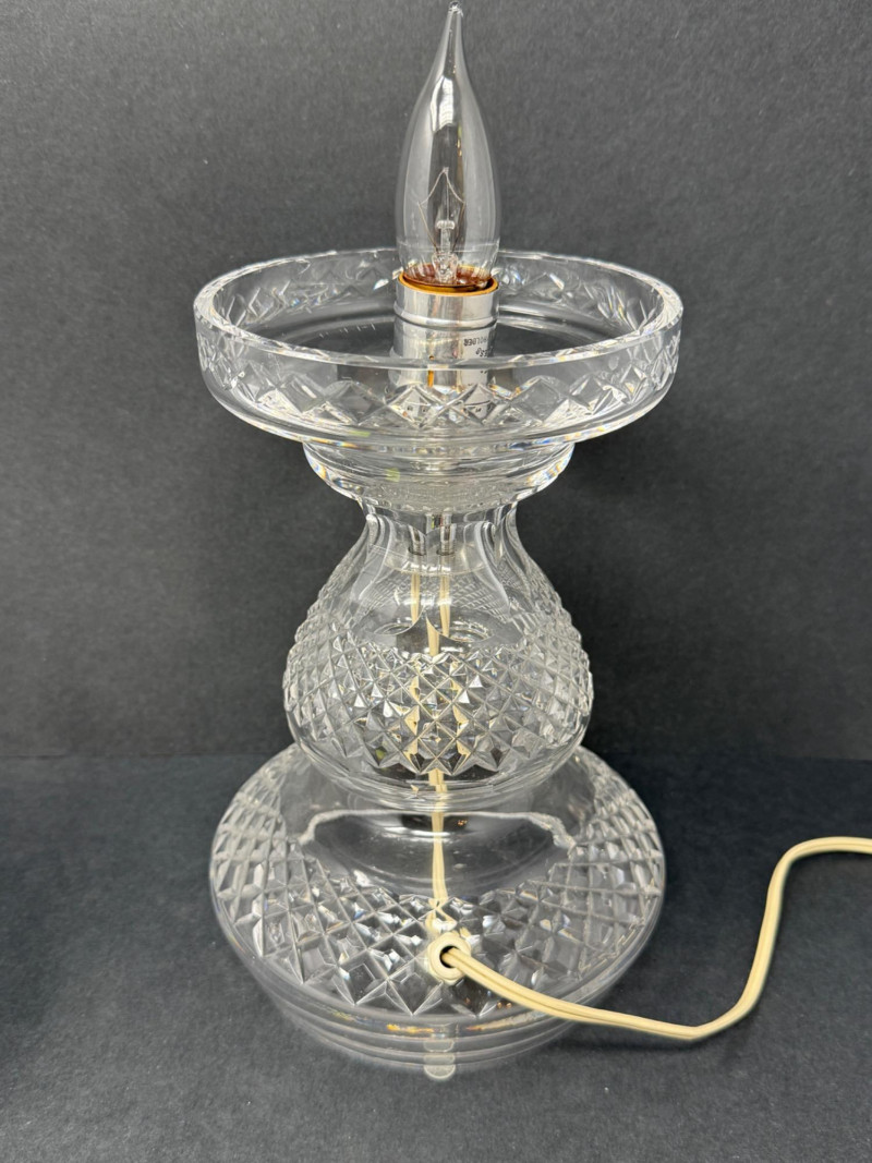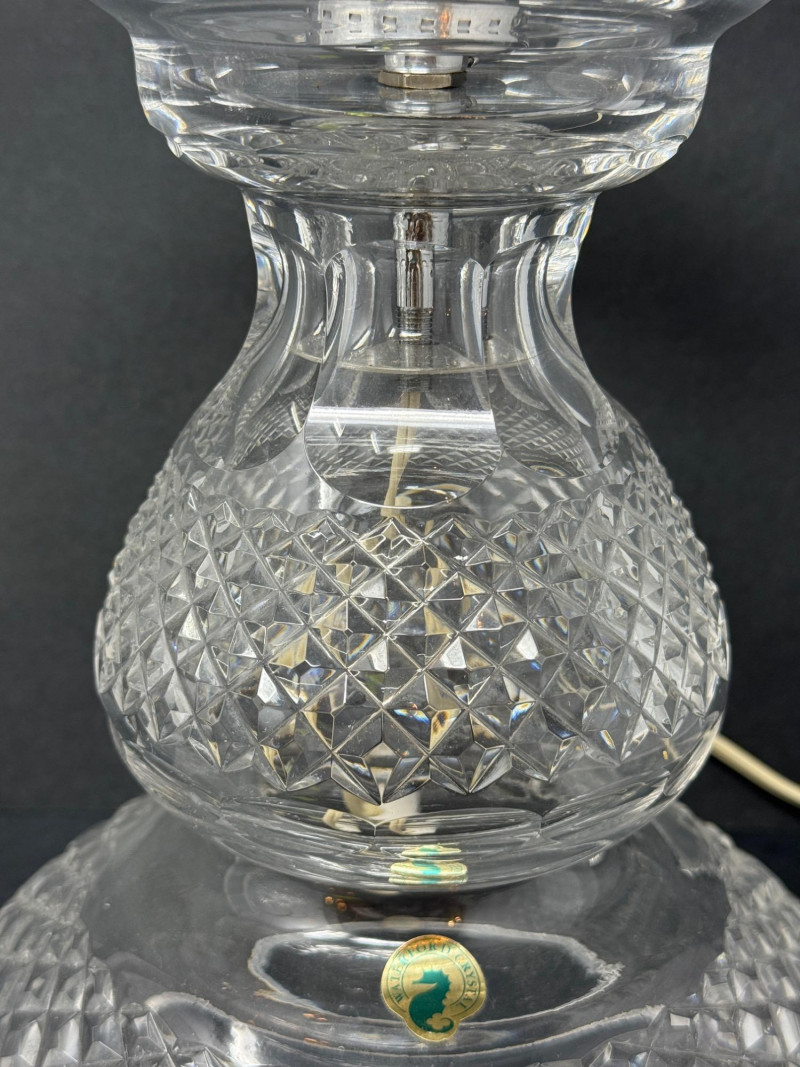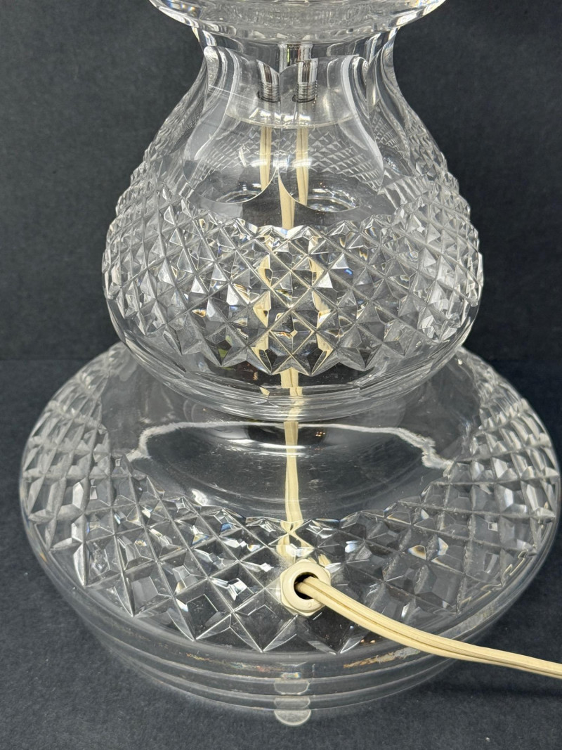 Waterford Crystal Electric Hurricane Lamp Electric hurricane lamp with clear cut Waterford crystal base and matching shade. The lamp features a bulb holder with a faux flame-style bulb. The crystal showcases Waterford's signature crosshatched diamond pattern, with rounded contours on both the base and shade. Original sticker still present on the base. Sold as one complete assembled unit. Measurements: