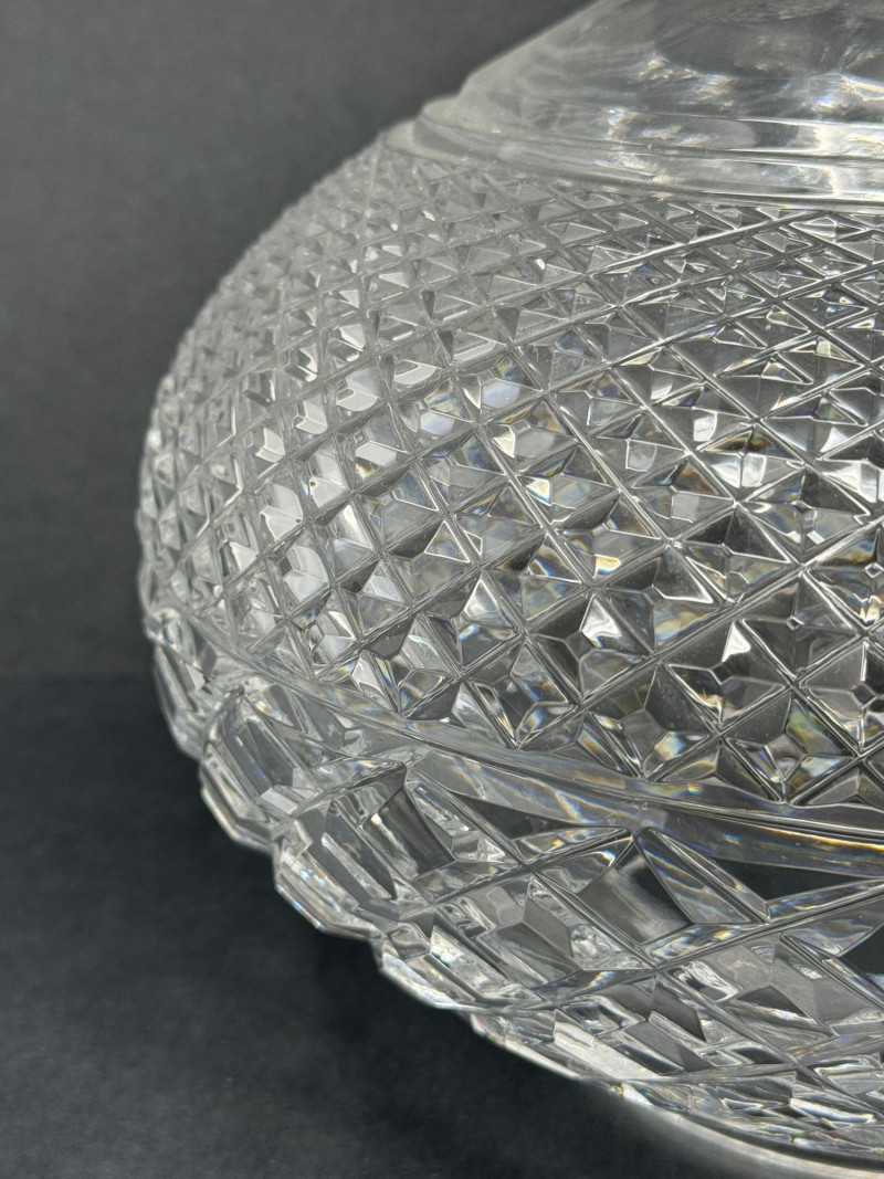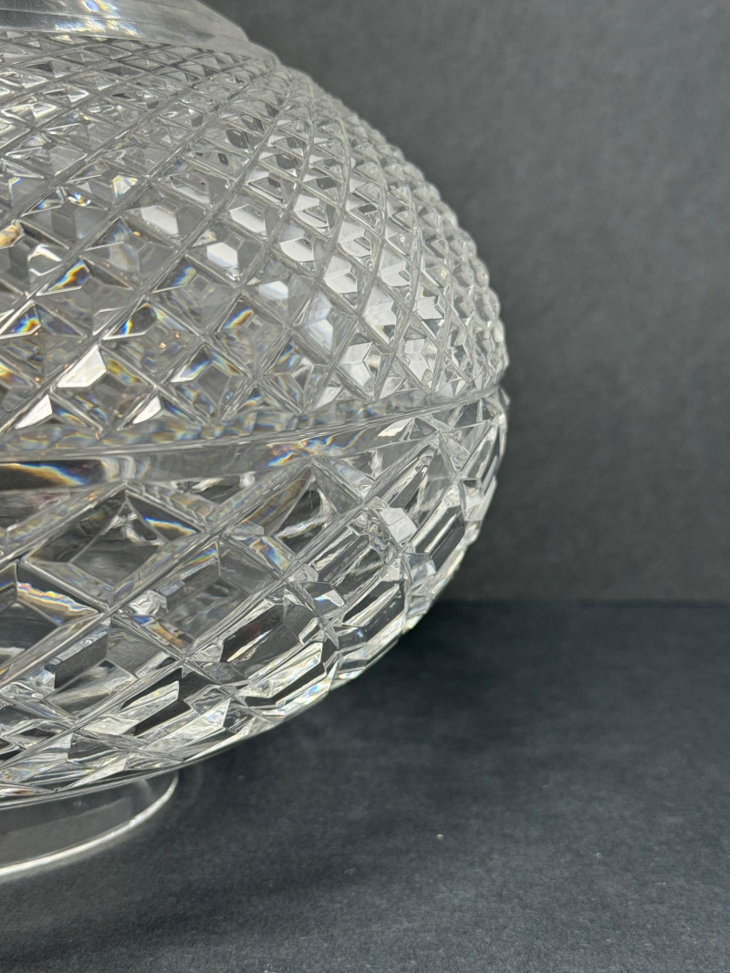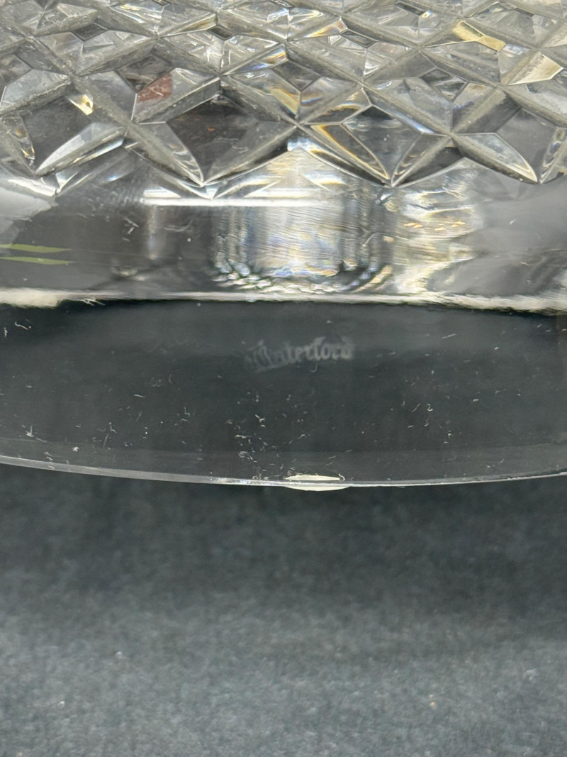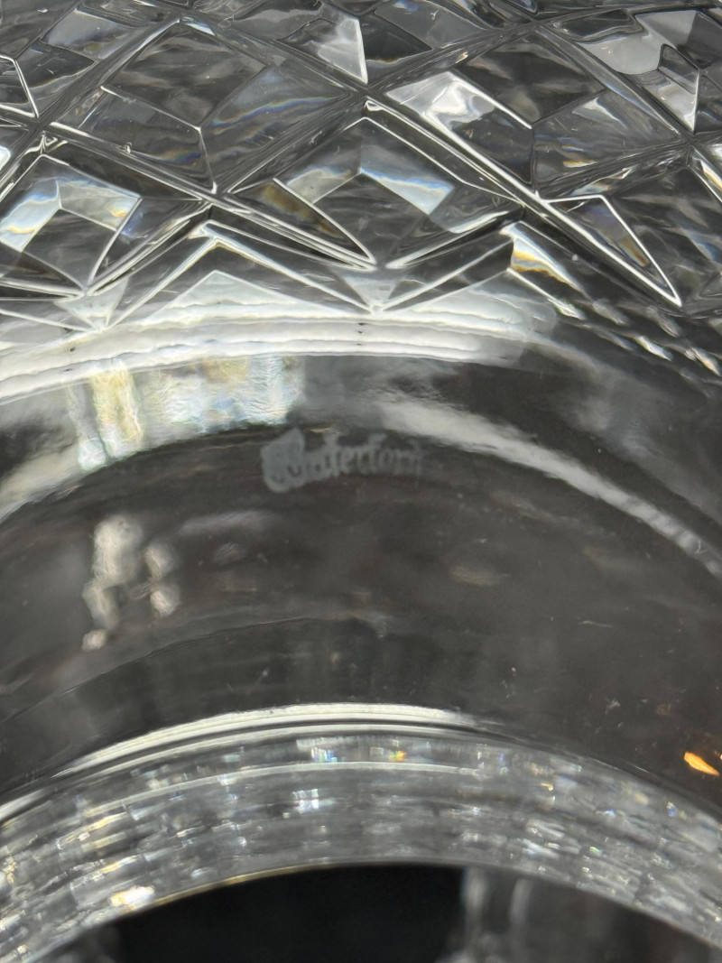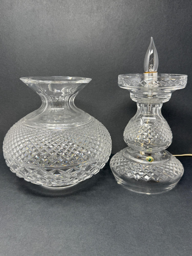 Waterford Crystal Electric Hurricane Lamp Electric hurricane lamp with clear cut Waterford crystal base and matching shade. The lamp features a bulb holder with a faux flame-style bulb. The crystal showcases Waterford's signature crosshatched diamond pattern, with rounded contours on both the base and shade. Original sticker still present on the base. Sold as one complete assembled unit. Measurements: