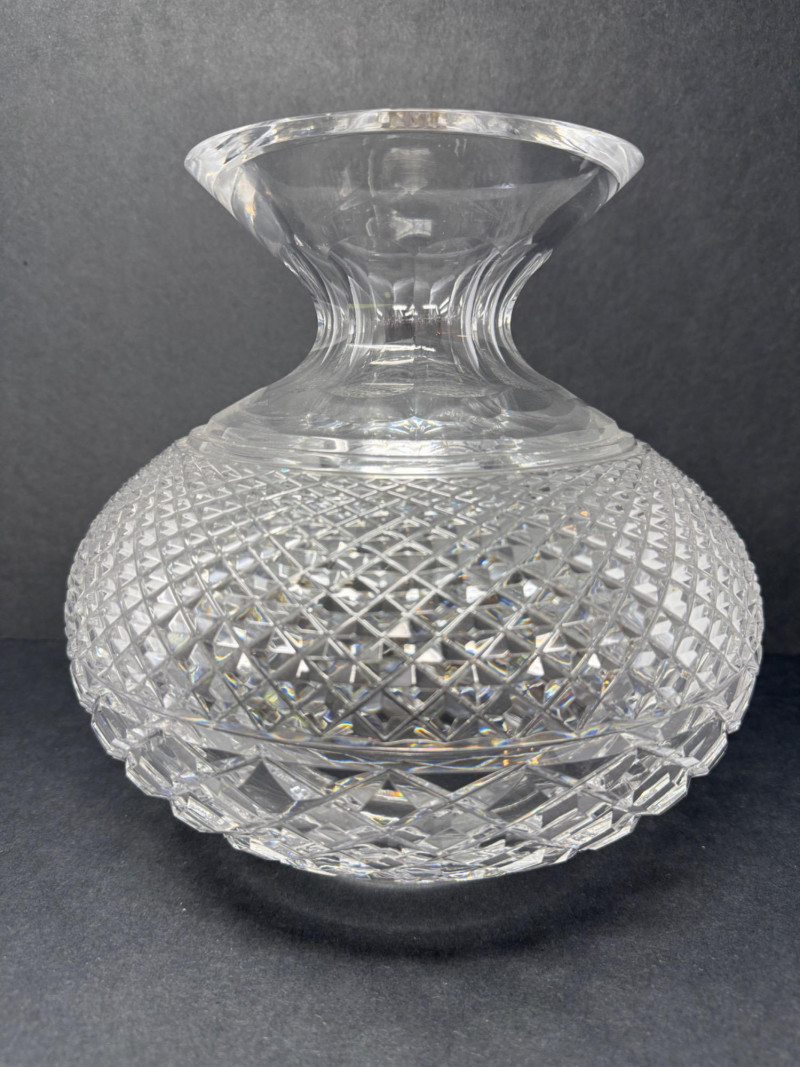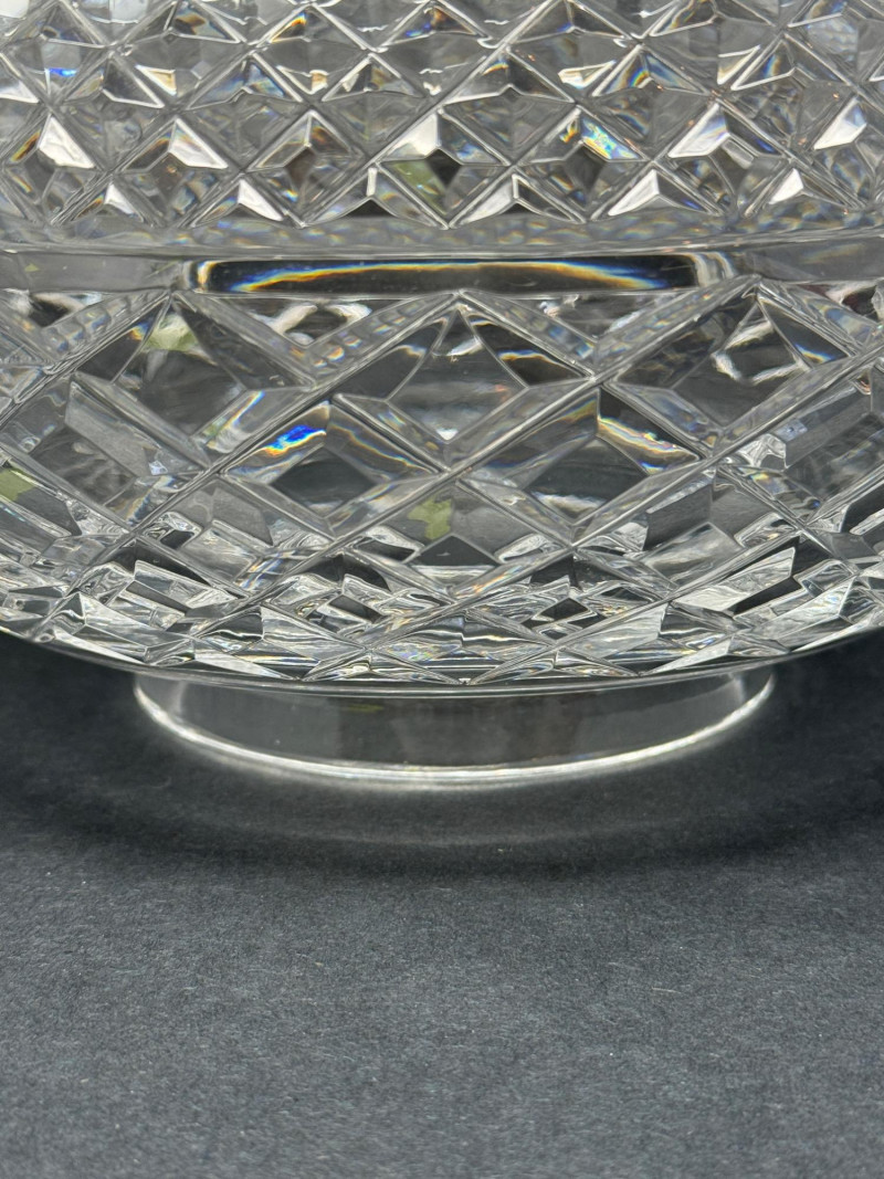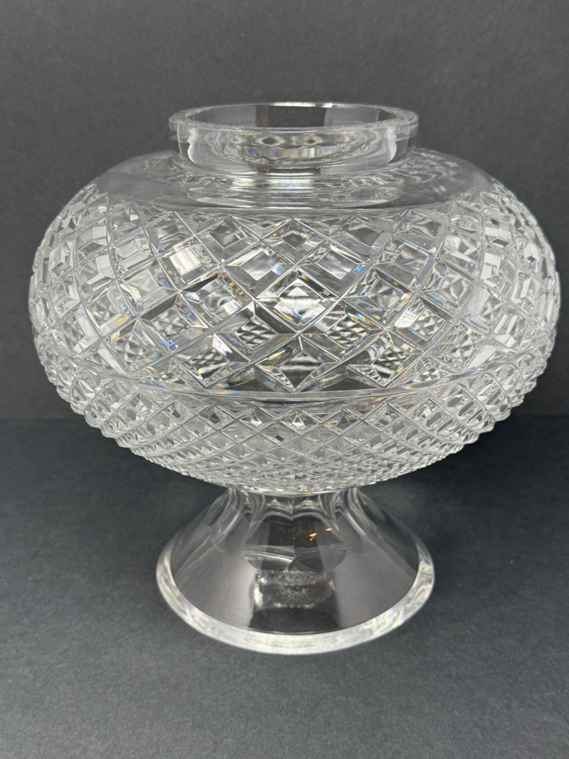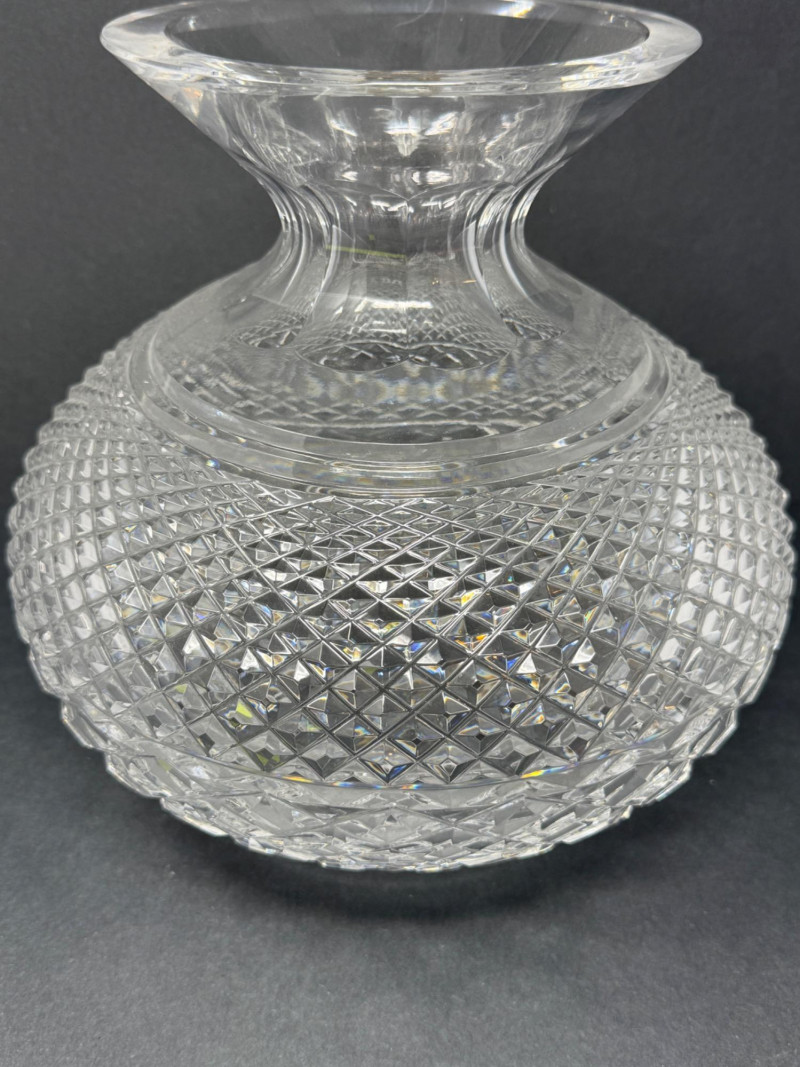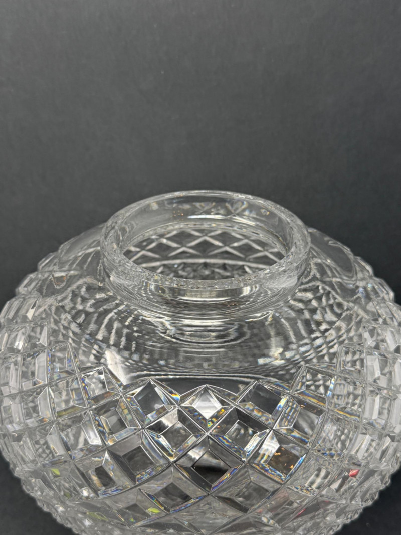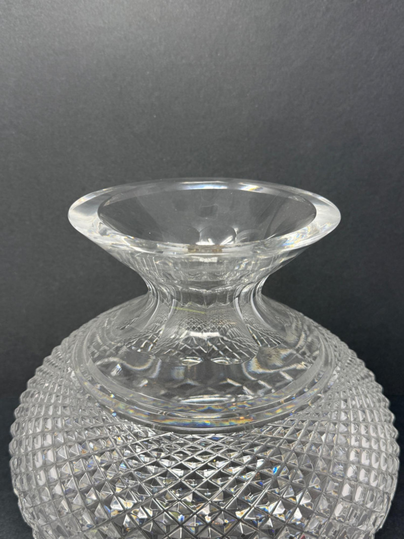 Waterford Crystal Electric Hurricane Lamp Electric hurricane lamp with clear cut Waterford crystal base and matching shade. The lamp features a bulb holder with a faux flame-style bulb. The crystal showcases Waterford's signature crosshatched diamond pattern, with rounded contours on both the base and shade. Original sticker still present on the base. Sold as one complete assembled unit. Measurements: