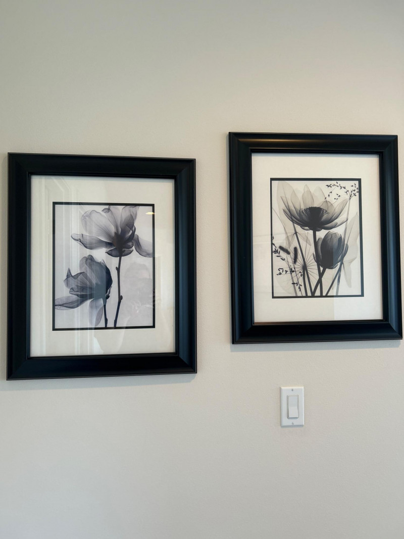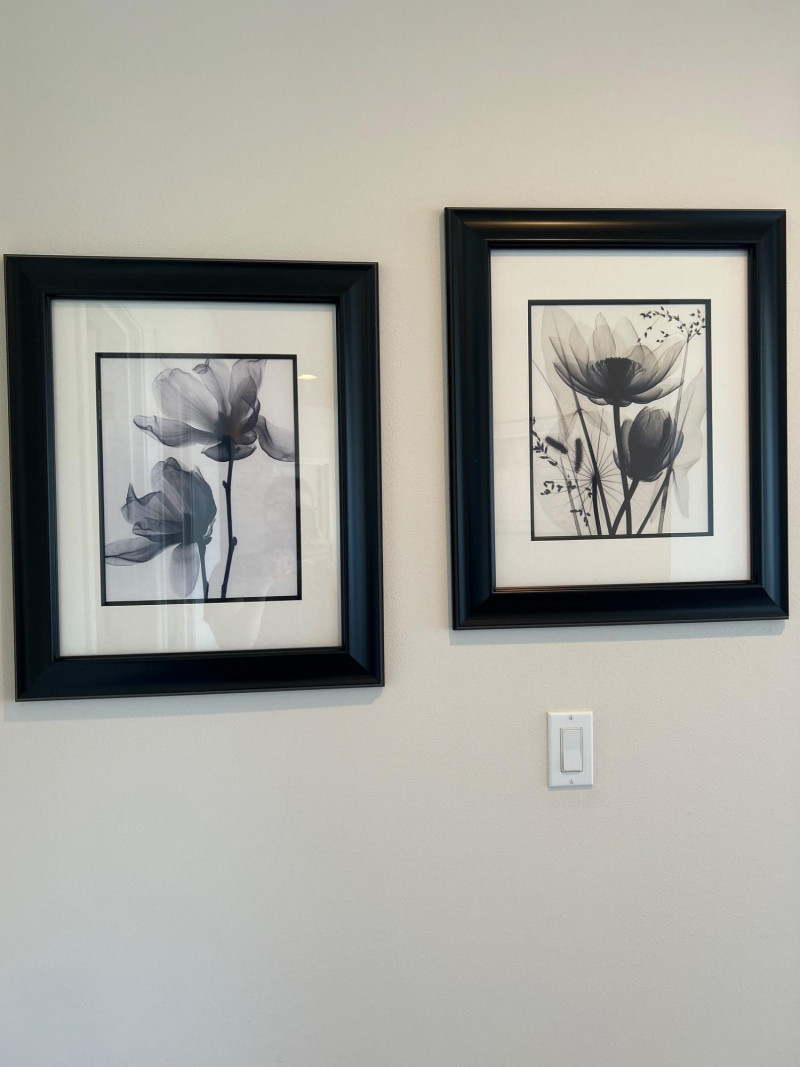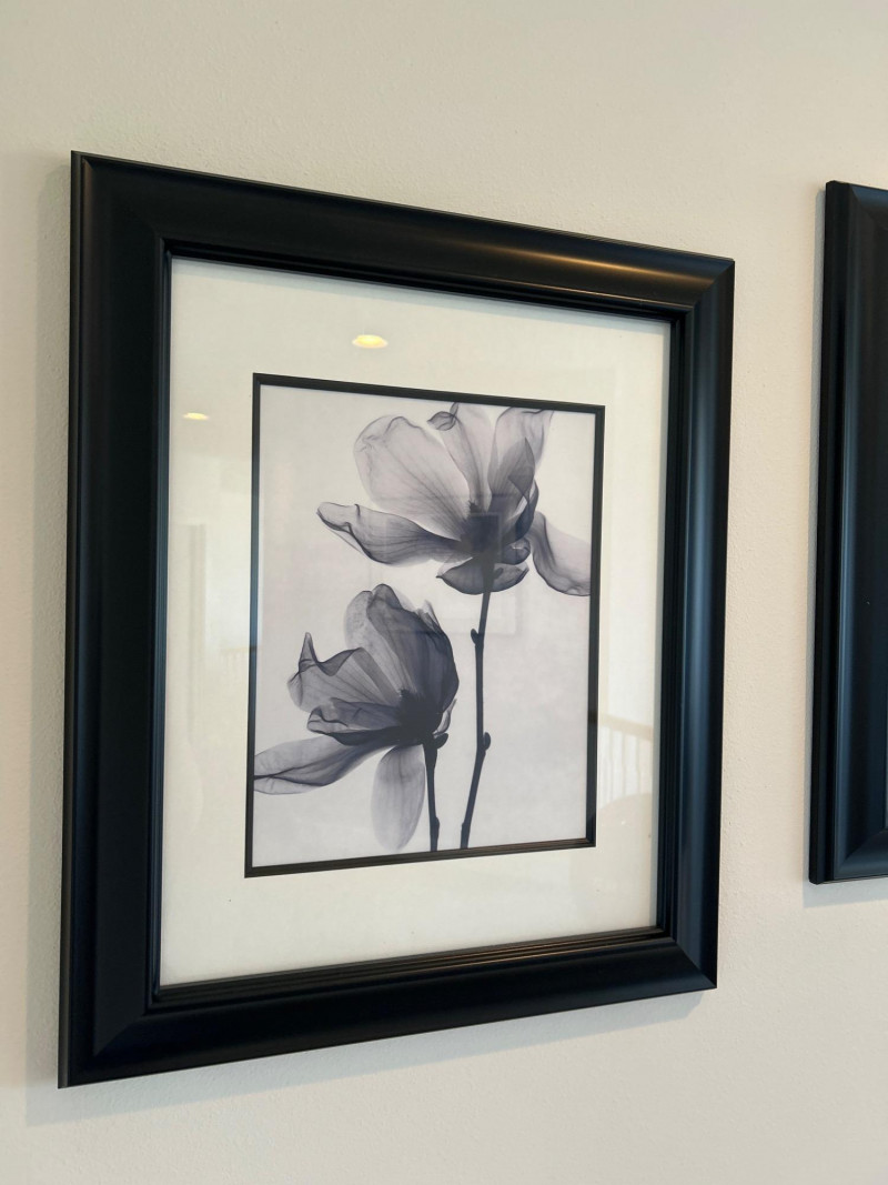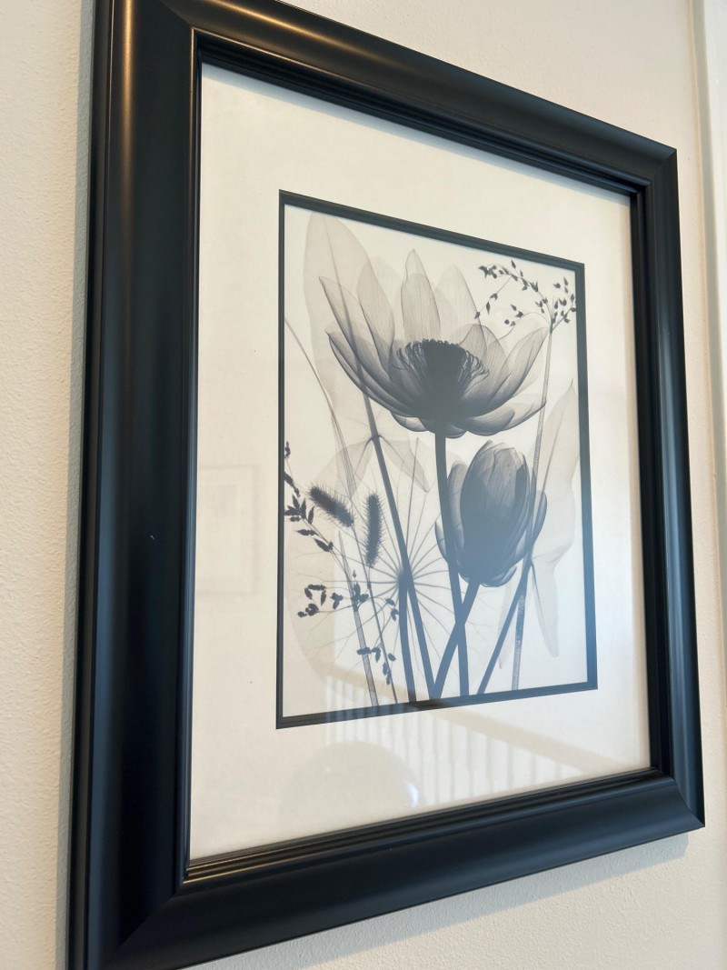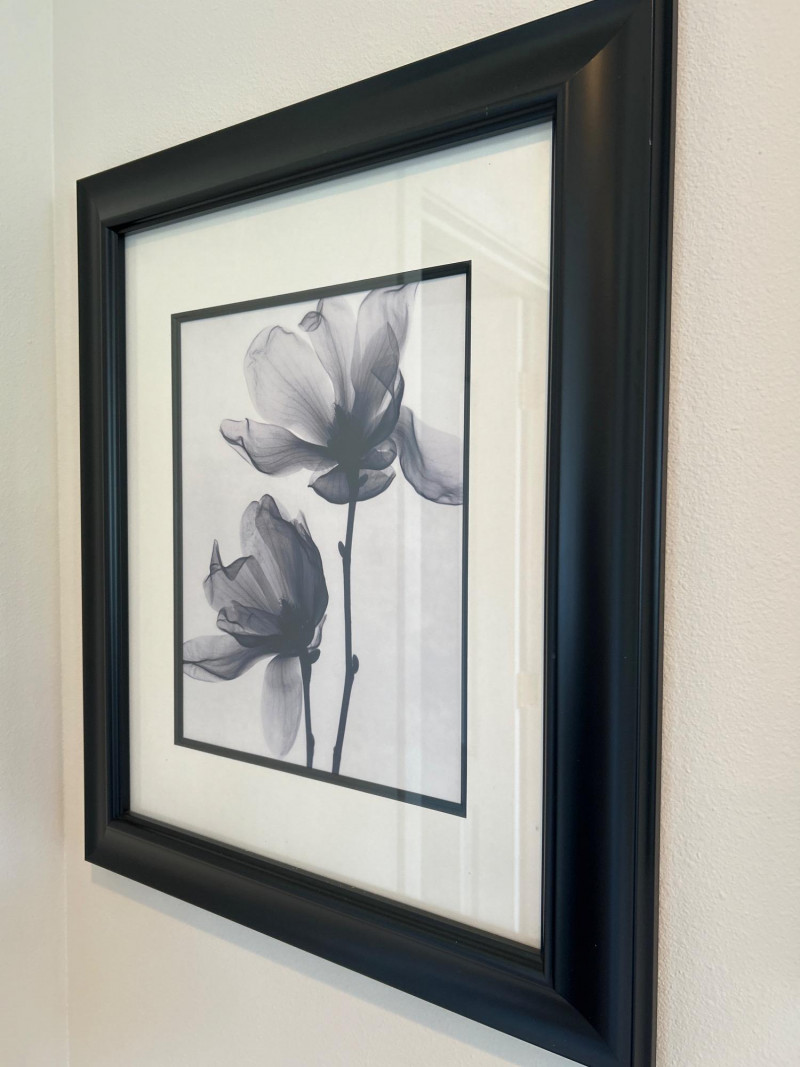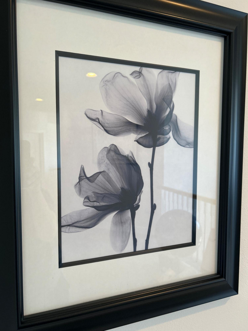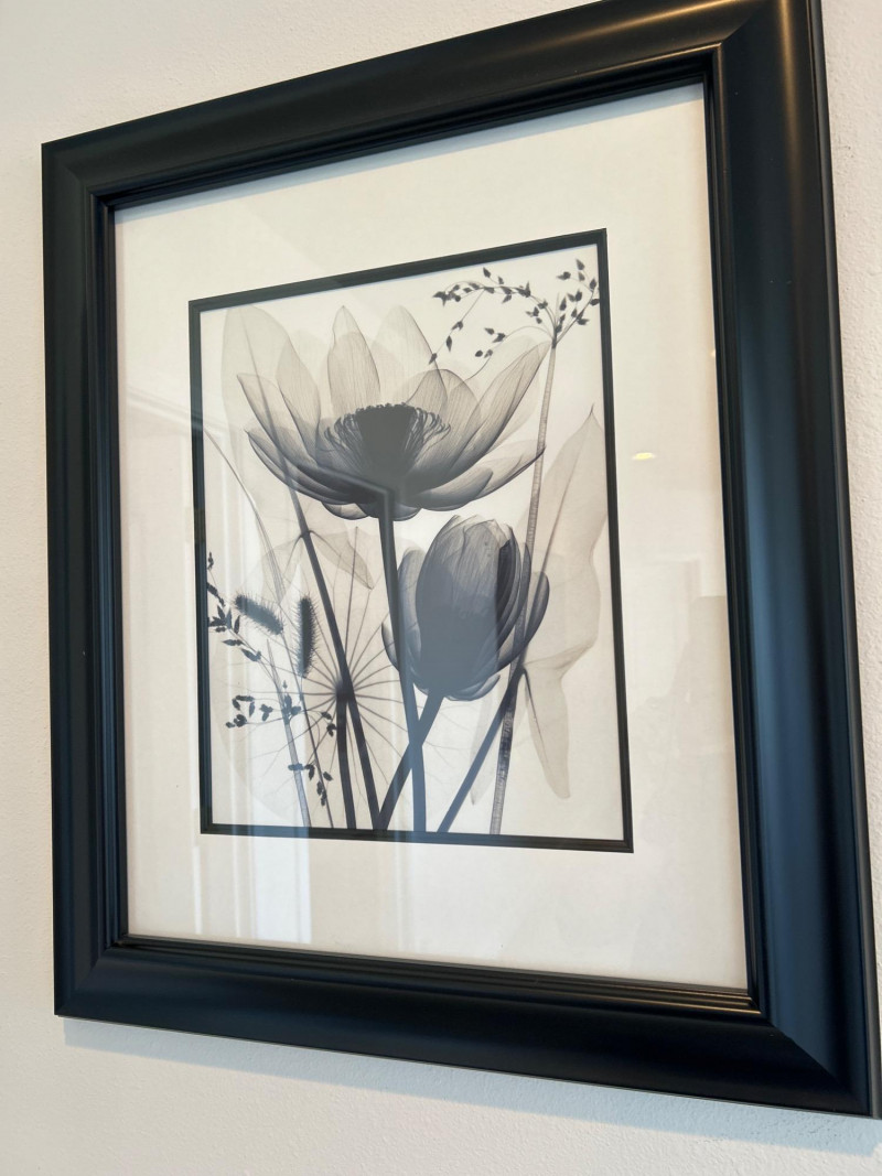 Black and White Framed/Matted Floral Prints Set of two black and white floral art prints. Each piece features translucent botanical imagery in grayscale tones. The prints are double-matted with a white outer mat and black inner mat, and set in black wood frames with a beveled edge. Measurements (each):