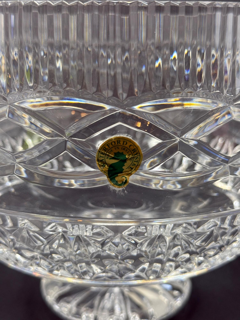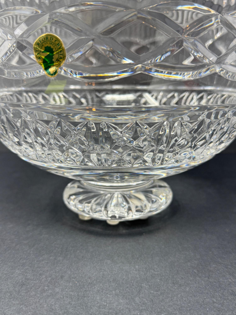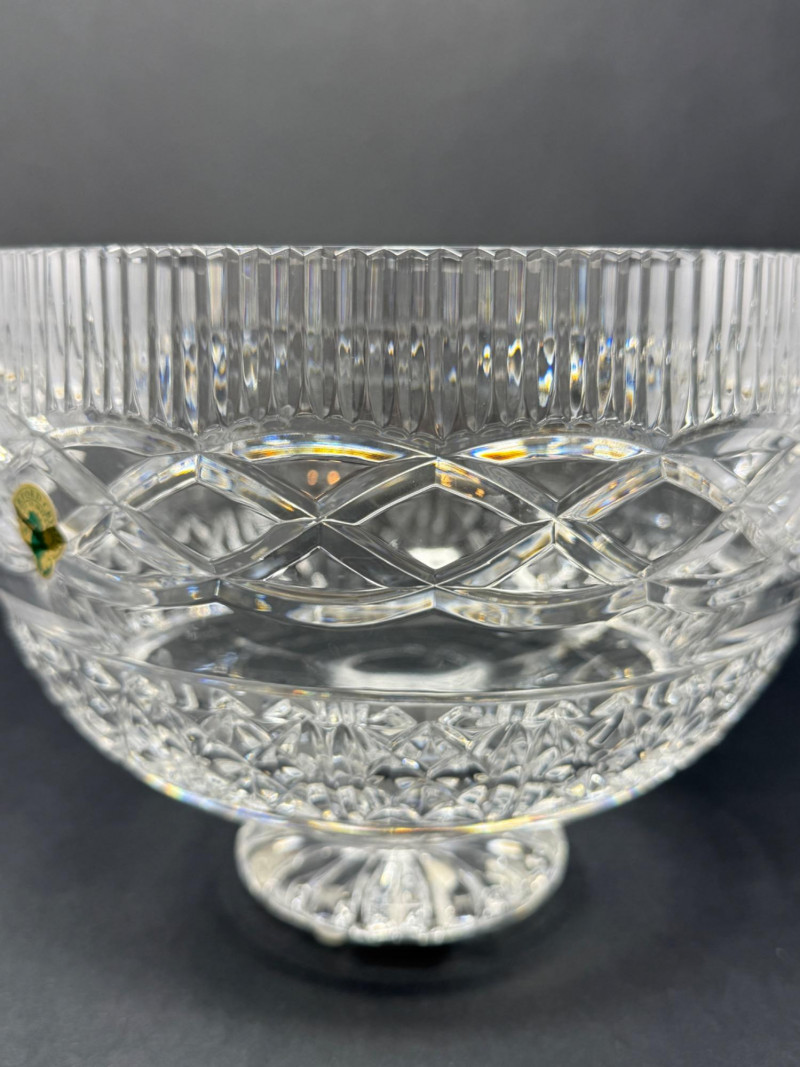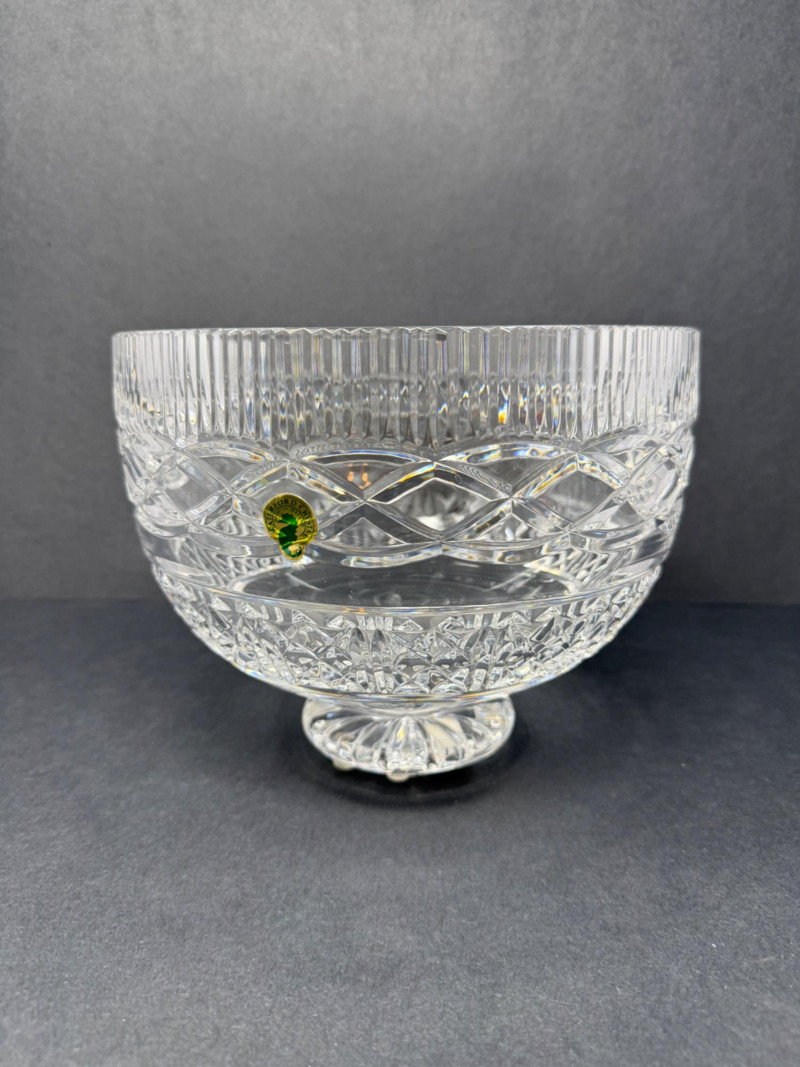 Waterford "Book of Kells" Footed Crystal Bowl Footed crystal bowl by Waterford, featuring the "Book of Kells" pattern with vertical cuts, crisscross design, and diamond motifs. Retains original green and gold foil sticker. Made in Ireland. Measurements: