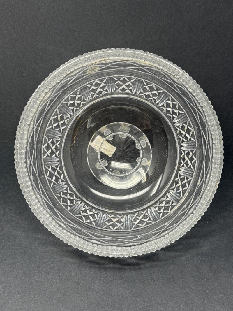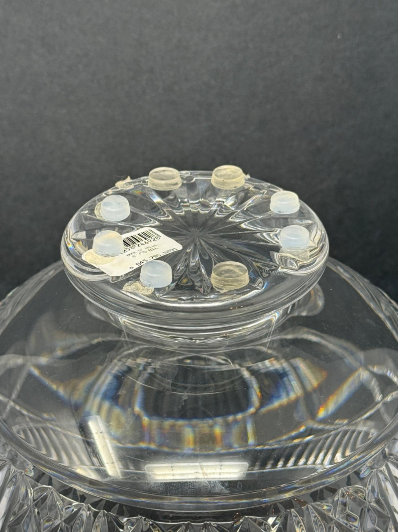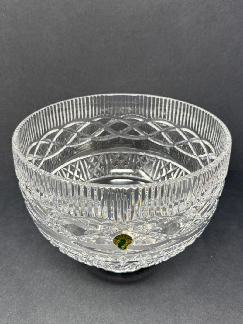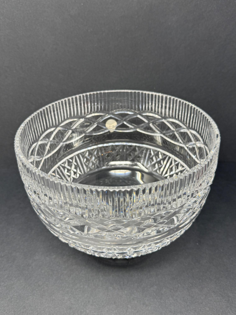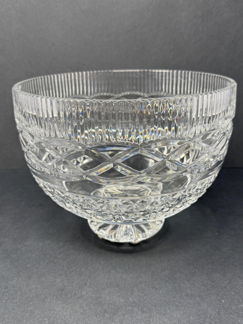 Waterford "Book of Kells" Footed Crystal Bowl Footed crystal bowl by Waterford, featuring the "Book of Kells" pattern with vertical cuts, crisscross design, and diamond motifs. Retains original green and gold foil sticker. Made in Ireland. Measurements: