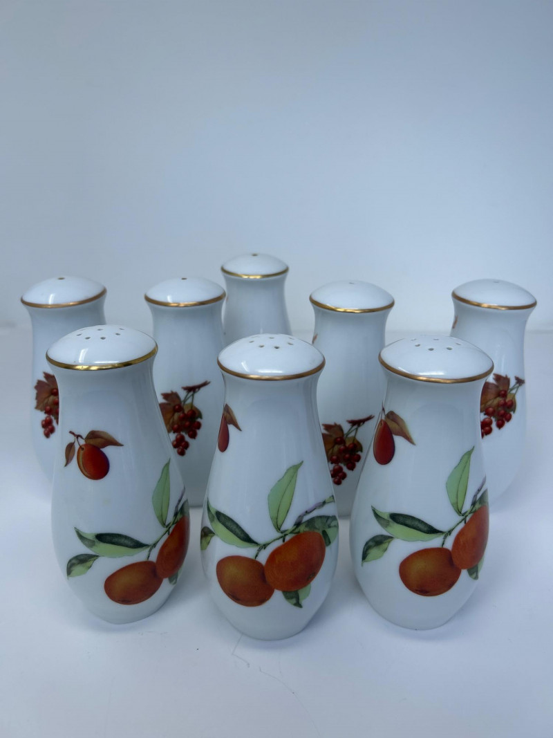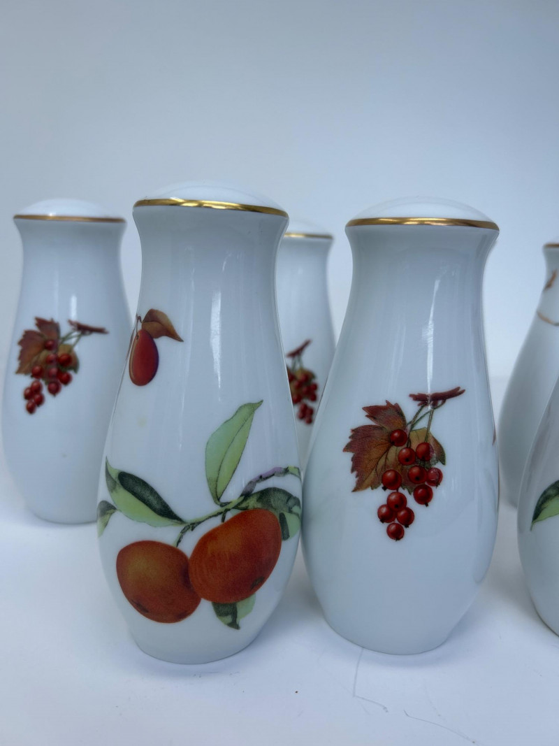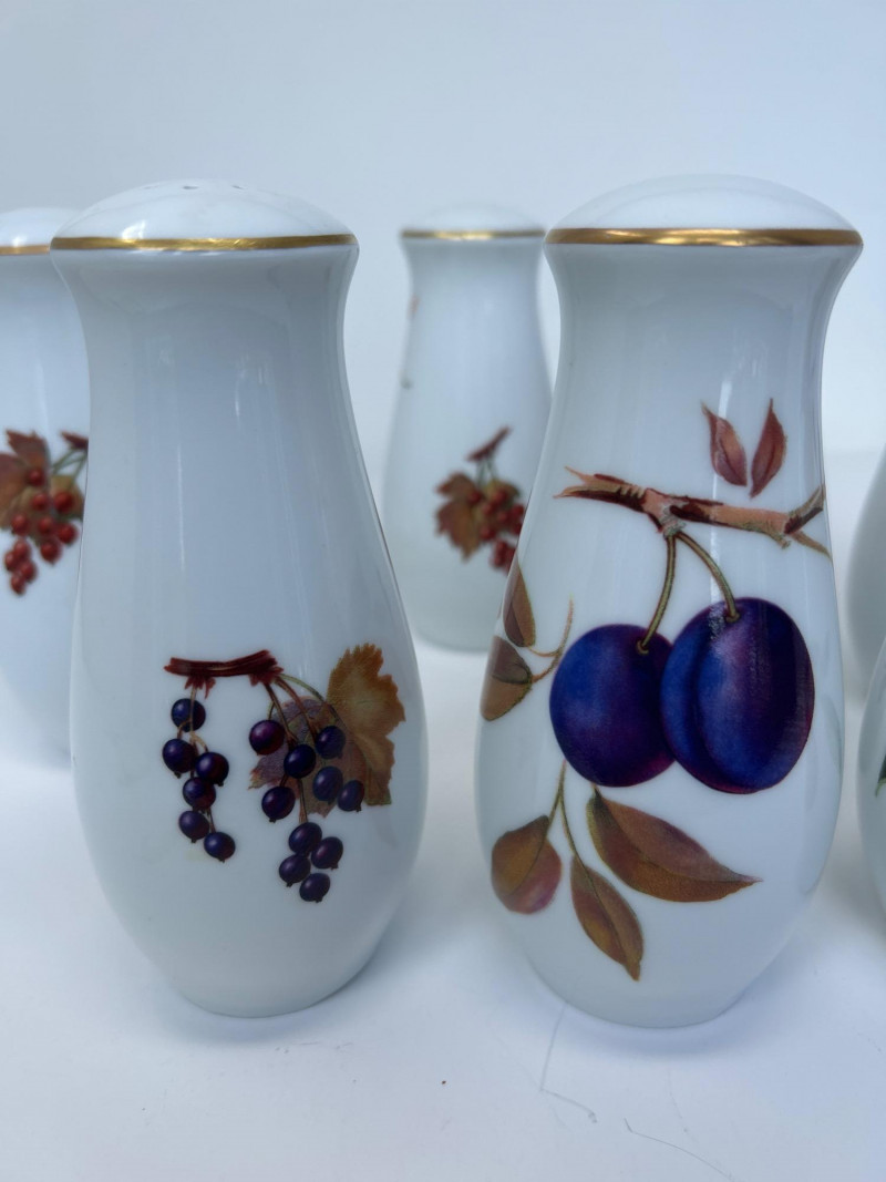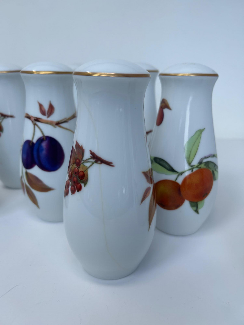 Royal Worcester Evesham Gold Oversized Salt & Pepper Shakers Evesham Gold edge fine porcelain salt and pepper shakers by Royal Worcester. Oversized form with fruit motifs and gold trim. Set includes 5 pepper shakers and 3 salt shakers Height: 6 inches Two shakers missing stoppers One shaker has a vertical mark (see last photo)